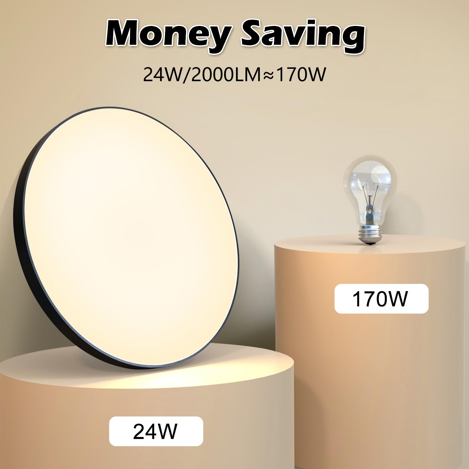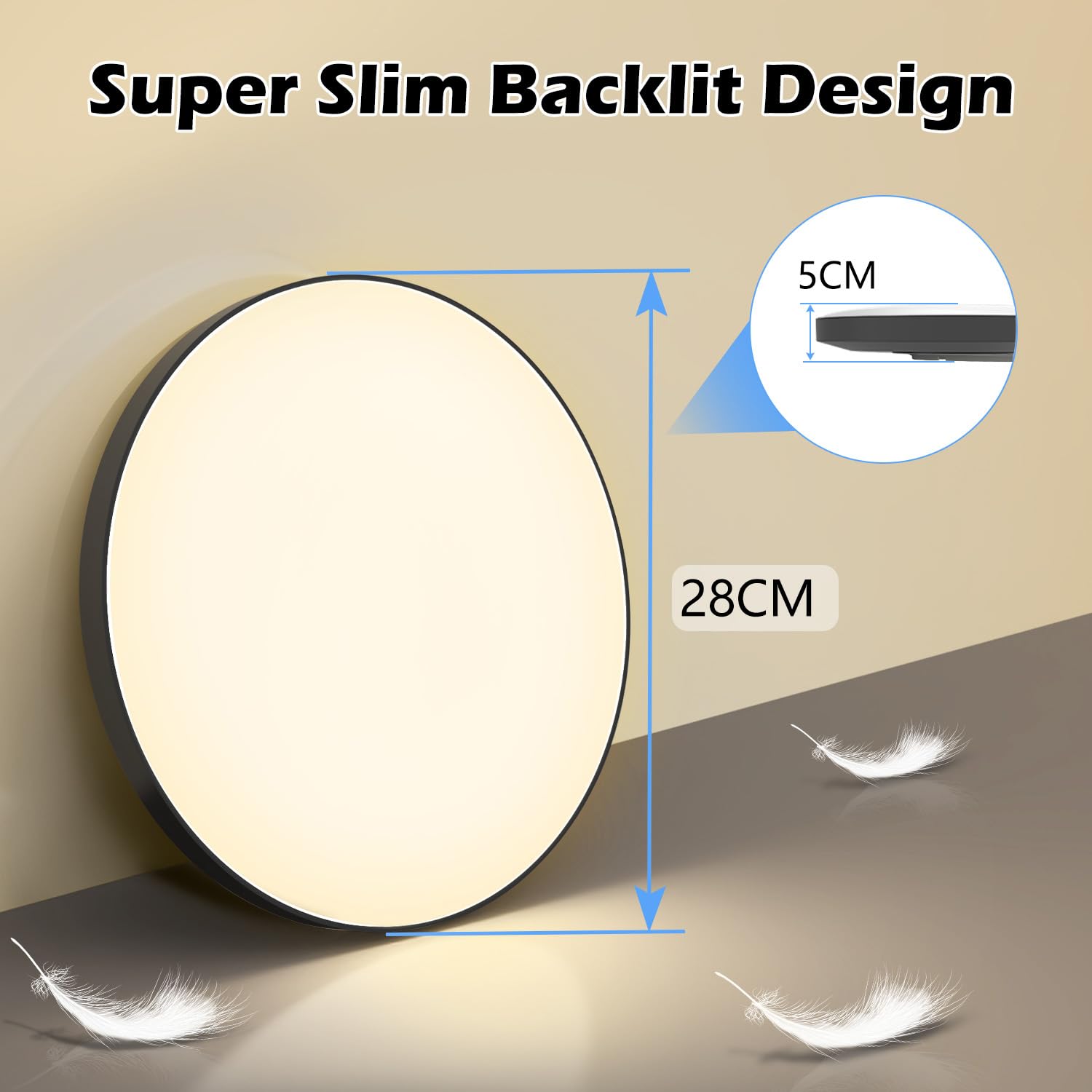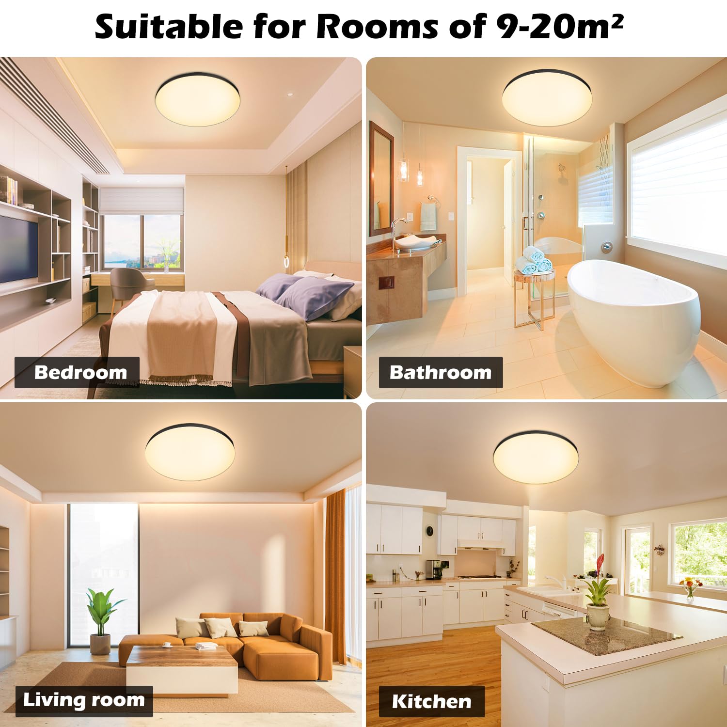 Warum wählen Sie unsere Platte? Einfach zu installieren. Unsere LED-Deckenleuchte verwendet eine speziell entwickelte Deckenplatte, die schnell mit einem Schraubendreher installiert werden kann. Tipps: Nur mit normalen Wandschaltern zum Ein- und Ausschalten. Breite Anwendung: Unsere runde LED-Deckenleuchte IP44 ist geeignet für Badezimmer, Schlafzimmer, Wohnzimmer, Kinderzimmer, Küche, Eingang, Treppe, Balkon, Keller usw. Sichereres Gehäuse. Unsere Decke verwendet einen hochwertigen, feuerfesten Kunststoff-Lampenkörper, der stossfest, vibrations- und isolierend ist und jegliche Gefahr eines Stromschlags, eines elektrischen Lecks oder sogar möglichen Katastrophen durch Kurzschlüsse verhindert. Dies schützt die Sicherheit Ihrer Familie. Super hell und energieeffizient. Diese 24W LED Deckenleuchte mit 2000 Lumen entspricht einer herkömmlichen 174W Glühlampe und spart über 90% Stromkosten. Sparen Sie Energie, sparen Sie Geld. Augenschutz: Unsere LED-Deckenleuchte hat eine höhere Lichtdurchlässigkeit, das Licht wird gleichmässig und sanft im Raum verteilt, was ein angenehmes und nicht blendendes Licht bietet, schützt die Augen vor hellem Licht. 【Hoher Farbwiedergabeindex】Die LED-Deckenleuchten haben einen CRI80+ Index. Hoher Farbwiedergabeindex für helles und natürliches Licht. Ultradünnes Aussehen, nur 4,4 cm dick, einfaches und elegantes Aussehen. Geeignet für Räume von 9 bis 12 Quadratmetern