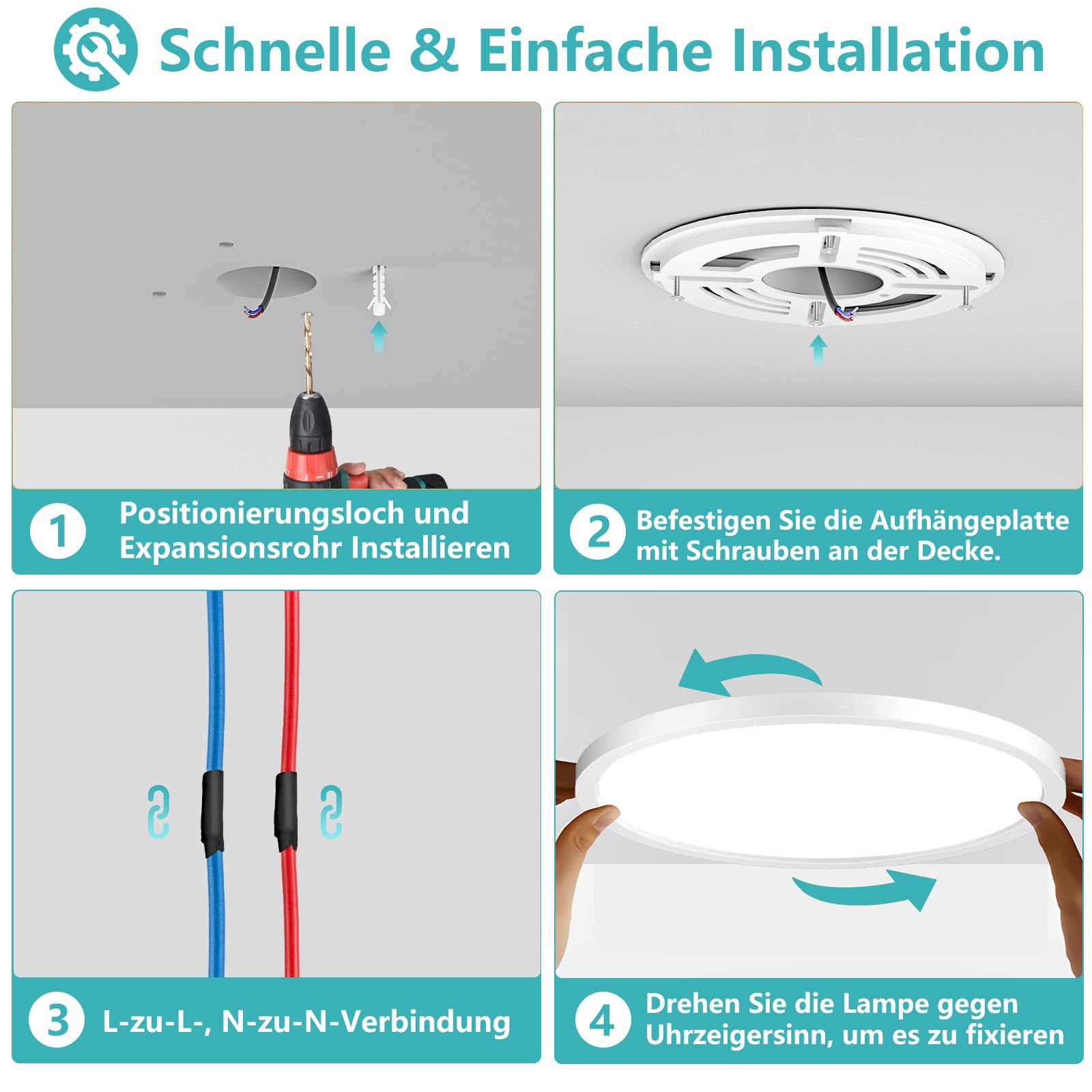 Das humanisierte Sockeldesign macht ihn zu der universellen Mordern Runde Led Deckenlampe, die zu 99 % Anschlussdosen passt. Einfach auf die Montageschiene schieben und sofort funktionsfähig. Brauchen keine Hilfe vom Elektriker. Es wird auch sehr bequem für eine Person die LED Deckenlampe mit mitgelieferten Zubehörteilen unabhängig zu installieren.