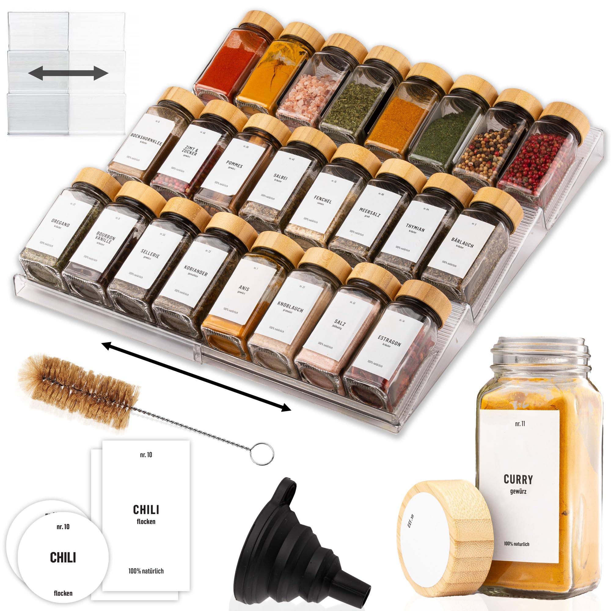 Deco haus® Gewürzregal Schublade [MIT 24 GEWÜRZGLÄSER & ETIKETTEN] - Gewürze Organizer - Gewürzeinsatz Schublade - Gewürzschublade Organizer mit Gläser - Schubladeneinsatz Gewürze
