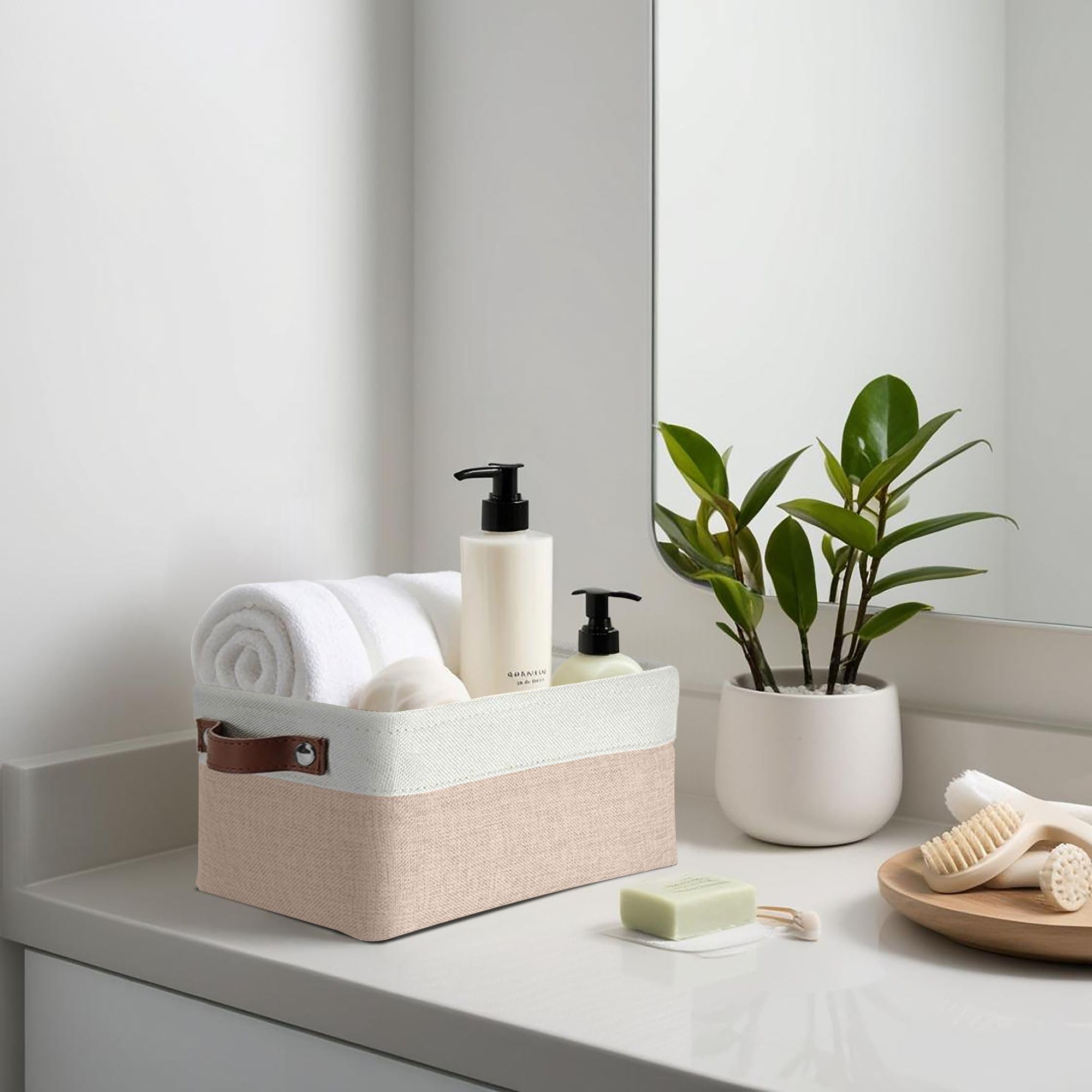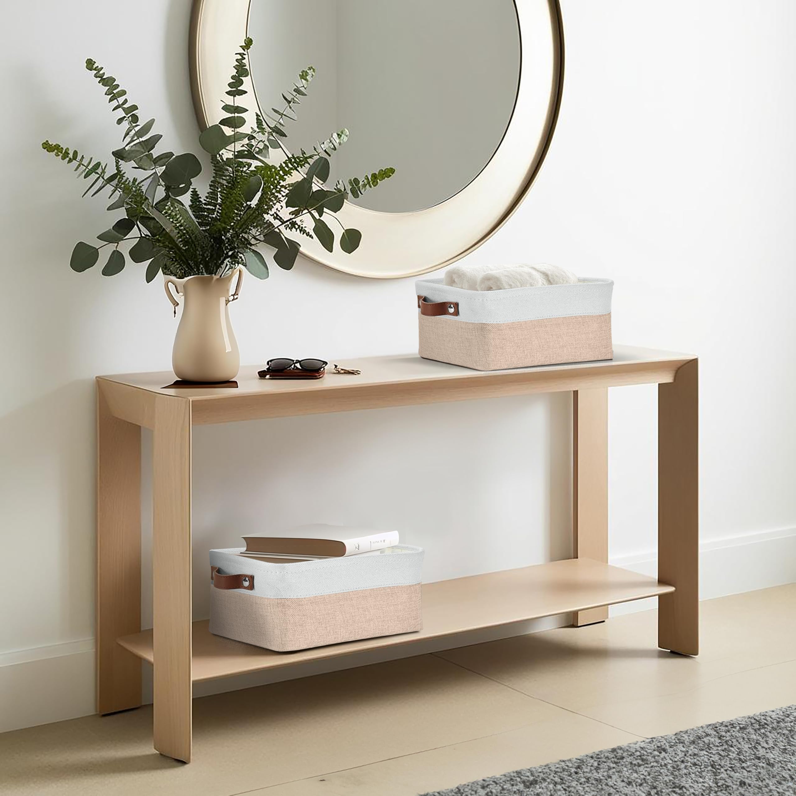 DECOMOMO Faltbarer Aufbewahrungskorb aus robustem kationischem Stoff, würfelförmig, mit Griffen, für die Organisation von Regal, Schrank (beige und weiss, klein – 30 x 20 x 15 cm – 6 Stück)