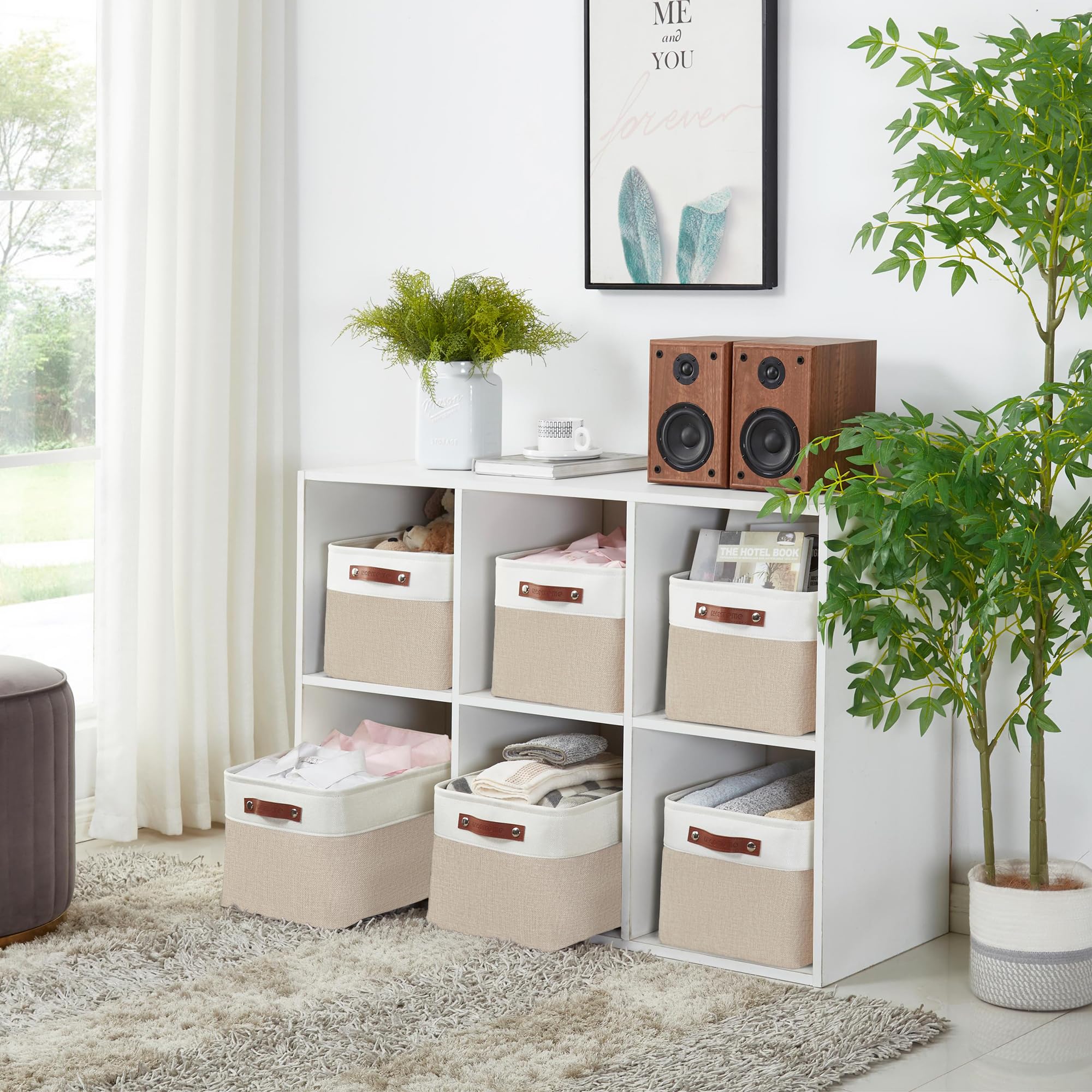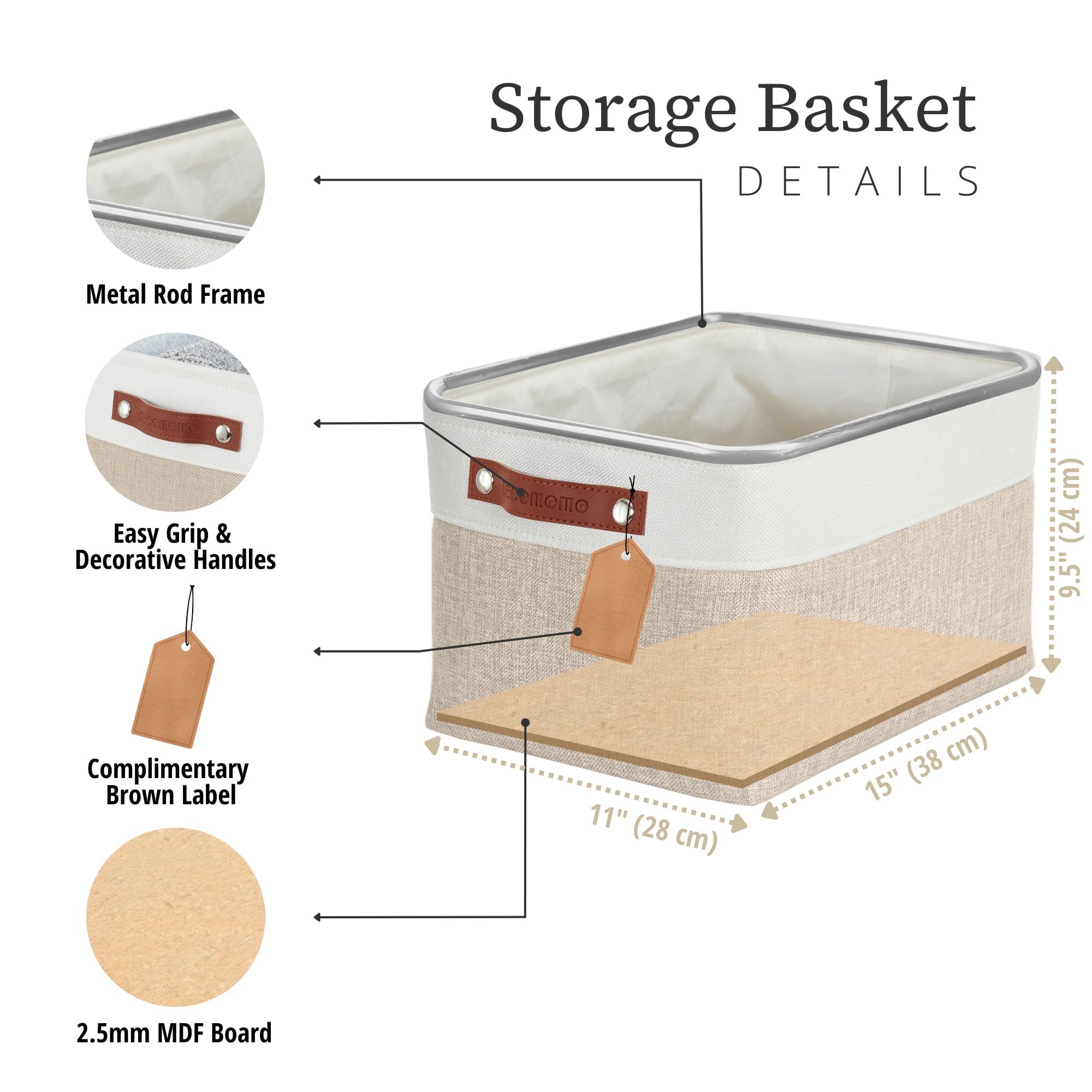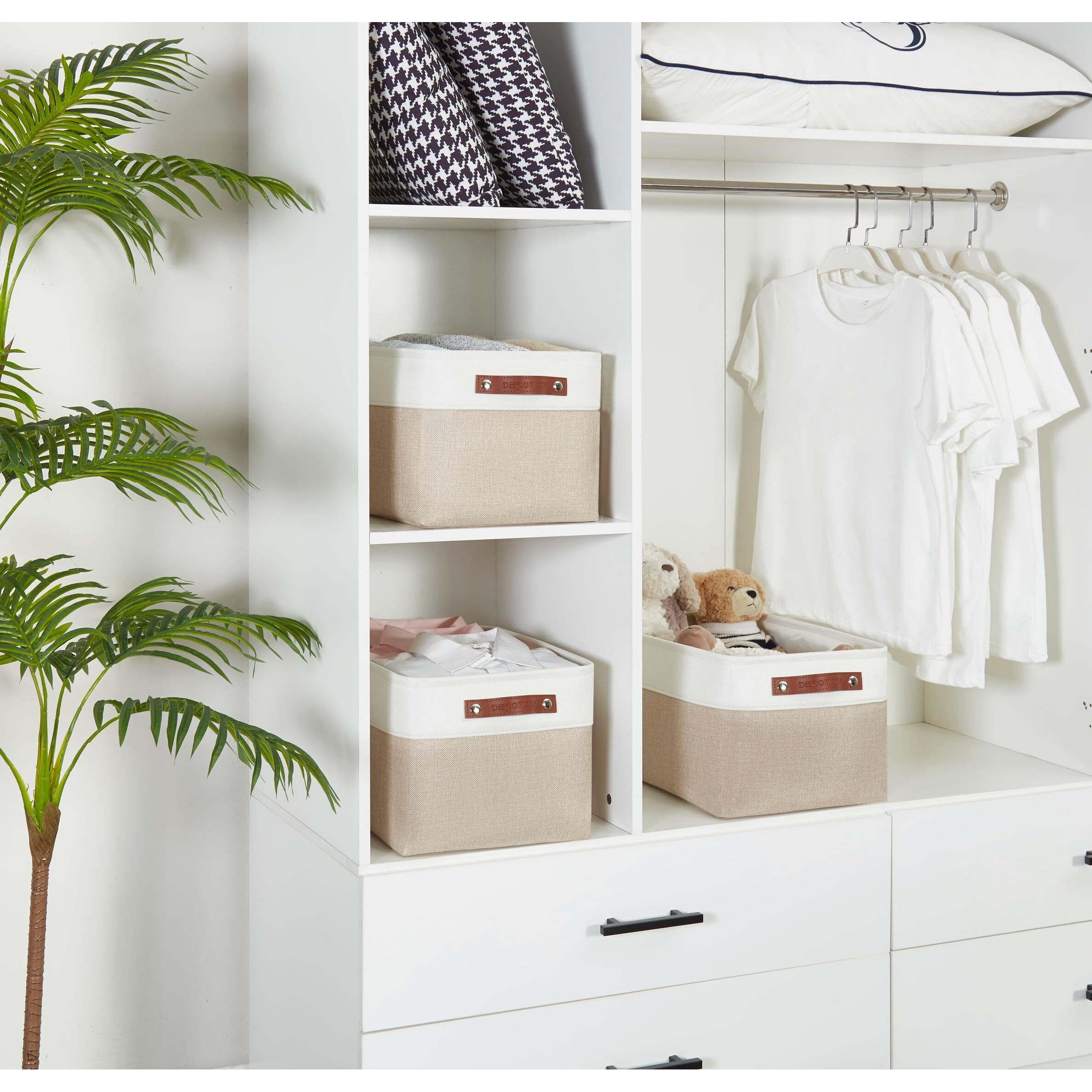 DECOMOMO Faltbarer Aufbewahrungskorb | Faltbarer stabiler Stoffkorb mit Griffen für die Organisation von Regal, Kinderzimmer, Spielzeugschrank (beige und weiss, gross – 3 Stück)