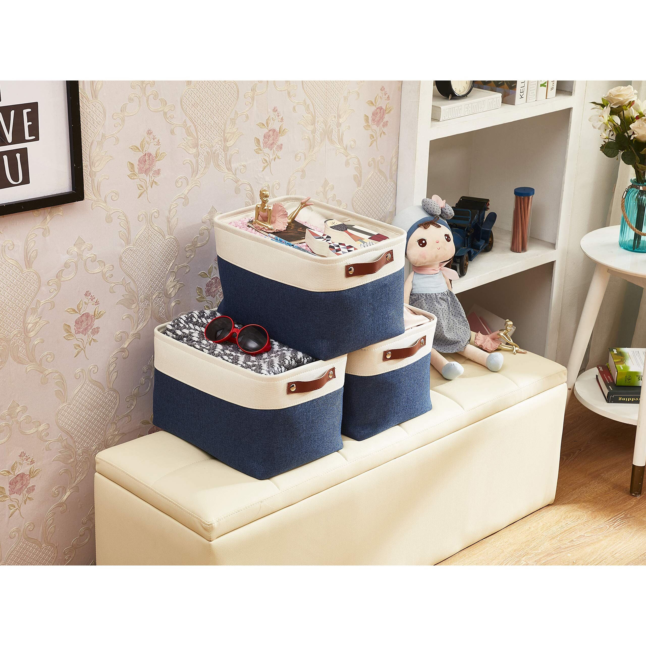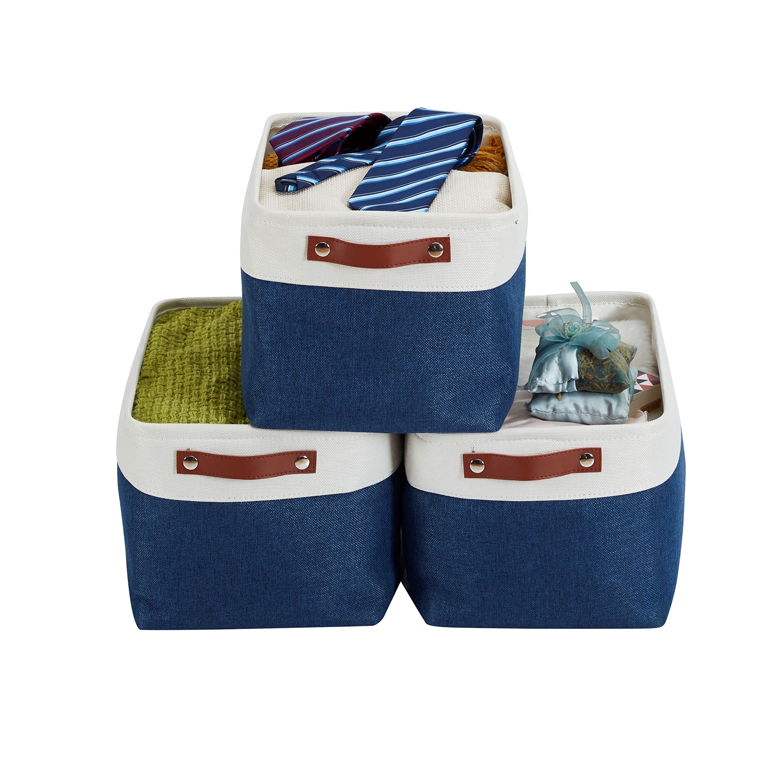 DECOMOMO faltbare Aufbewahrungskorb | robuster Stoffkorb mit Griffen für die Organisation von Regal, Kinderzimmer, Spielzeug, Schrank (Marineblau und Weiss, gross–3 Stück)