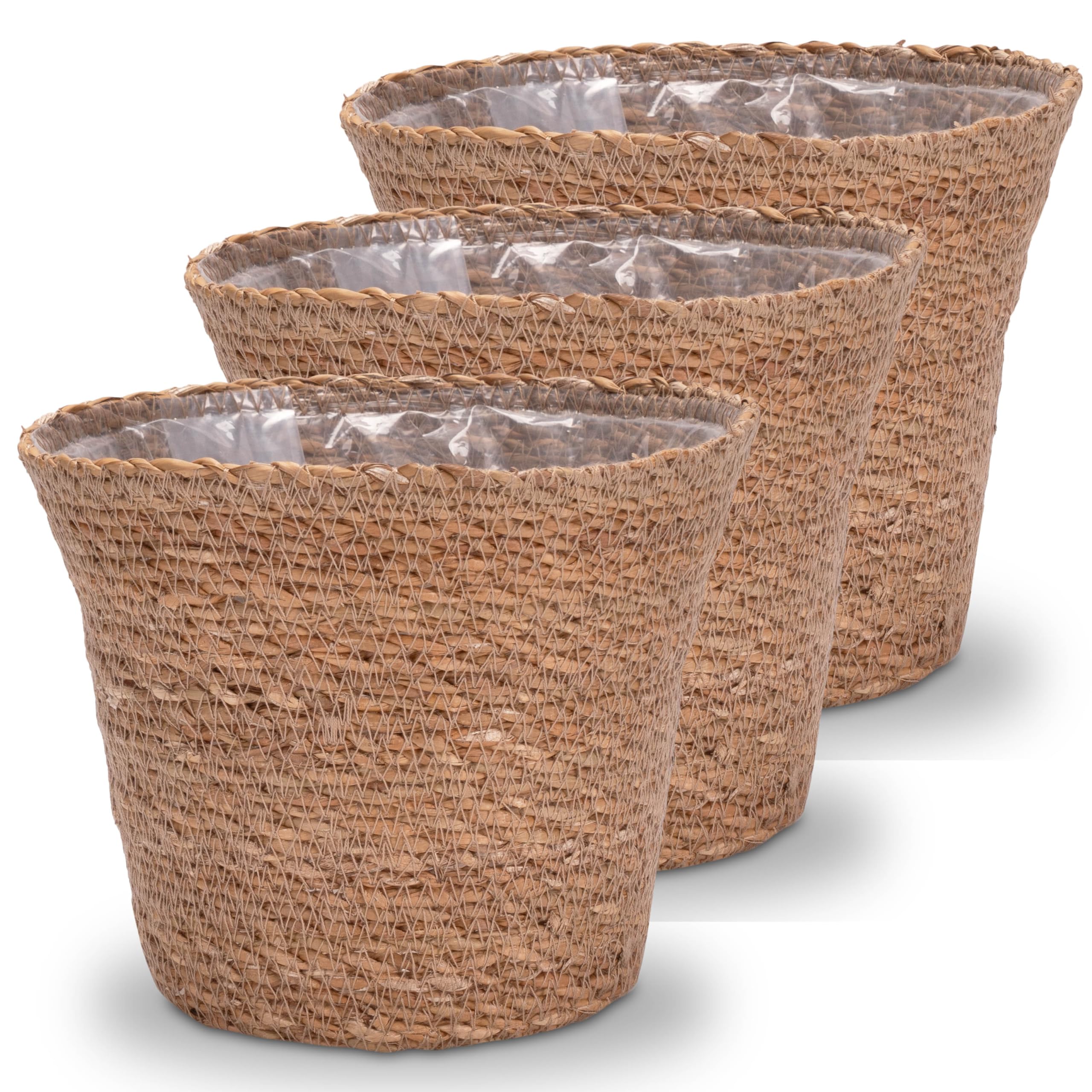 Decorasian Pflanzkorb – Übertopf geflochten – dekorativer Seegras Blumentopf mit Folieneinsatz im Boho Stil, 3 Stück 20cm