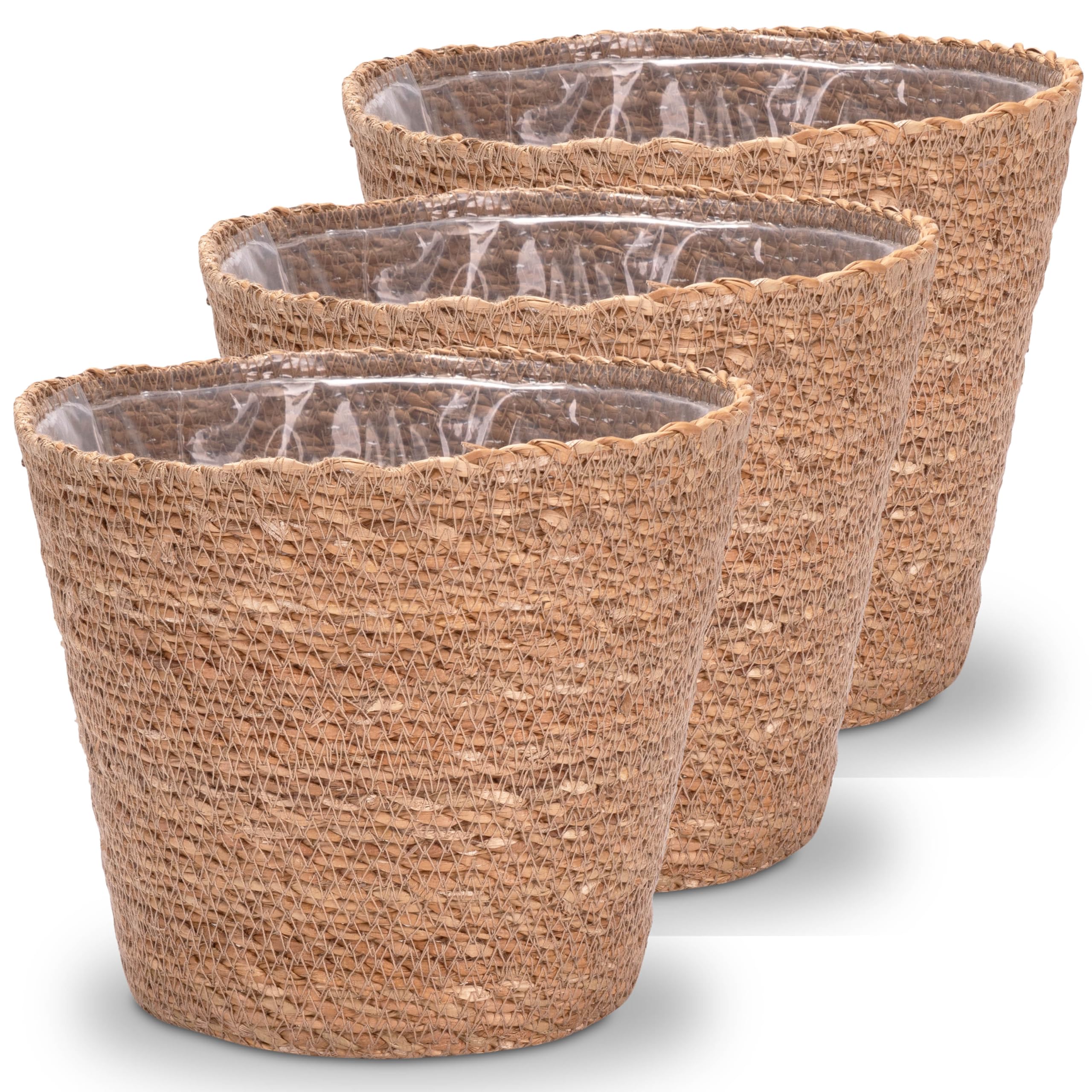Decorasian Pflanzkorb – Übertopf geflochten – dekorativer Seegras Blumentopf mit Folieneinsatz im Boho Stil, 3 Stück 22cm