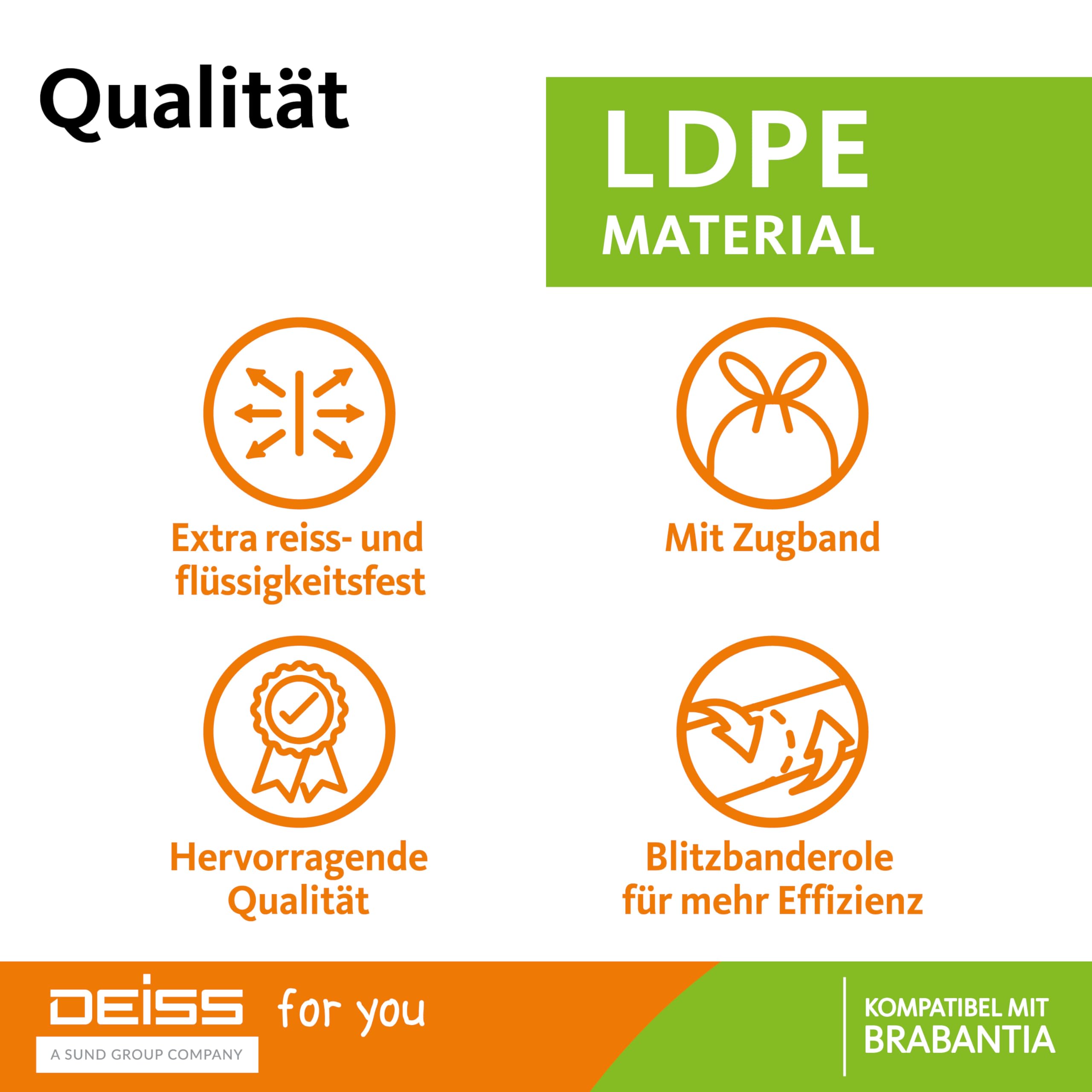 DEISS for you Müllbeutel 30 Liter – Effizienz und Nachhaltigkeit für professionelle AnwendungenDie DEISS for you Müllbeutel mit einem Volumen von 30 Litern und den Massen 440 x 760 mm sind die ideale Lösung für eine effiziente und umweltfreundliche Abfallentsorgung in verschiedenen Bereichen.Material: HDPE (Polyethylen hoher Dichte)Stärke: 24 µmFarbe: WeissVerpackungseinheit: 40 Stück pro Rolle, 400 Stück pro KartonBesonderheit: Integriertes grünes Zugband für einfaches VerschliessenVorteile auf einen Blick:Hohe Reiss- und Durchstossfestigkeit für sichere EntsorgungRecyclingfähig und umweltfreundlichVielseitig einsetzbar in verschiedenen BranchenPraktisches Zugband für hygienisches ArbeitenSetzen Sie auf DEISS for you Müllbeutel für eine zuverlässige und nachhaltige Abfallentsorgung in Ihrem Betrieb.:contentReference[oaicite:12]{index=12}