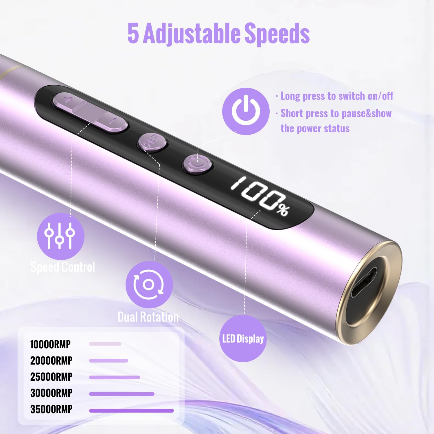 Der kabellose Nagelfraeser bietet maximale Flexibilitaet und Komfort. Dank des integrierten Akkus und der Aufladung ueber USB Type-C ist das Geraet jederzeit einsatzbereit und ideal fuer den mobilen Einsatz. Mit einer Arbeitszeit von bis zu 4,5 Stunden eignet sich der Fraeser auch fuer laengere Anwendungen.
