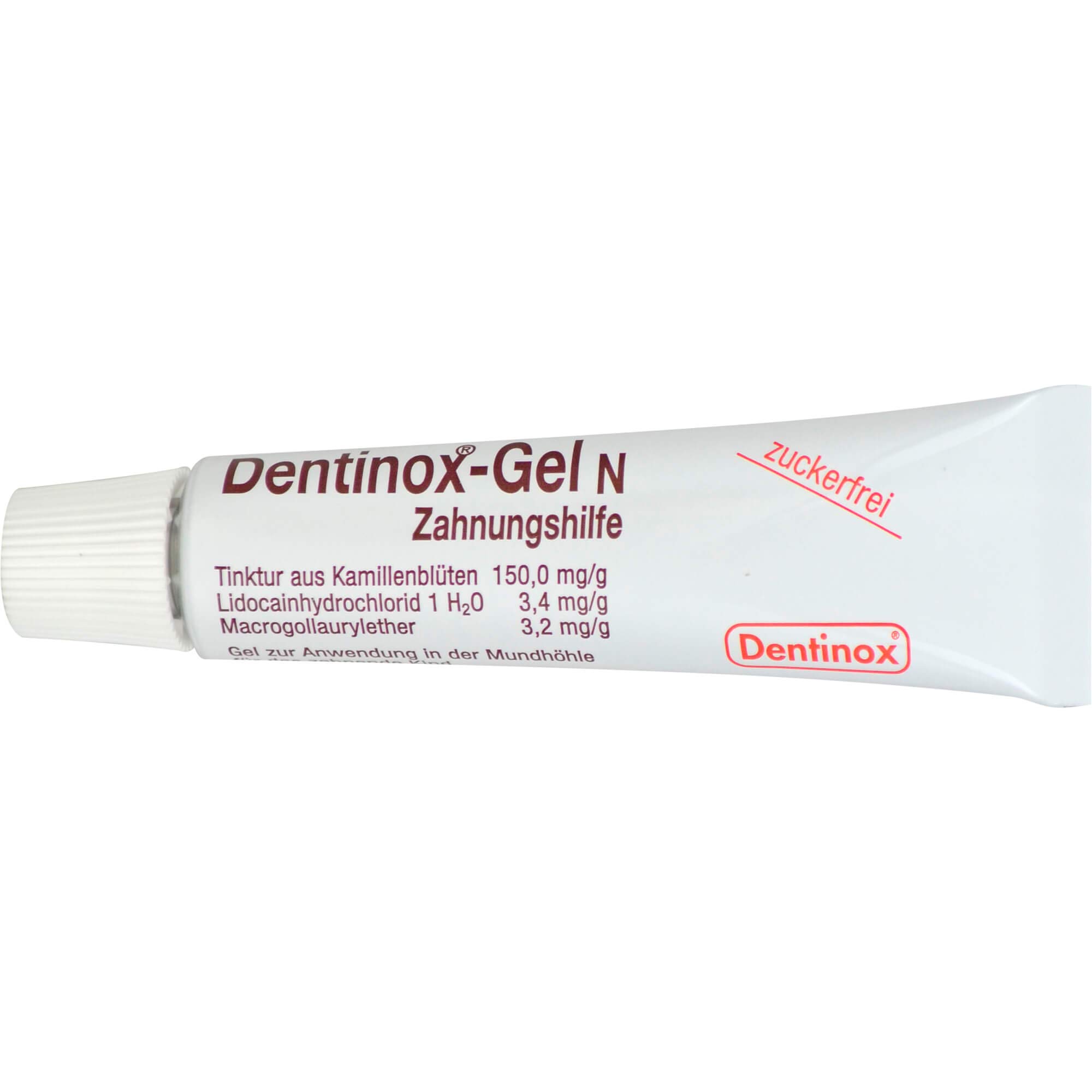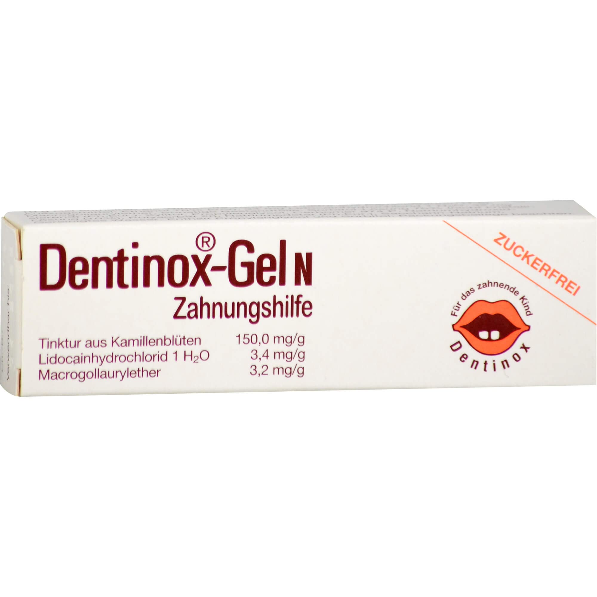 Wirkstoffe 150 mg Kamillenblüten-Tinktur (1:5); Auszugsmittel: Ethanol 70% (V/V) 2.76 mg Lidocain 3.4 mg Lidocain hydrochlorid-1-Wasser 3.2 mg MacrogollauryletherZähnchen kriegen ohne QualSchon im Mutterleib werden die Milchzähnchen angelegt. Kommt das Baby zur Welt, schlummern 20 Zahnkronen im kleinen Kiefer und warten auf den Durchbruch. Etwa in der Mitte des ersten Lebensjahres schieben sich die ersten Zahnspitzen im Unterkiefer heraus. Bis das Milchgebiss komplett ist, vergehen meist zwei Jahre.Mögliche Beschwerden verlaufen ganz unterschiedlich. Viele Babys sind reizbar, schlafen und essen schlecht. Wenn sich ein neuer Zahn auf den Weg macht, nimmt der Speichelfluss zu, und die Kleinen sabbern sehr viel. Das Zahnfleisch kann gerötet sein und verursacht Schmerzen. Die bewährte entzündungshemmende und wundheilungsfördernde Zahnungshilfe erleichtert dem Kind diese Entwicklungsphase.Dentinox-Gel N enthält neben Kamillentinktur örtlich schmerzstillende Wirkstoffe in kindgerechter Dosierung. Das gut haftende Gel wirkt lokal genau dort, wo das durchbrechende Zähnchen Probleme bereitet.Die millionenfach bewährte Hilfe beim Durchbruch der ersten Zähnchen Babygerechte Dosierung mit drei Wirkstoffen Kamillentinktur, Lidocainhydrochlorid, Macrogollaurylether Schmerzstillend, entzündungshemmend, wundheilungsfördernd# Zuckerfrei mit karieshemmendem Zuckeraustauschstoff Xylit Ohne Farb- und KonservierungsstoffeDie Anwendung kann bei Bedarf bis zum Durchtritt aller Zähnchen des Milchgebisses und der späteren Backenzähne erfolgen.Anwendungsgebiete:Traditionell angewendet als mild wirkendes Arzneimittel zur kurzzeitigen Linderung der Beschwerden bei der ersten Zahnung. Enthält Sorbitol.Dentinox Gesellschaft für pharmazeutische Präparate Lenk & Schuppan KGNunsdorfer Ring 1912277 BerlinDeutschland