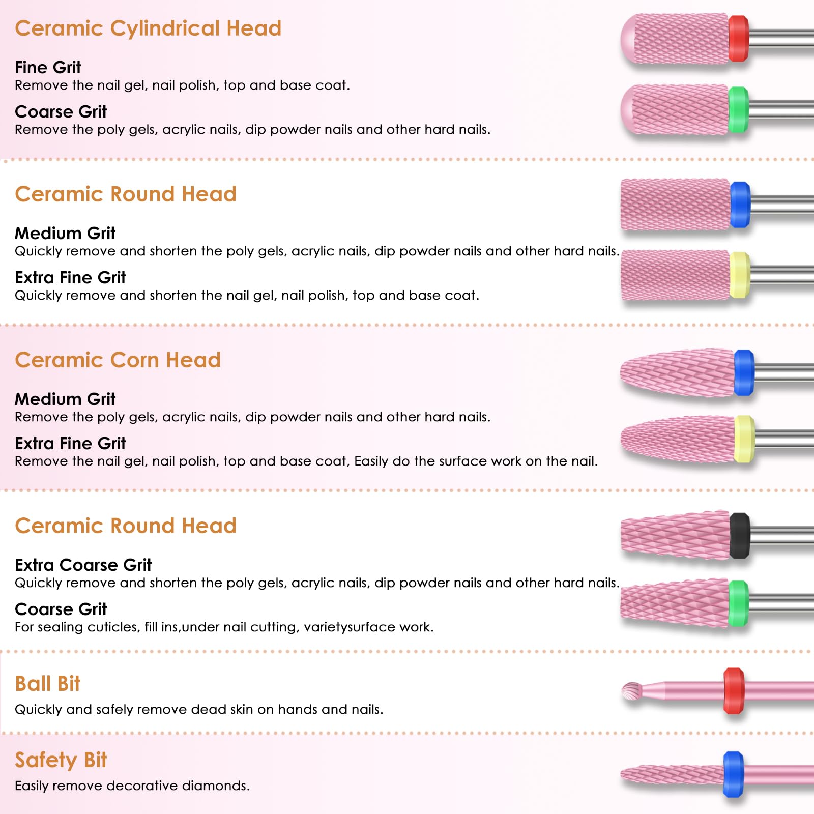 Die Keramik Nagelfraeser Bits eignen sich zum Schaerfen, Schleifen, Abtragen, Reinigen, Schnitzen, Glätten, Polieren und Umformen von Gel- und Acrylnägeln. Je nach gewaehltem Bit koennen feine Detailarbeiten oder grobere Abtragungen schnell und kontrolliert ausgefuehrt werden.