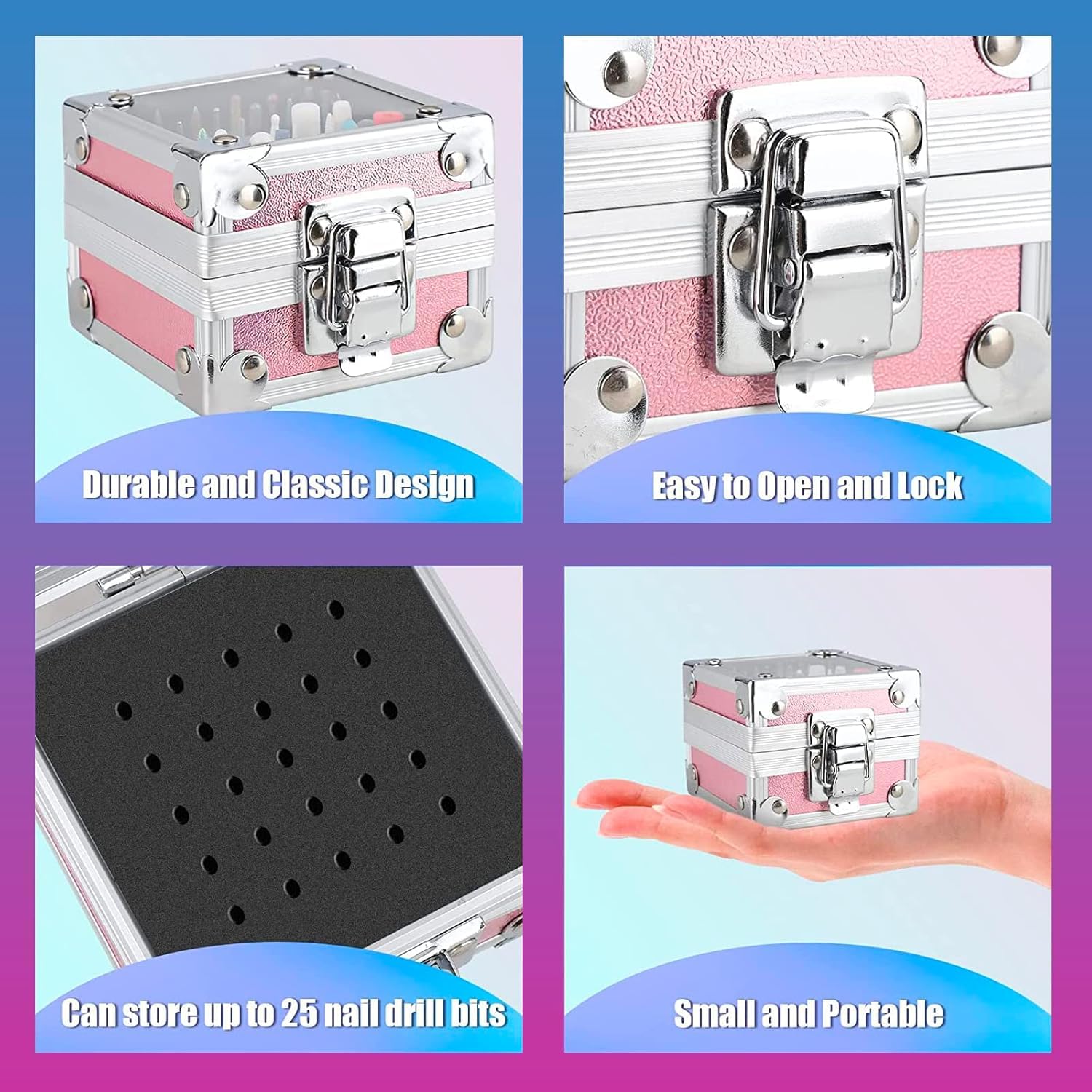 Der mitgelieferte Metallhalter in Rosa bietet Platz fuer bis zu 25 Nagelfraeser Bits. Er sorgt fuer Ordnung, schnellen Zugriff und sicheren Transport. Durch seine kompakte Form eignet er sich perfekt fuer Handtaschen, Rucksaecke, Reisegepaeck oder den mobilen Einsatz im Nagelstudio.
