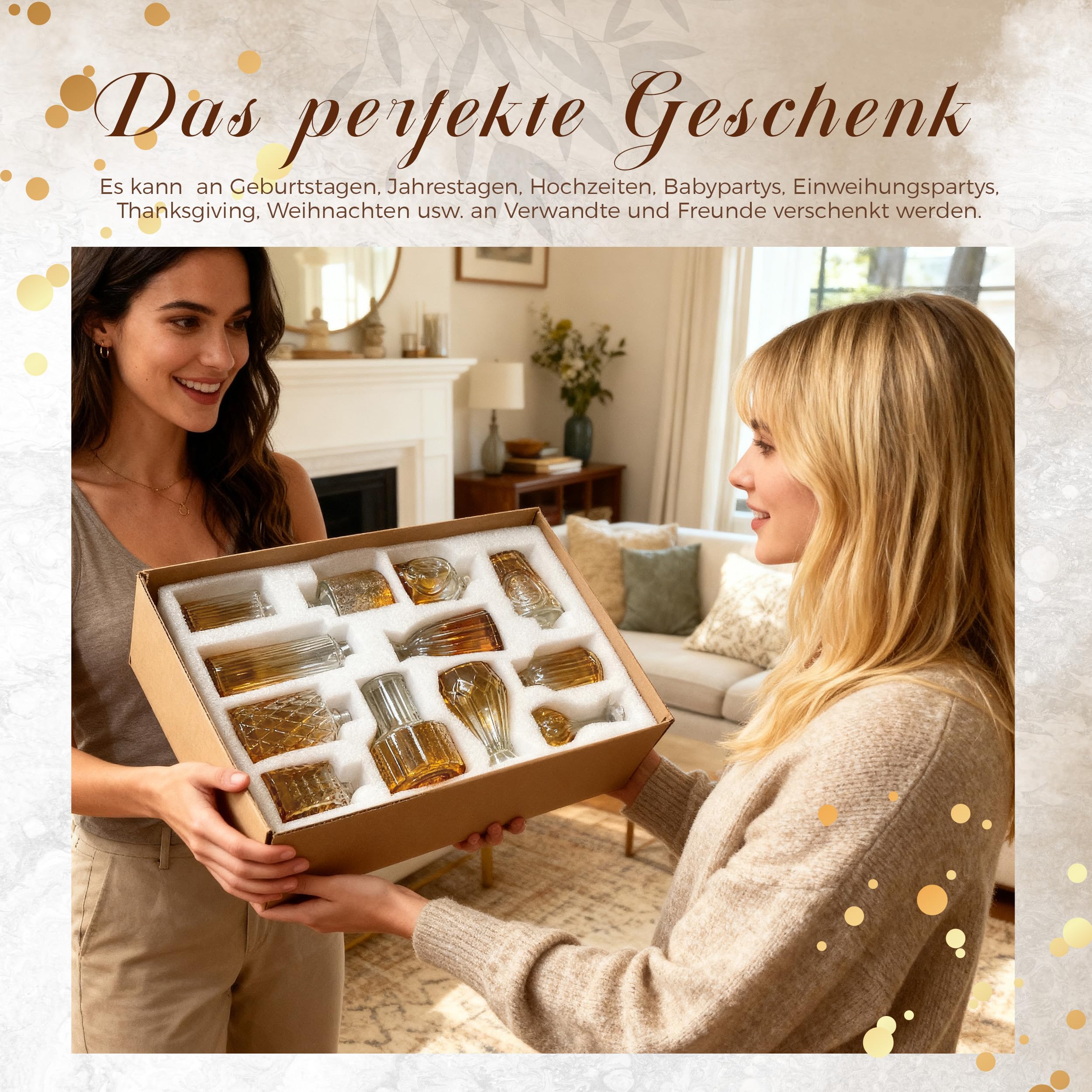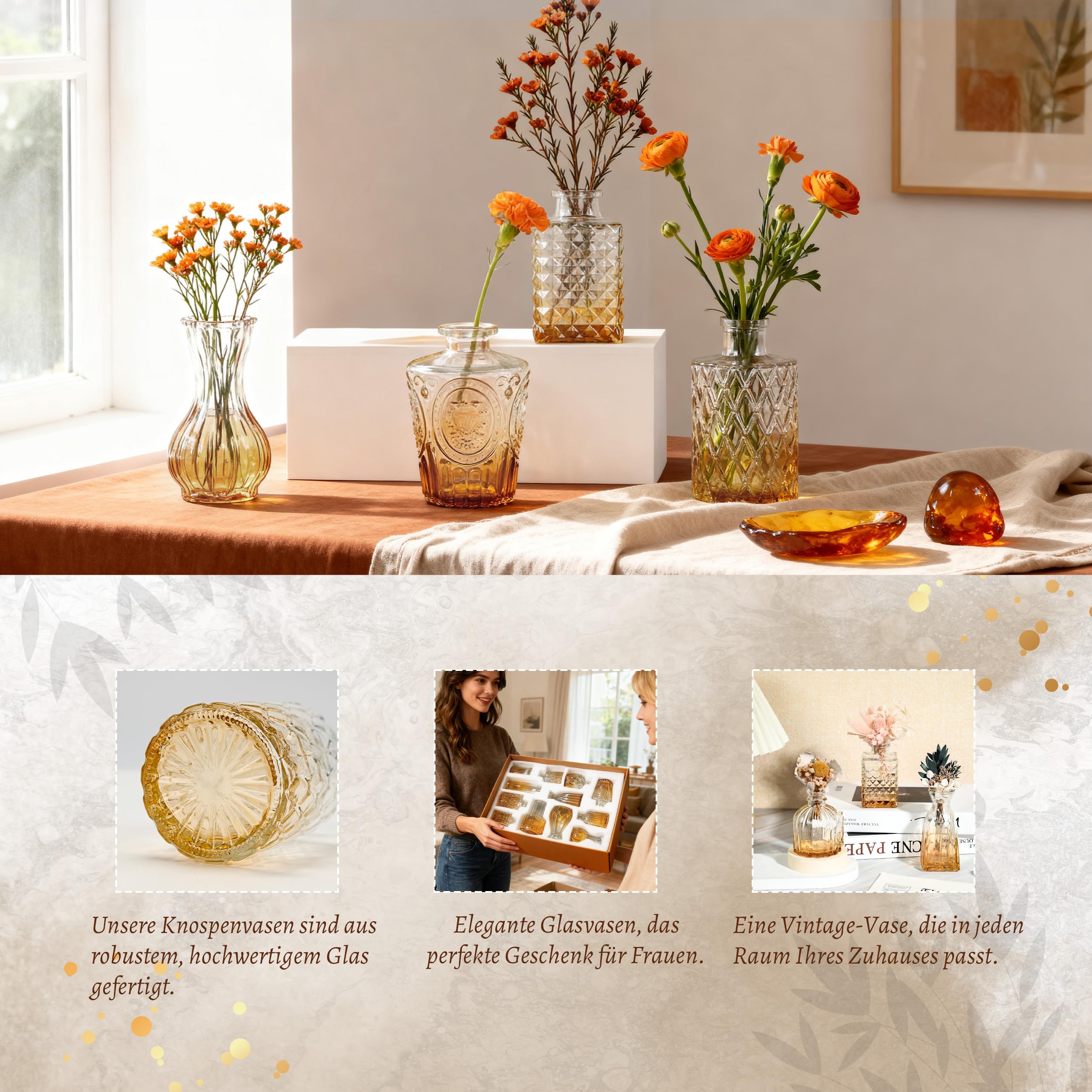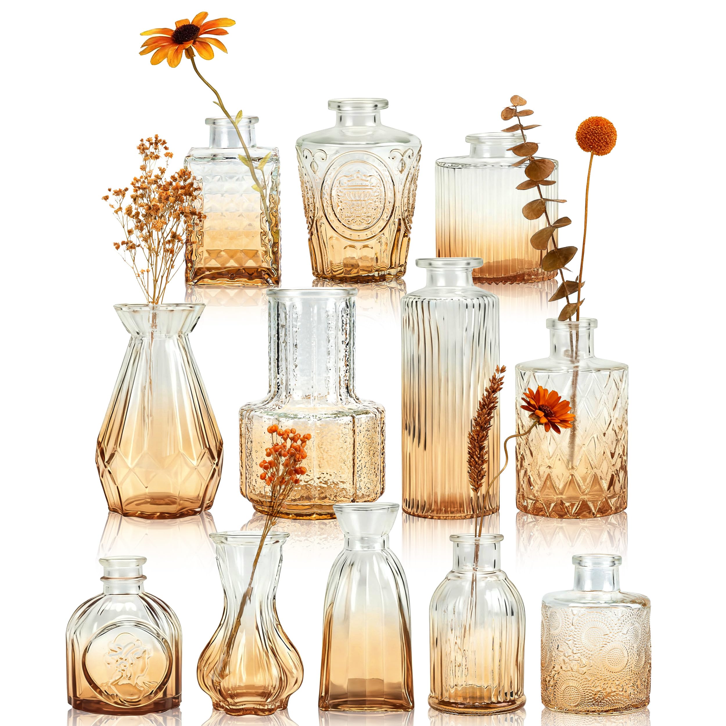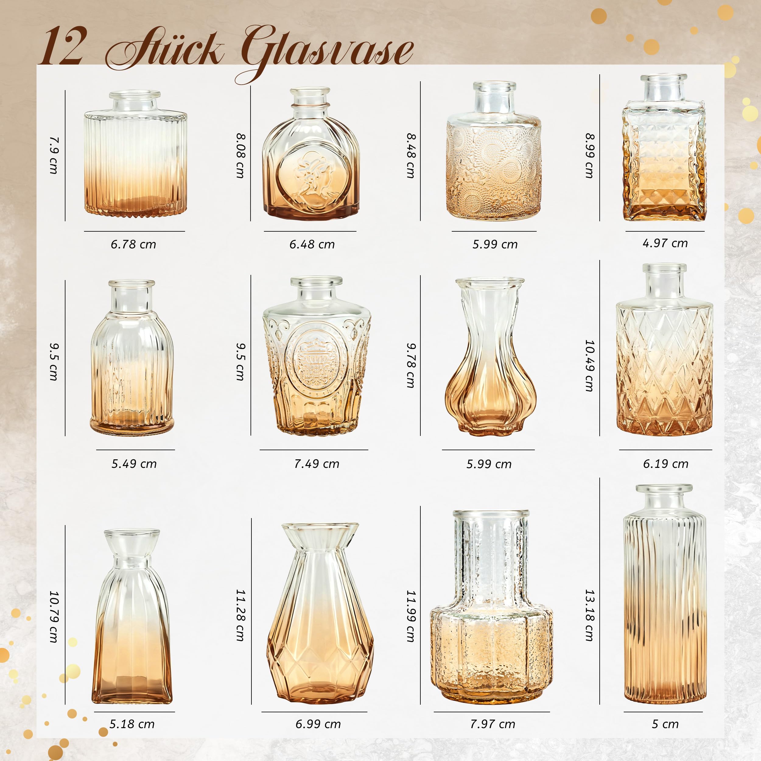 Der Rose 12 Stück Kleine Vasen Glasvasen für Tischdeko Mini Vintage Vasen Set für Hochzeitsdeko Party Deko Geschenk (Bernsteinfarben)