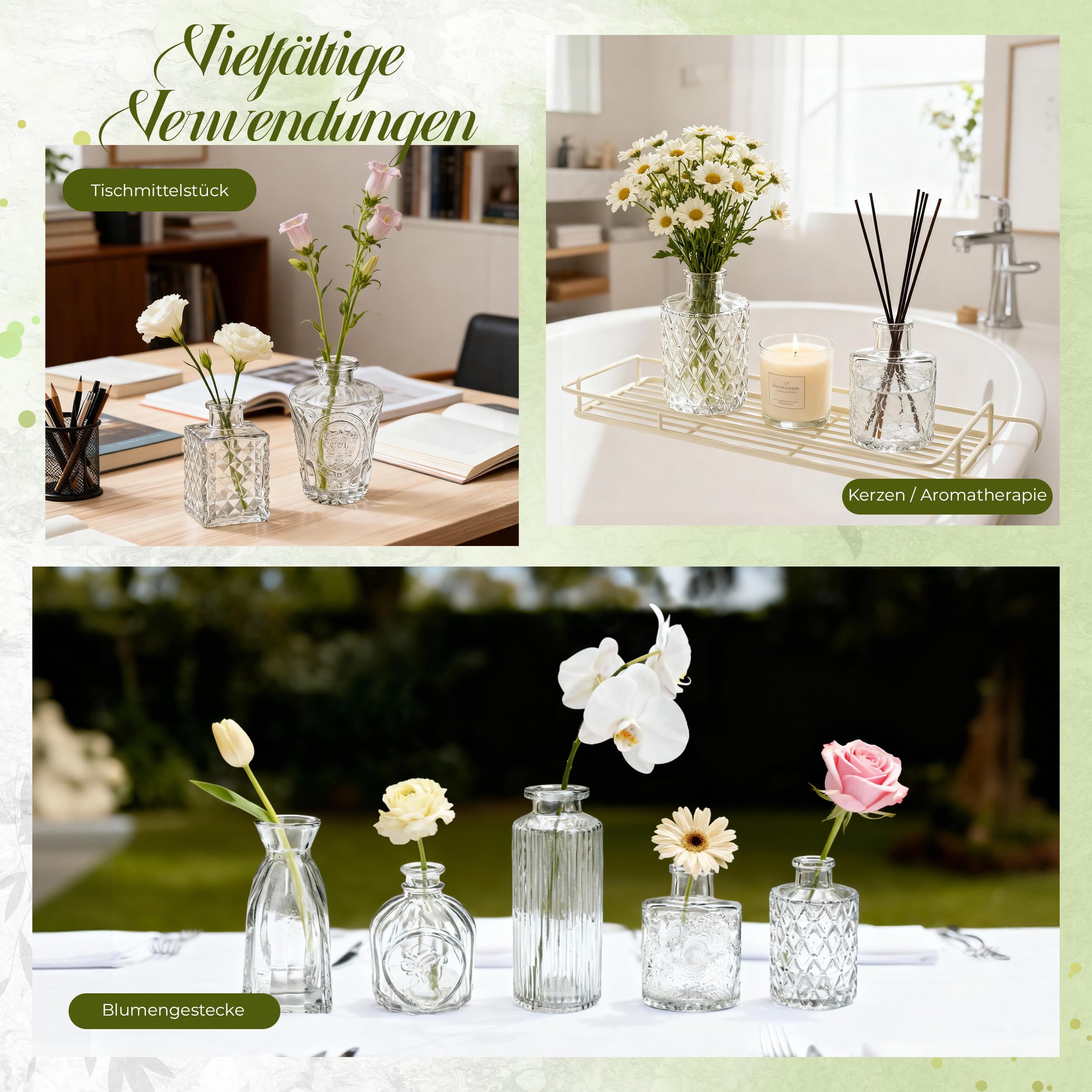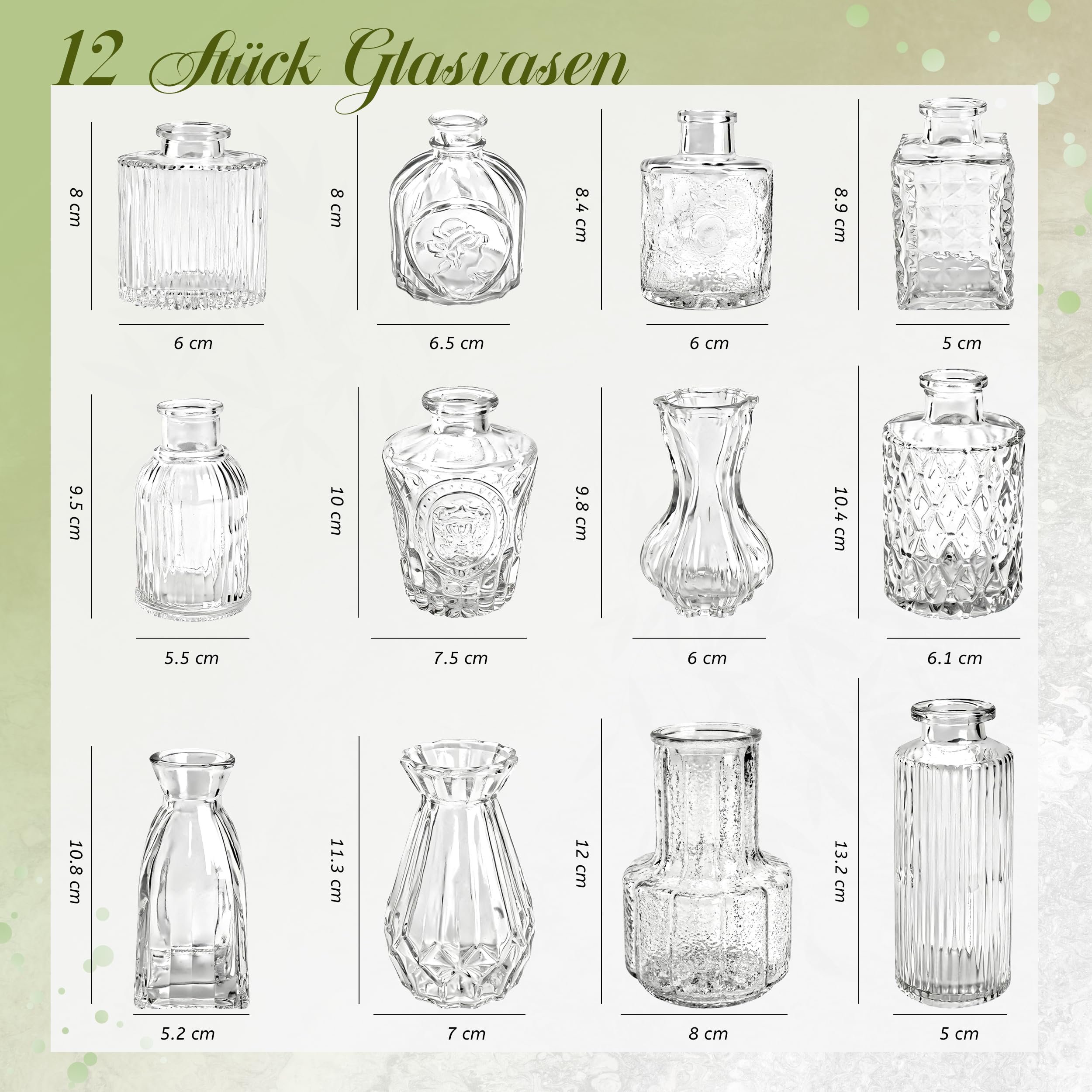 Der Rose 12 Stück Kleine Vasen Glasvasen für Tischdeko Mini Vintage Vasen Set für Hochzeitsdeko Party Deko Geschenk