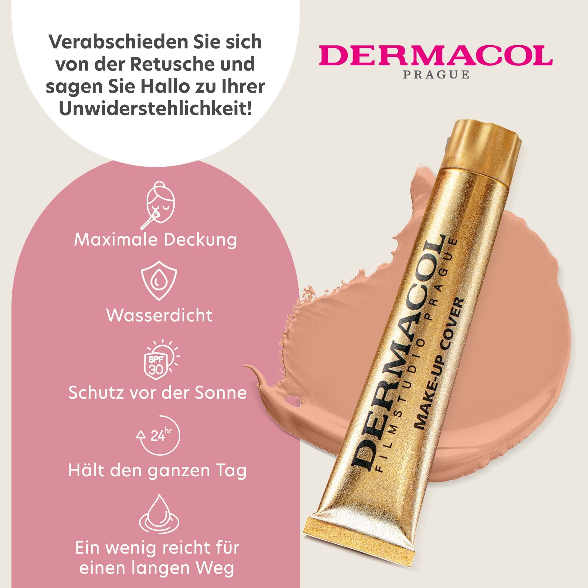 NUANCEN: MITTLERES BEIGE-ROSÉ TON: KALT HAUTTYP: MITTELDas klinisch getestete Dermacol Make-up Cover mit extrem starker Deckkraft kam in Europa als erstes seiner Art auf den Markt und weltweit als eines der ersten. Die Lizenz für diese Foundation wurde schliesslich nach Hollywood verkauft. Es besteht zu 50 % aus Pigmenten und ist somit eine Wunderwaffe bei unebenmässigem Teint. DERMACOL MAKE-UP COVER korrigiert perfekt dunkle Augenringe, unangenehme Flecken, Akne und eine ungleichmässige Pigmentierung. Es kann sogar Narben und Tätowierungen abdecken. Es kann auf dem gesamten Gesicht oder Körper für die Farbkorrektur verwendet werden, für das Abdunkeln oder Aufhellen der Hauttöne und für die ideale Harmonisierung. Es wird weithin als professionelles Make-up für Foto- oder Filmaufnahmen, Modeljobs und festliche Anlässe verwendet.Deckkraft: voll (extrem)VORTEILE Wasserfest Langanhaltend SPF30 Hypoallergen Dermatologisch getestet Klinisch getestet Frei von Konservierungsstoffen und Paraben Für alle Hauttypen Erhältlich in 16 Farbtönen Extreme Deckkraft Besteht zu mehr als 50 % aus PigmentenANWENDUNGSEMPFEHLUNG Wählen Sie den richtigen Farbton für Ihre Haut. Tupfen Sie das Make-up vorsichtig auf Ihre Haut, und zwar entweder mit den Fingern oder einem feuchten Make-up-Schwamm. Bauen Sie das Dermacol Make-up Cover nach und nach auf, indem sie zunächst eine kleine Menge verwenden und dann nach Bedarf noch mehr auftragen, bis alle Hautprobleme abgedeckt sind. (Das Dermacol Make-up Cover hat eine reichhaltige Konsistenz und bietet eine extreme Deckkraft. Deshalb ist es wichtig, das Make-up gleichmässig anzuwenden).