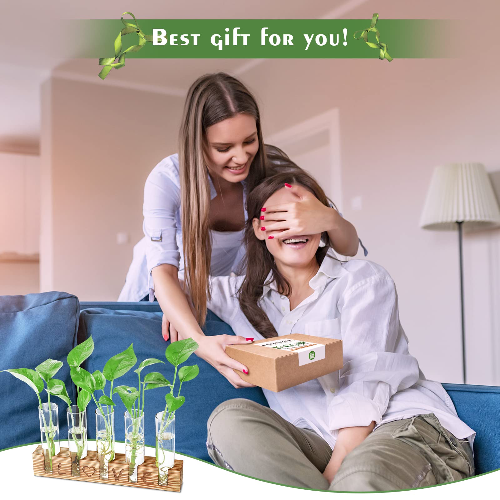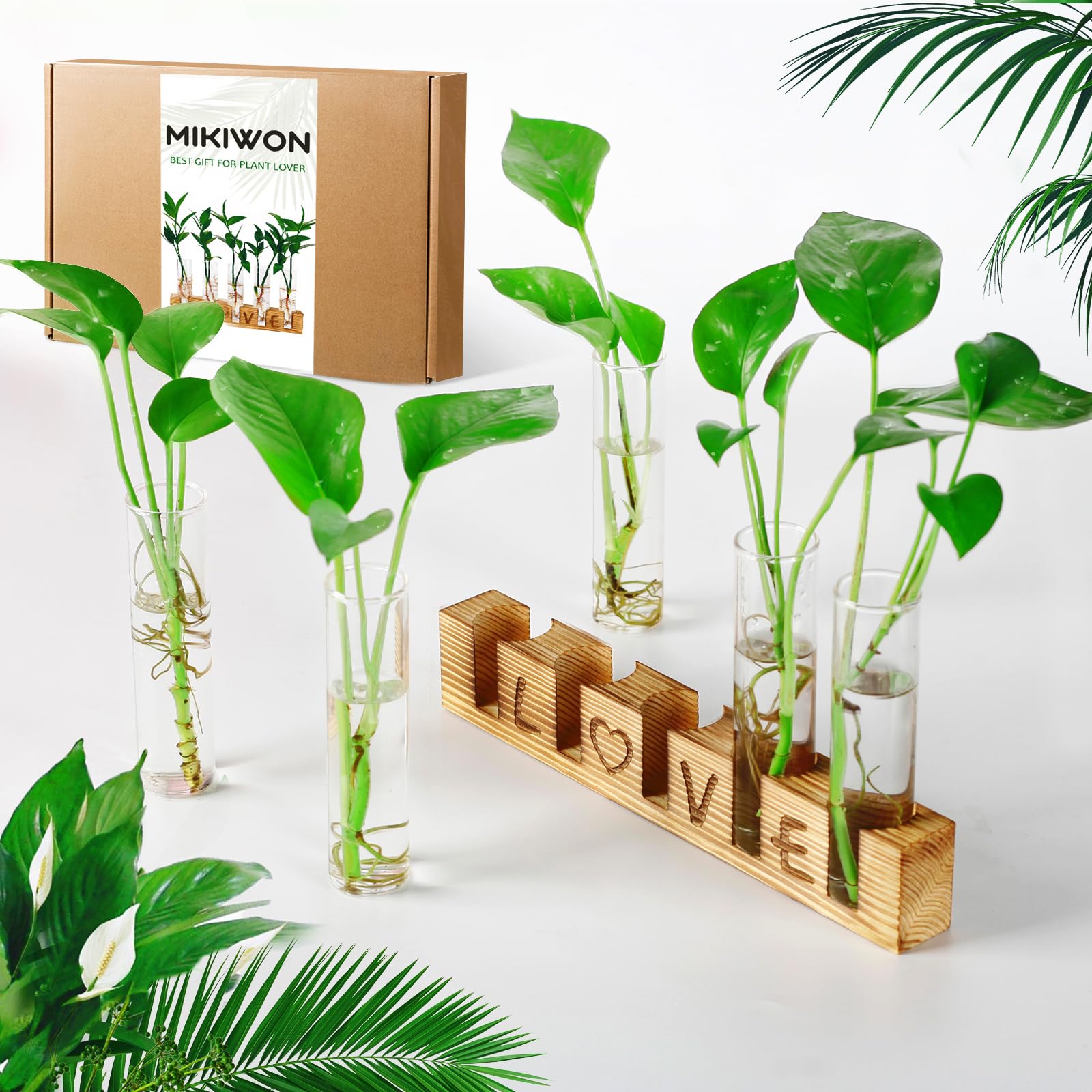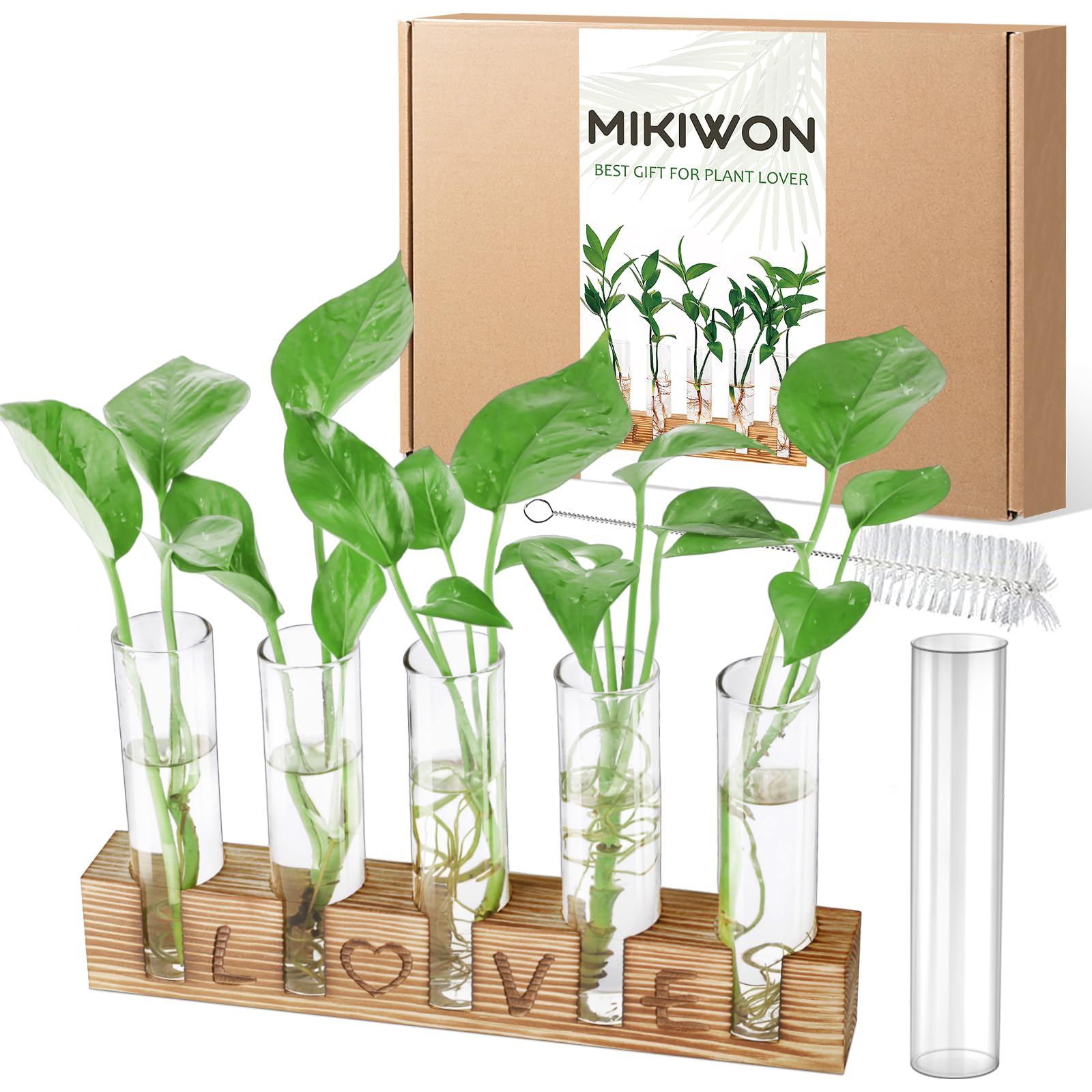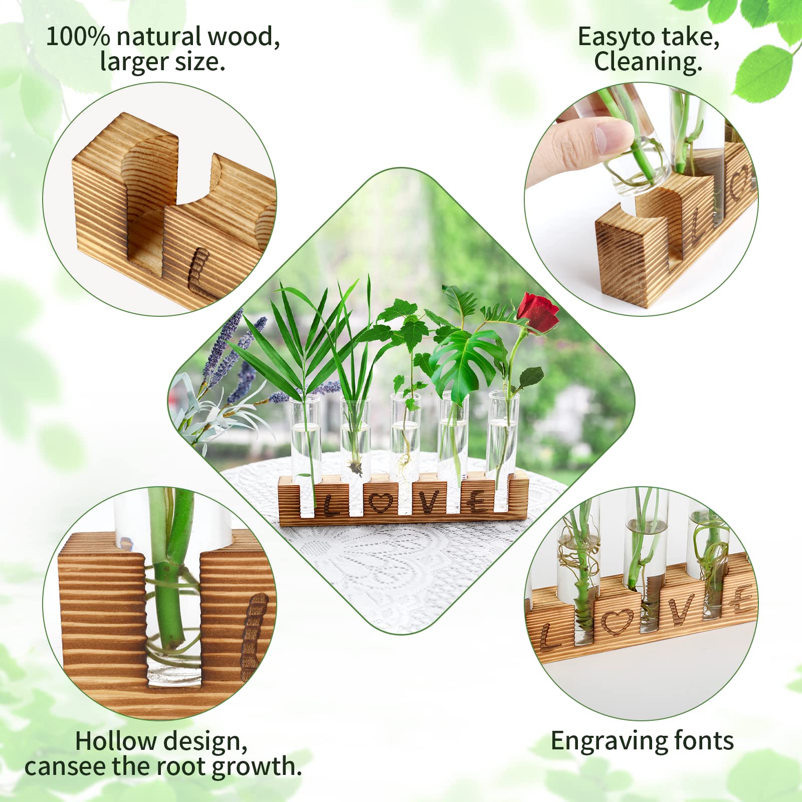 Mikiwon Anzuchtstationen Terrarium mit Holzständer, 5 Reagenzgläser, Desktop-Glas-Pflanzenterrarium in Holzständer für Hydrokulturpflanzen, Schneiden, Büro, Heimdekoration