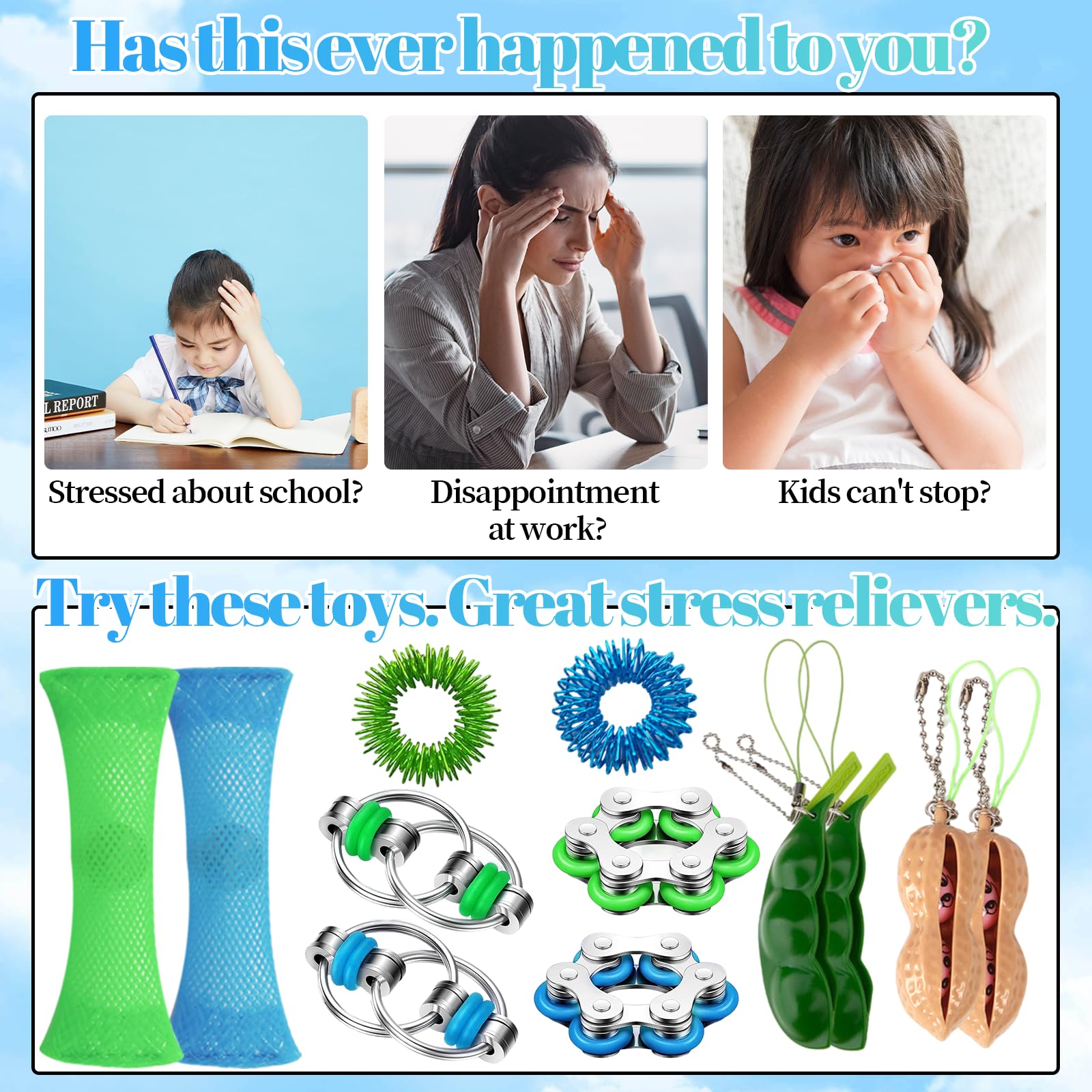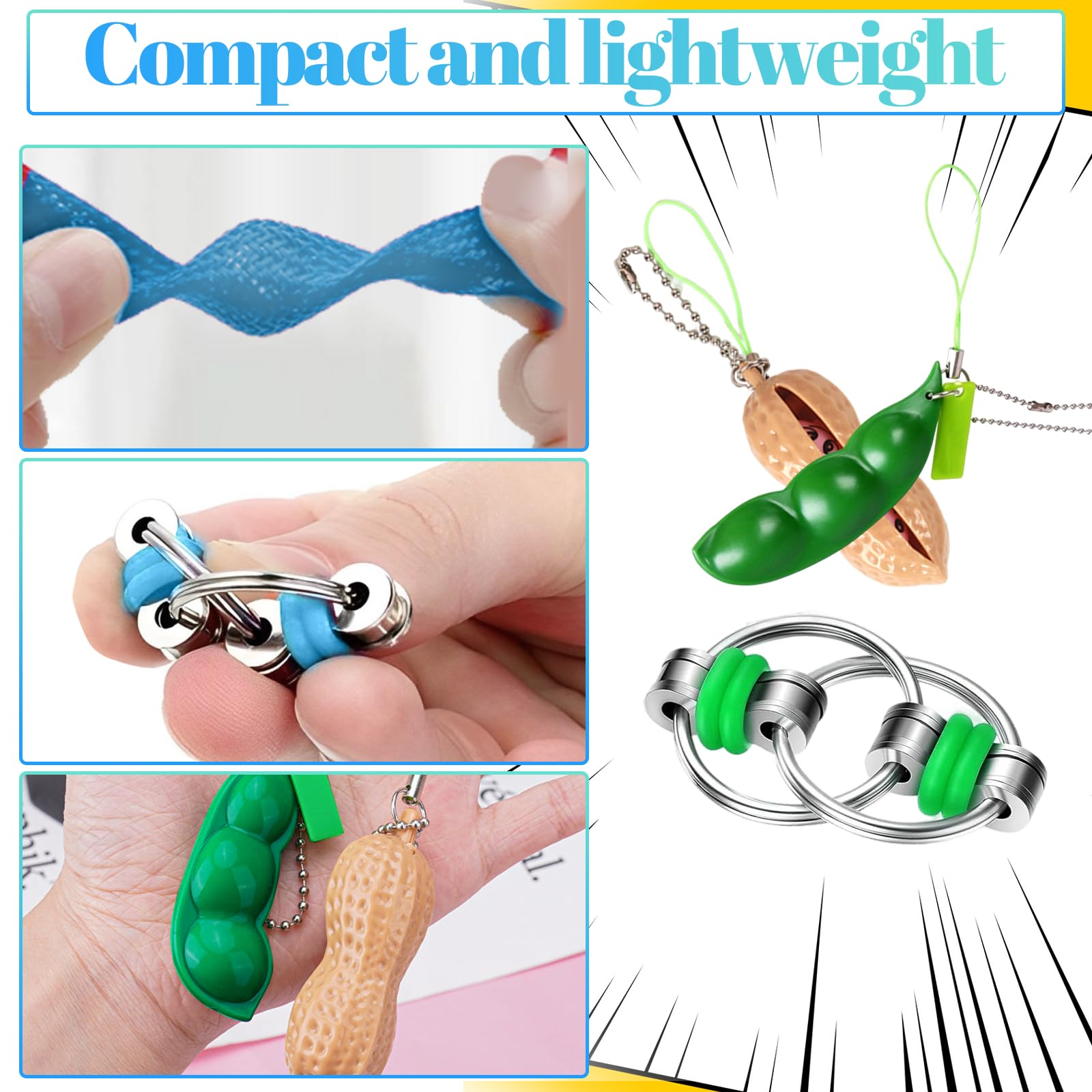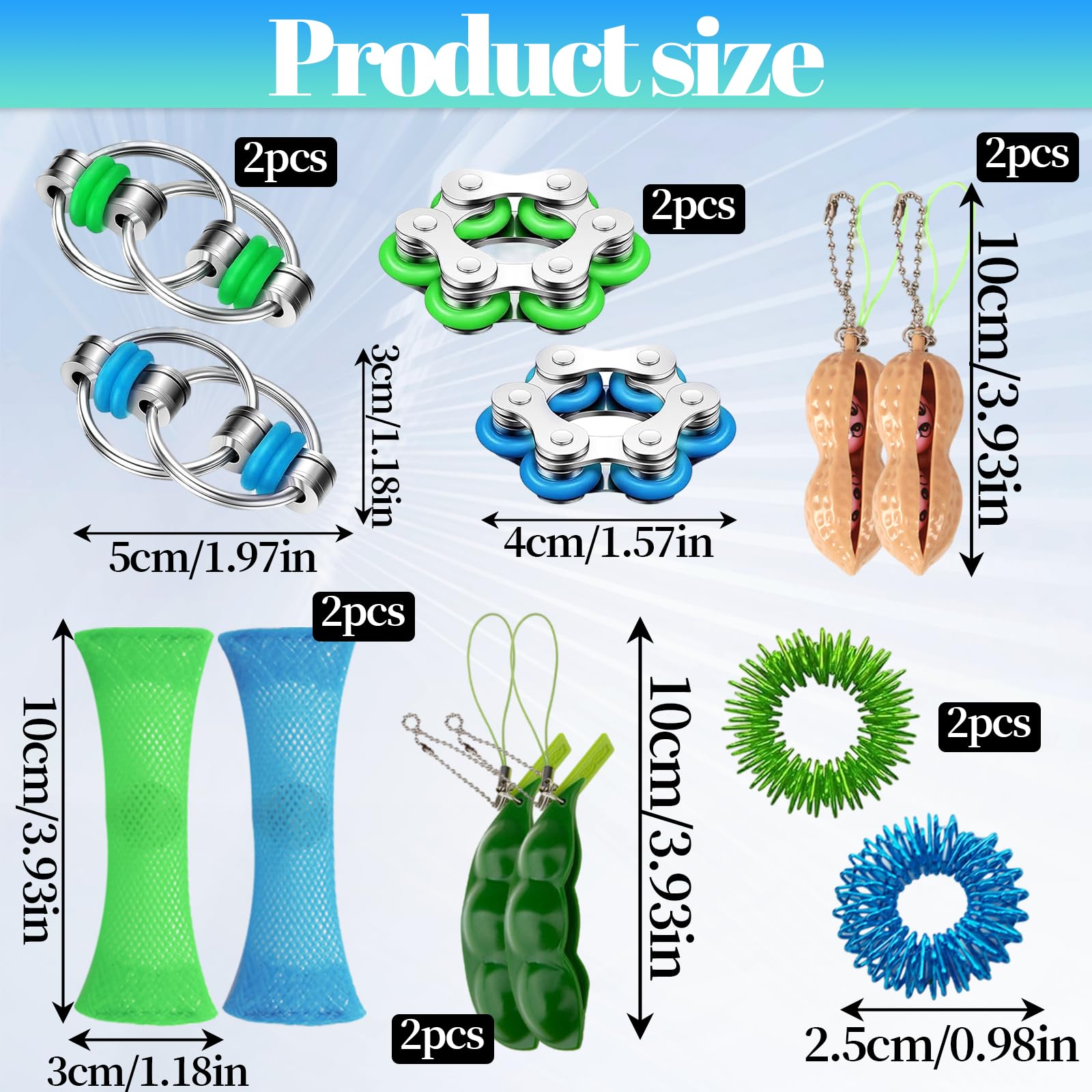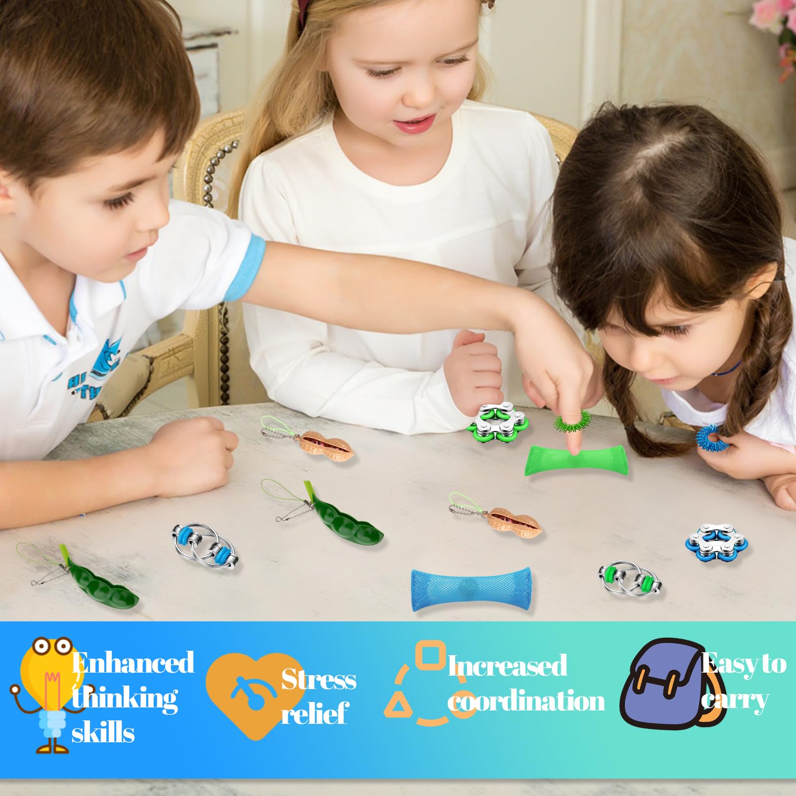 • Fidget Set: Dieses Spielzeugsortiment umfasst zwei Murmelnetzspielzeuge, zwei Stressabbauketten, zwei Fingermassagegeräte, zwei Fahrradketten, zwei erdnussförmige Spielzeuge und zwei edamameförmige Spielzeuge. Bei einer so vielfältigen Auswahl können Sie Ihre Lieblingsspielzeuge auswählen, die Ihnen helfen, sich zu entspannen und eine positive Stimmung aufrechtzuerhalten