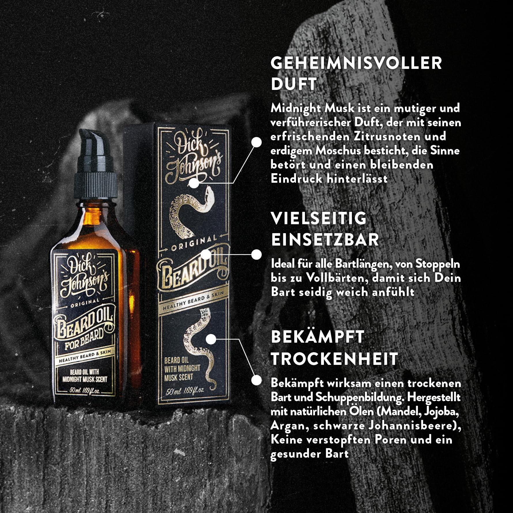 Dick Johnson Bartöl Midnight Musk Duft 50 ml – Bart Öl mit Arganöl, Jojobaöl und Mandelöl – Bartpflege für Männer zur täglichen Anwendung & Bartwachstum – Geschenk für Männer – Made in Finnland