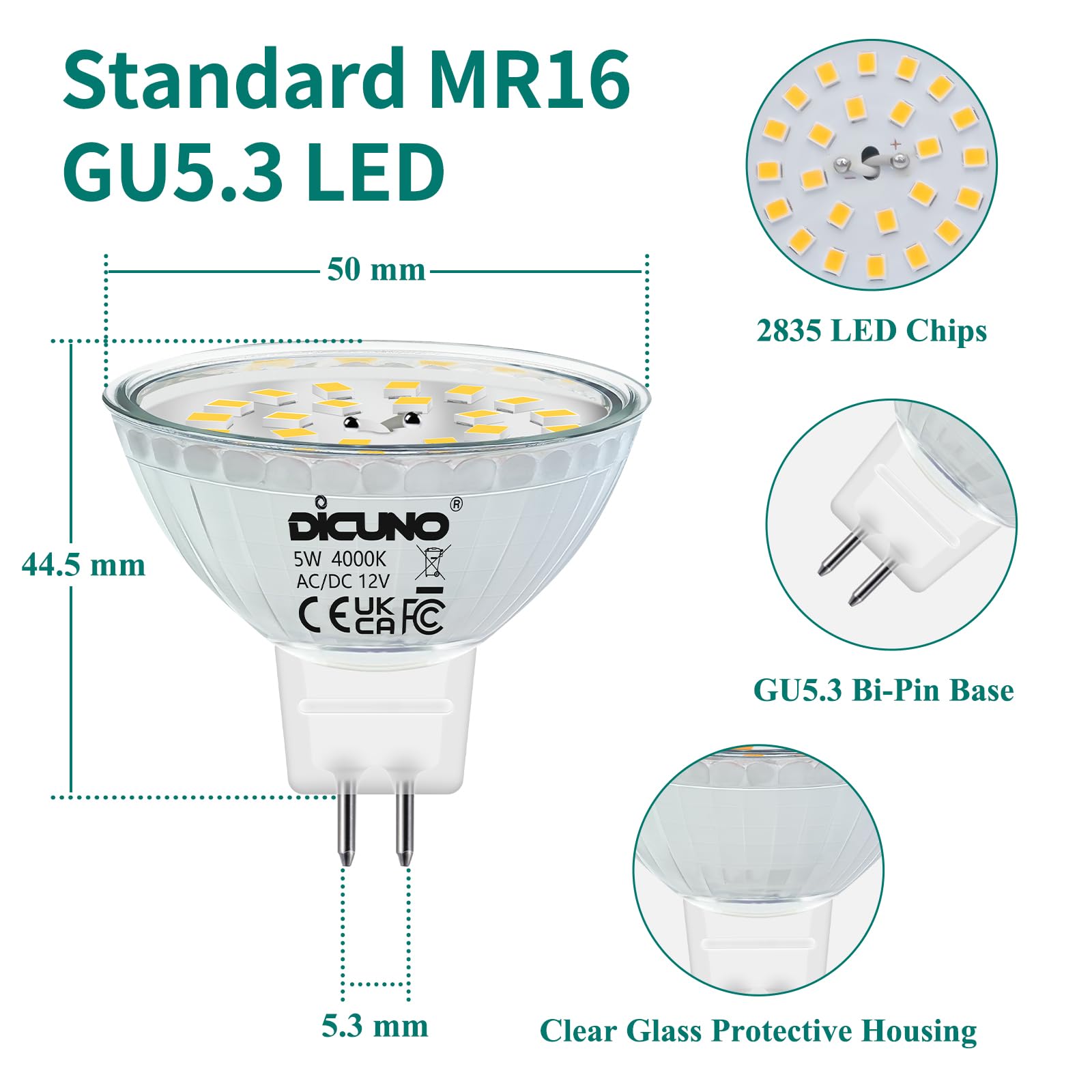 DiCUNO GU5.3 LED Lampen 5W, 12V MR16 Reflektor, Ersetzt 50W Halogen Spots, 4000K Neutralweiss, 500lm, 120°Abstrahlwinkel, LED Leuchtmittel, AC/DC, Flimmerfrei, Nicht dimmbar, 6er Pack