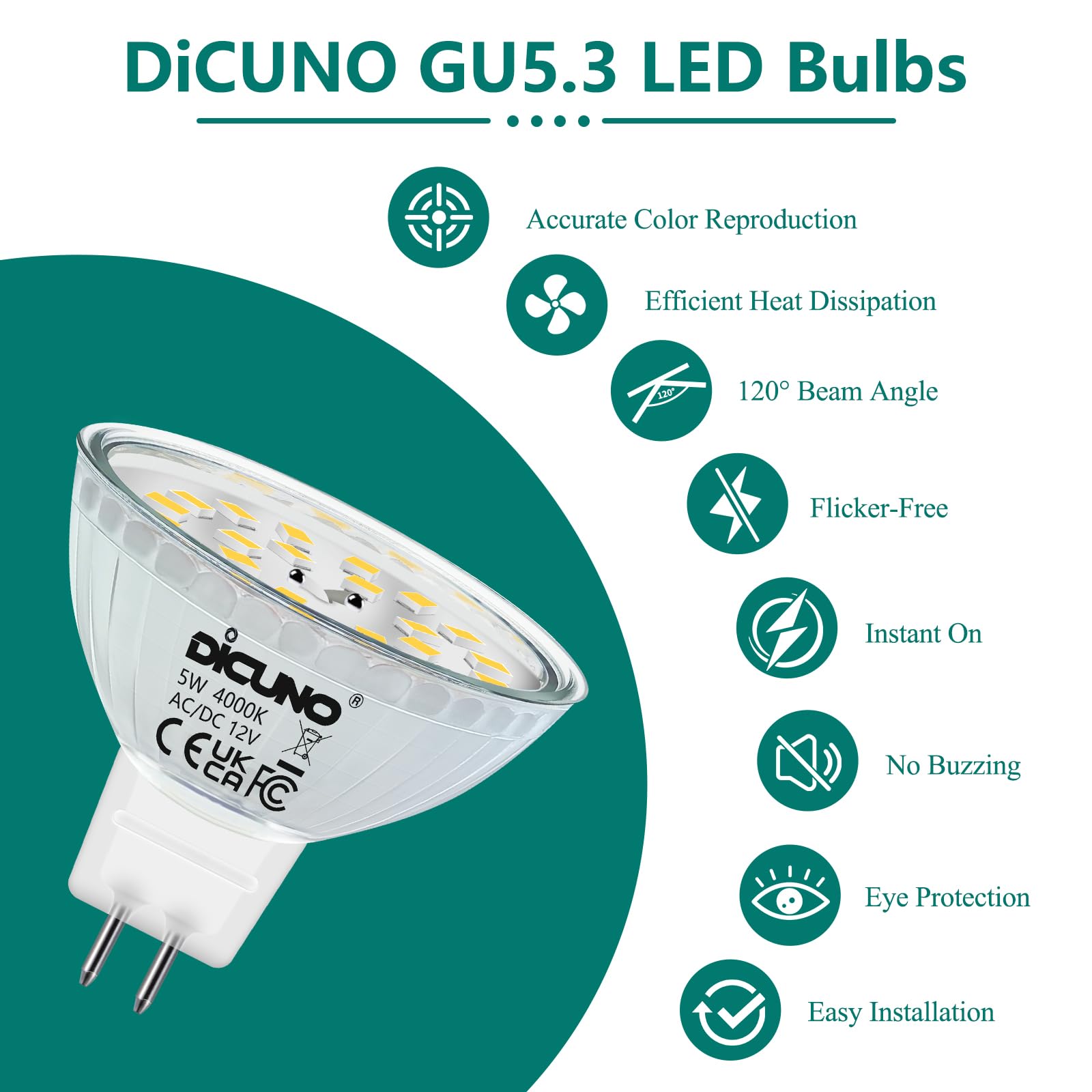 DiCUNO 12V GU5.3 5W LED Spots ersetzen eine 50W Halogenlampe und sparen bis zu 90% Energie. Mit einer Lebensdauer von 25.000 Stunden bieten sie flimmerfreies, Neutralweisses Licht (4000K) bei 500 Lumen und einem CRI über 80. Der 120° Abstrahlwinkel eignet sich perfekt für Einbaustrahler, Akzentbeleuchtung, Schienen- und Gartenbeleuchtung. Der GU5.3 Bi-Pin Sockel sorgt für einfache Installation und effiziente Wärmeableitung. LED-Transformator erforderlich, nicht dimmbar.