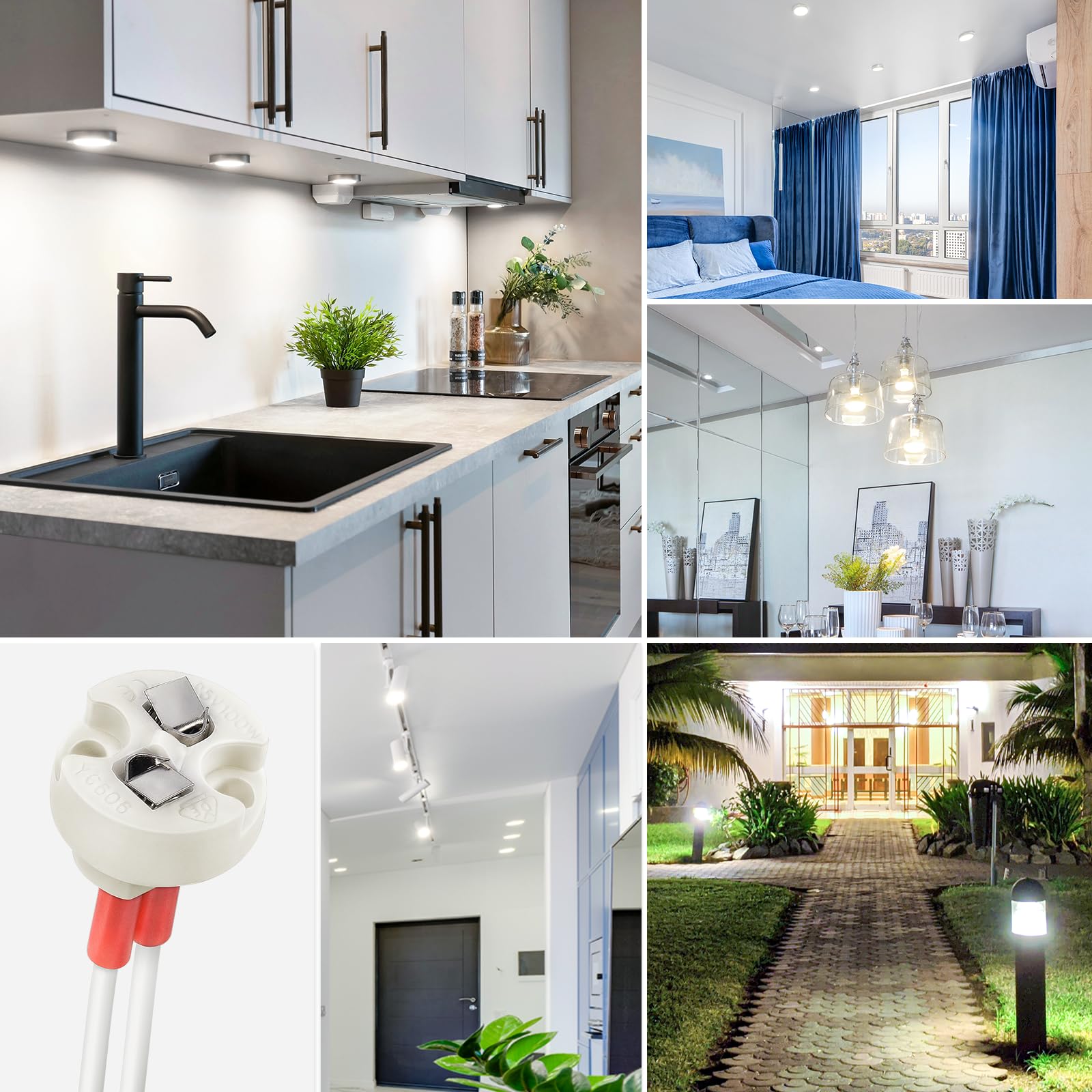 DiCUNO Bi-Pin-Fassungen mit 15-cm-Silikonkabeln sind kompatibel mit Lampen der Sockelarten G4, G6.35, GY6.35, GX5.3, GZ4, MR11 und MR16. Die Sockel sind mit Drähten aus reinem Kupfer und mit einer Hülle aus Silikon gefertigt. Dies gewährleistet eine lange Lebensdauer, gute Temperaturbeständigkeit und Sicherheit. Darüber hinaus zeichnen sie sich durch eine einfache Installation und vielfältige Einsatzmöglichkeiten aus.