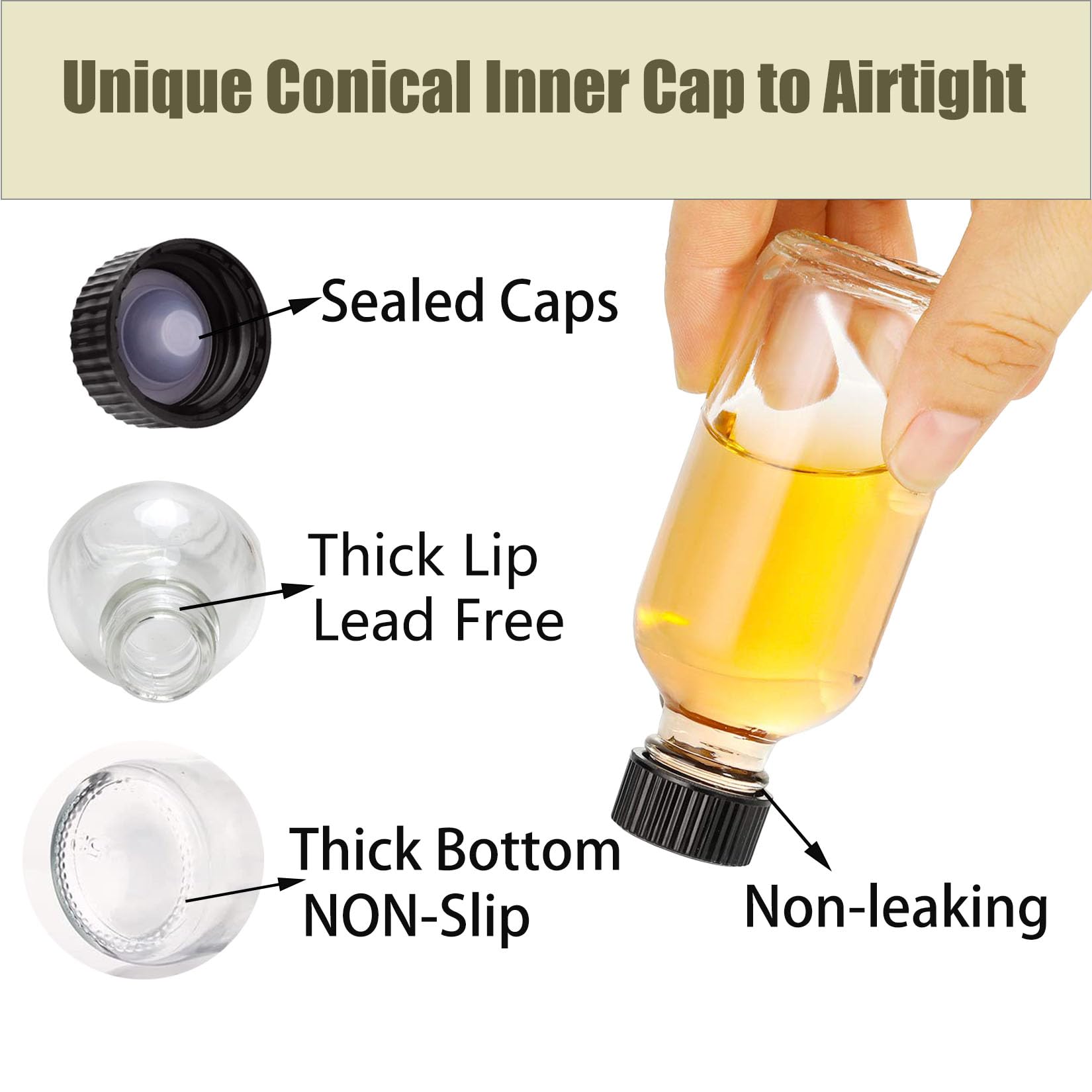 VIELSEITIG EINSETZBAR: Ideal als Shotflaschen, Gewuerzglaeser, Saft- und Wellness-Shots, Reise- und Probenflaschen, Deko- oder Laborflaschen. Geeignet fuer Fluessigkeiten, Oele, Sirup, Dressings, Gewuerze und Samen.