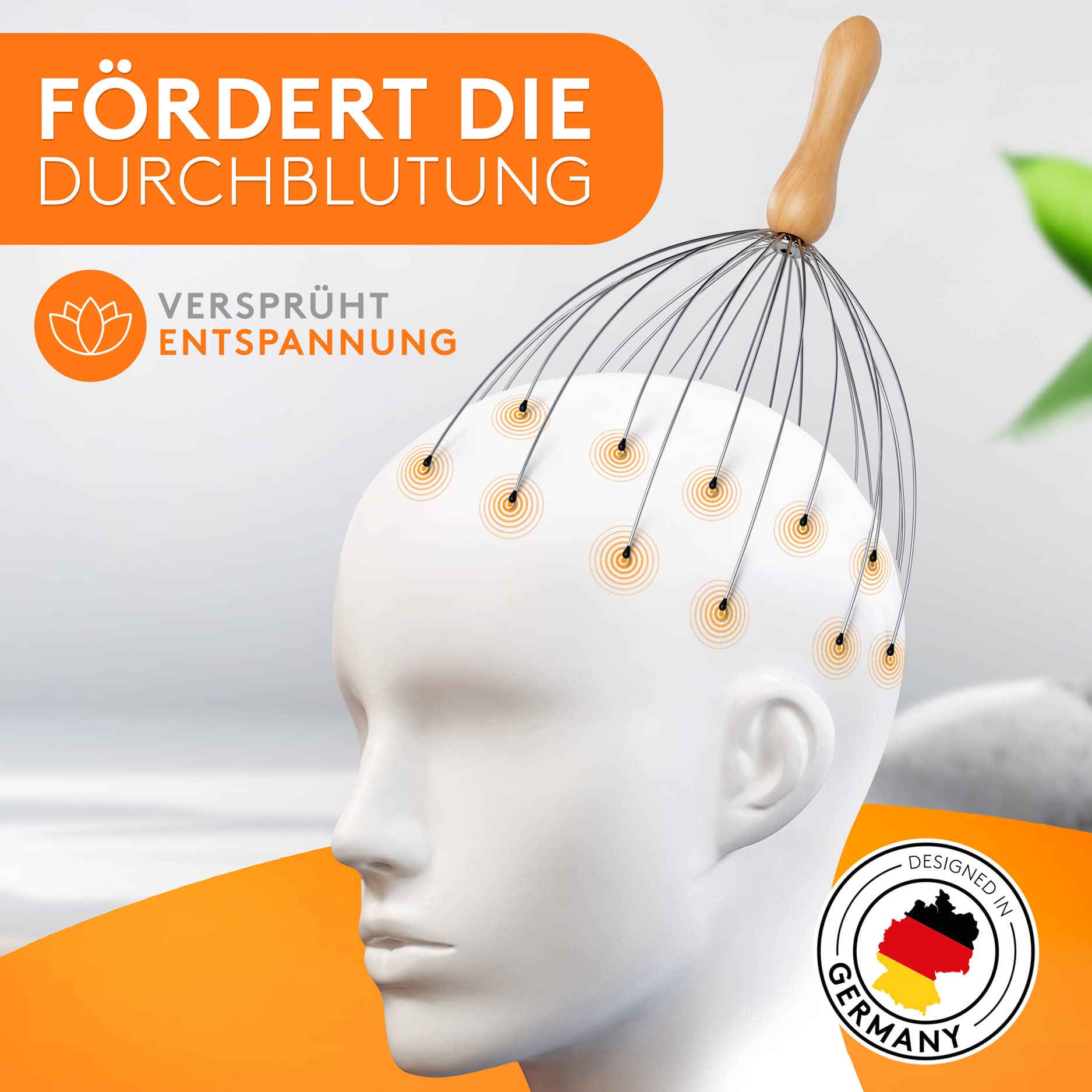 Die Massage kann die Durchblutung der Kopfhaut foerdern und hilft dabei, Spannungen im Kopf-, Nacken- und Schulterbereich zu loesen. Besonders nach langen Arbeitstagen, viel Bildschirmzeit oder mentalem Stress ist der Kopfkrauler ein schneller Weg zu mehr Ruhe und Entspannung. Da es sich um ein rein mechanisches Massagegeraet handelt, benoetigt es weder Strom noch Batterien und ist jederzeit einsatzbereit.
