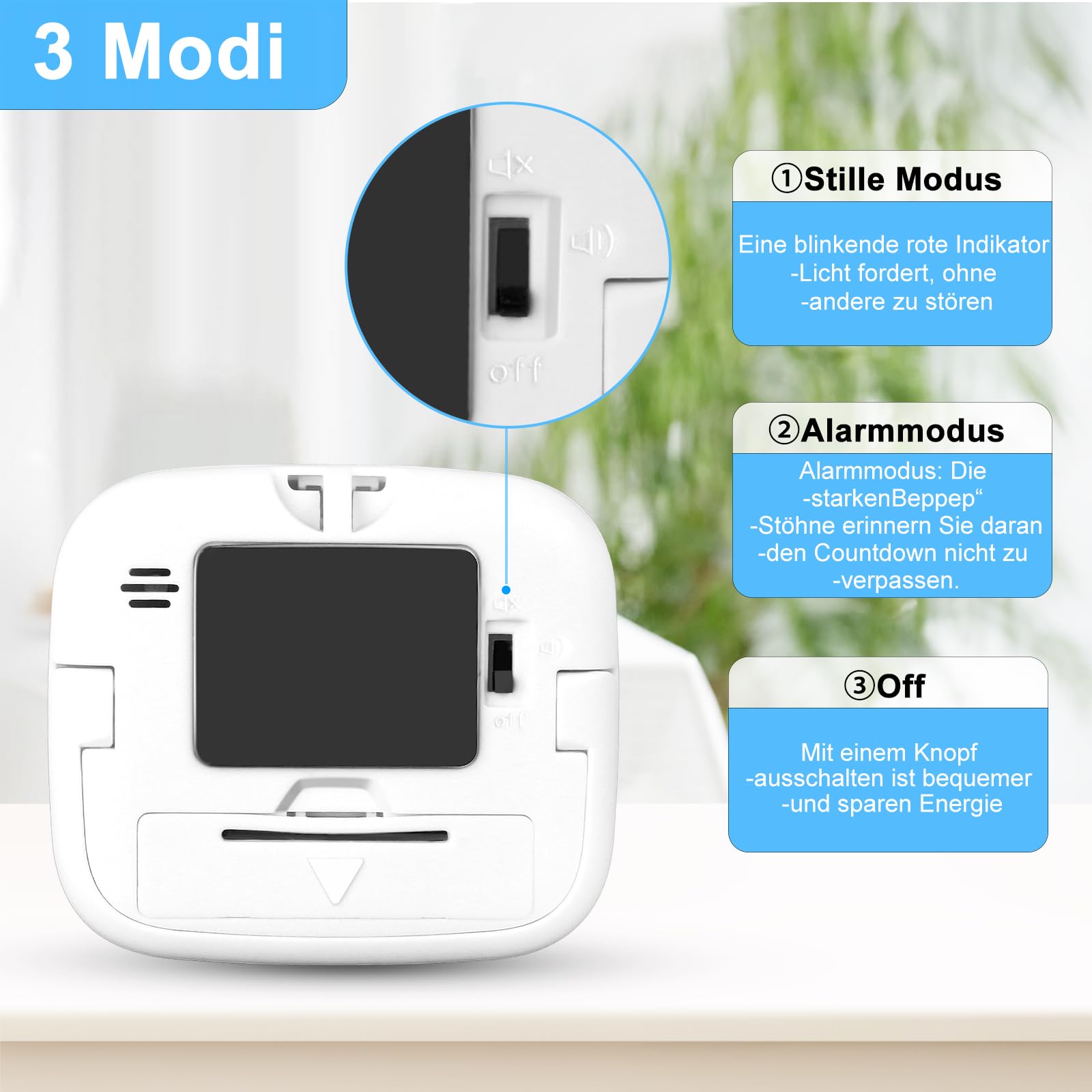 Multifunktion: Hoch und runter zählen; kann als normaler Wecker und Stoppuhr arbeiten