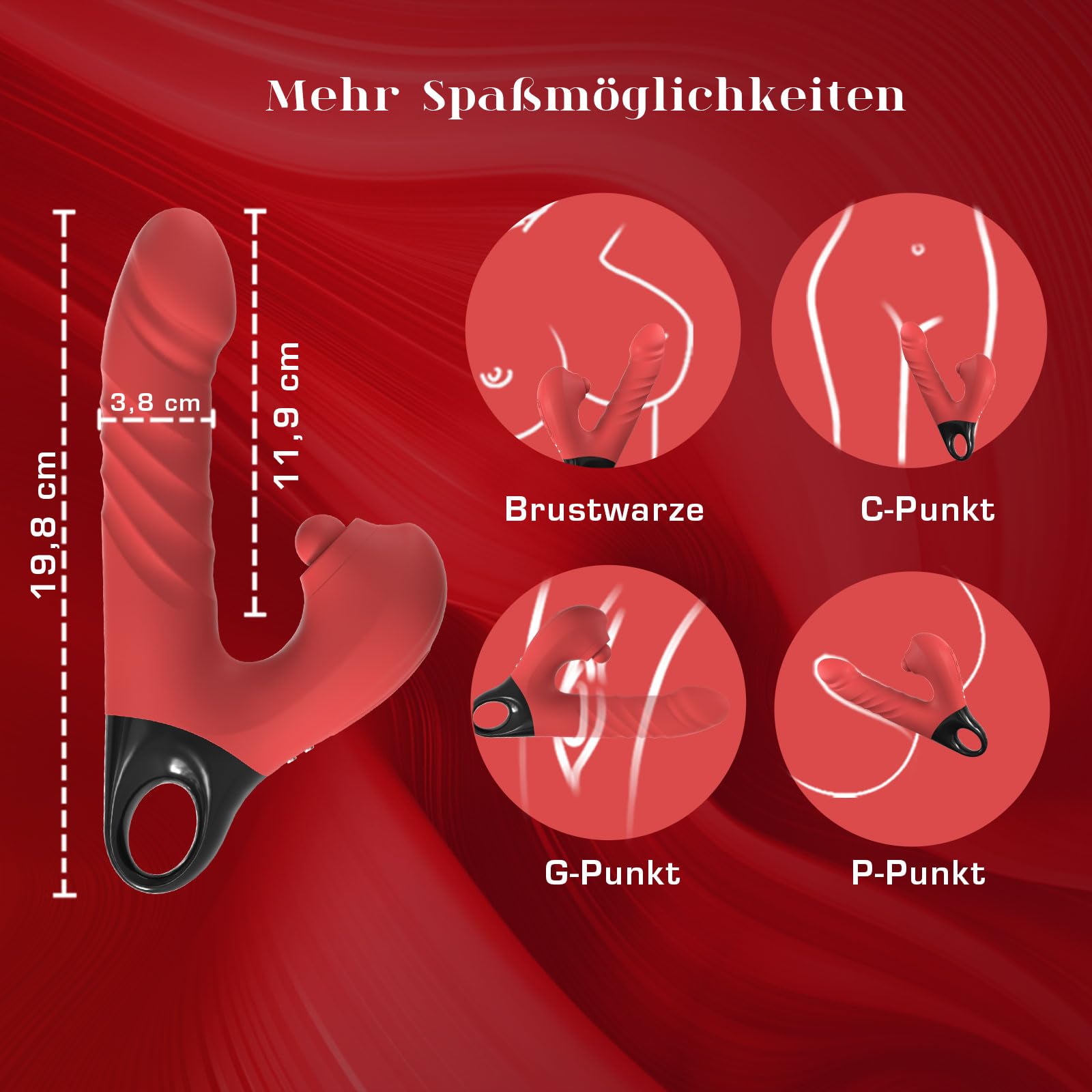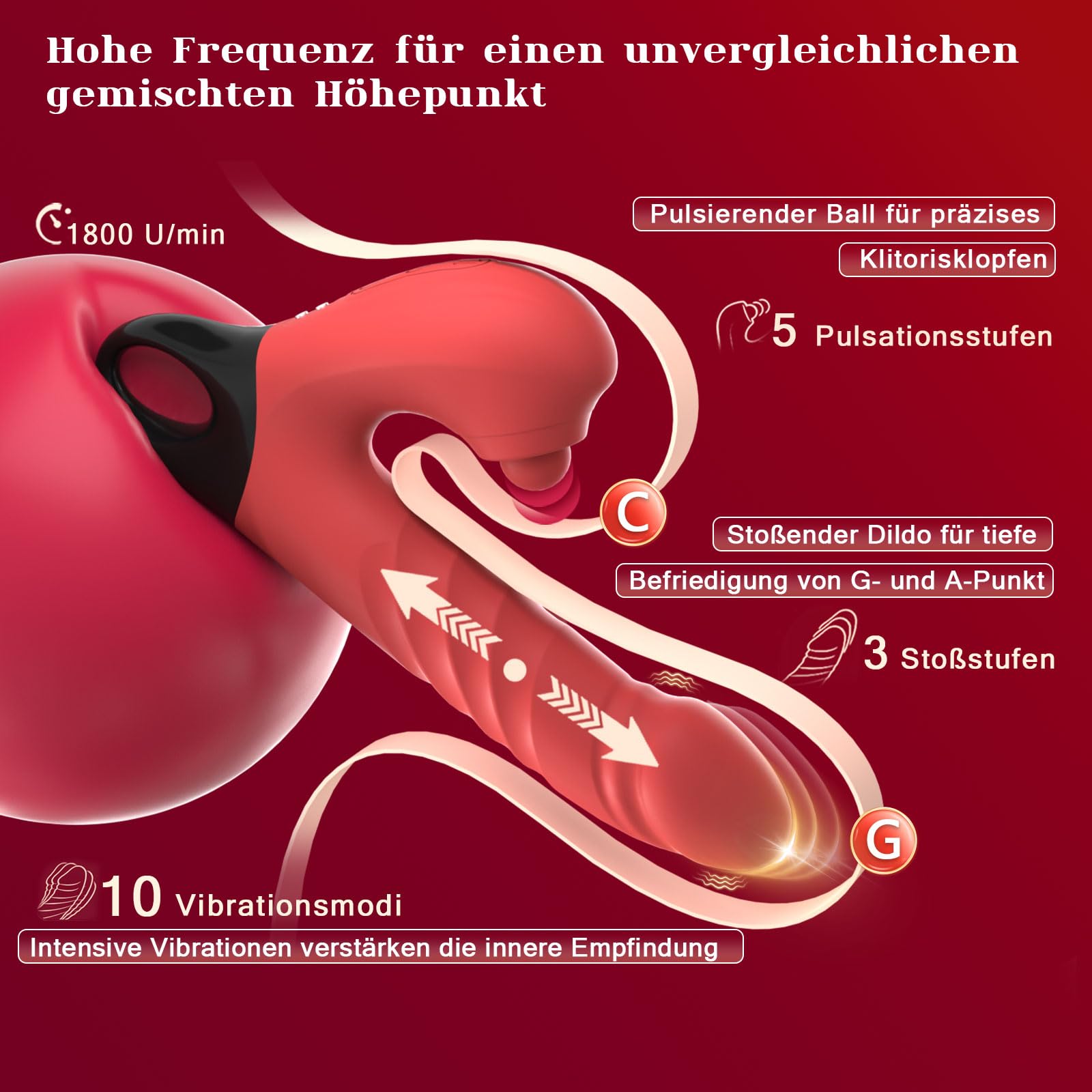 • 2 Motoren, 3 Stoss-, 5 Pulsations- und 10 Vibrationsmodi – 5 Pulsationsmodi für klitorale Stimulation, 3 Stossmodi und 10 Vibrationsmodi für den G-Punkt. Die Modi sind separat steuerbar und ermöglichen dutzende aufregende Kombinationen, um Ihre Favoriten zu entdecken.