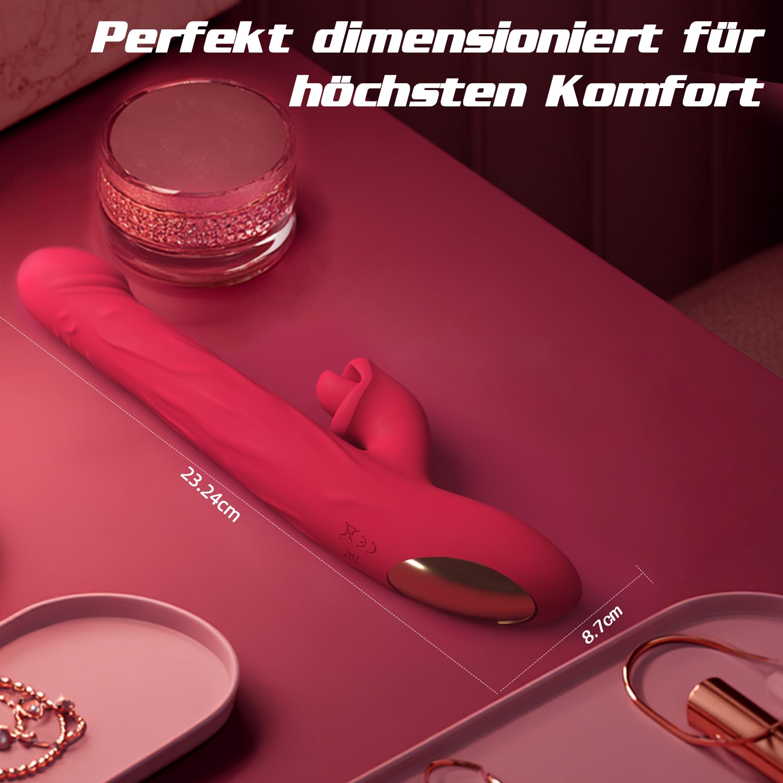 • Dreifache Stimulation - Spüre, wie der weiche Dildo mit „wriggling Bewegung“ tief in dich hineingleitet und mit lebensechter Stossbewegung gegen deinen G-Punkt drückt. Eine flackernde Zunge reizt deine Klitoris – sie kreist, flattert und lockt dich näher heran. Dann beginnt der Vibrator zu pulsieren und sich hochzuarbeiten, gleitet mit „wriggling Bewegung“ noch tiefer in deine Muschi – begleitet von wellenartigen Kontraktionen, die deine süssesten Stellen erreichen und intensiv durchdrücken.
