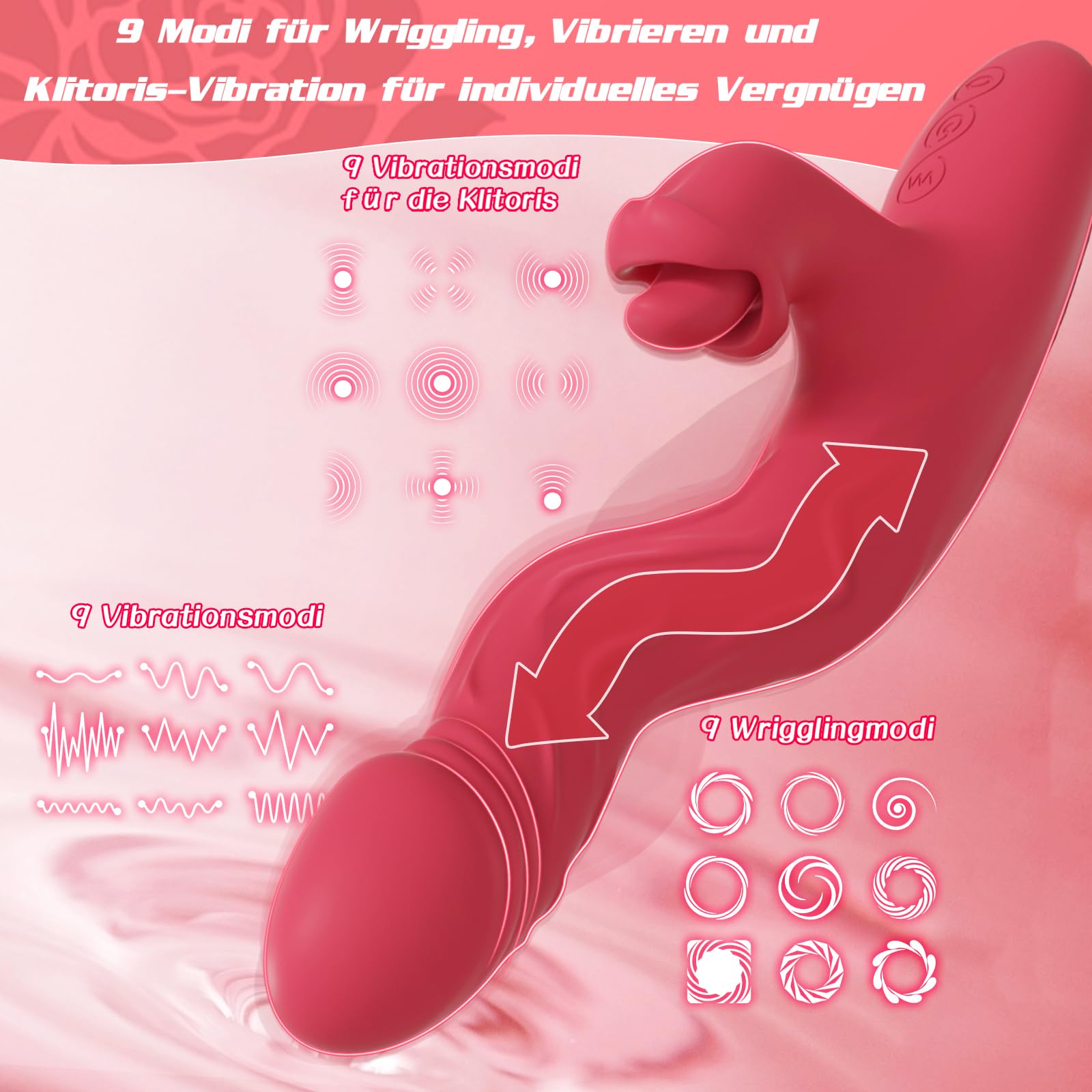 • Dreifache Power - 9 wriggling Modi krümmen sich und pulsieren tief gegen deinen G-Punkt – und entfachen Lust von innen heraus. 9 Intensitätsstufen tiefer Vibration durchströmen deine Klitoris – zuerst sanft, dann hämmernd in pochenden Wellen. Dazu kommen 9 Leckmuster, die dich reizen, flattern und schnipsen, bis du nur noch nach Erlösung keuchst.