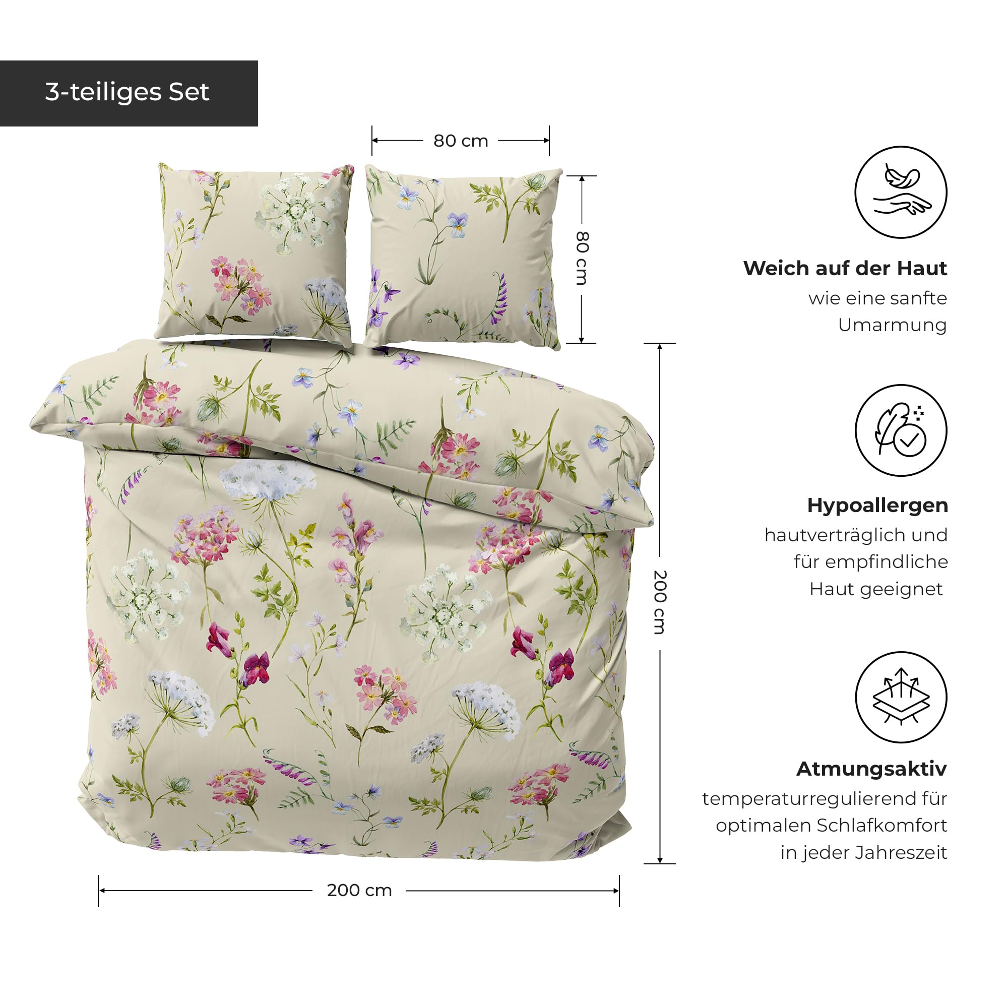DILIOS Premium Bettwäsche 200x200, Blumen Beige Botanik 100% Atmungsaktive Angenehme Baumwolle mit Reissverschluss, Renforcé, 2teilig Bettbezug 200 x 200 cm + Kissenbezug 80 x 80…