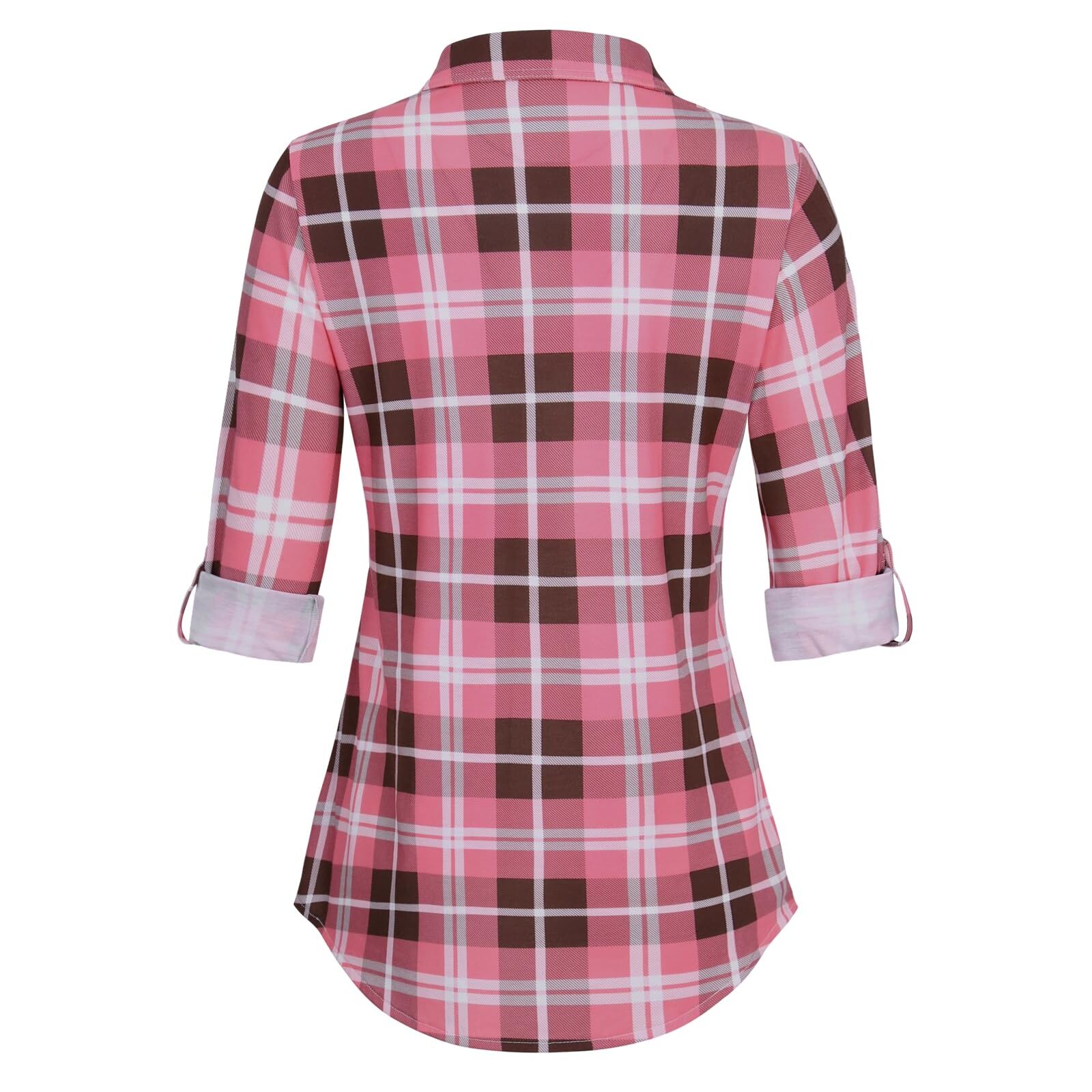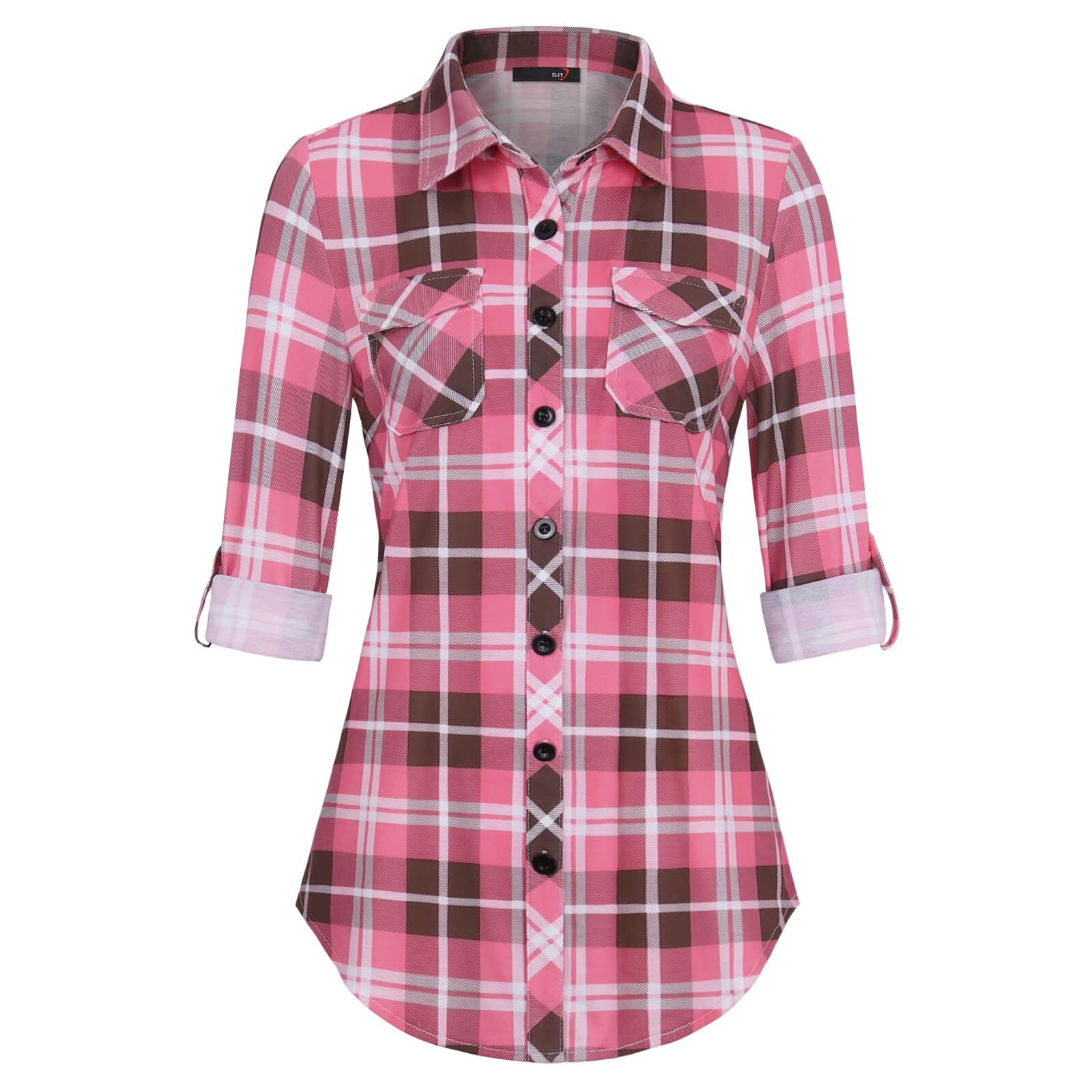 DJT Damen Weiches Gestrick Kariertes Blusen Langarm Oberteile Roll Up Ärmel Hemdbluse Button Down Tops