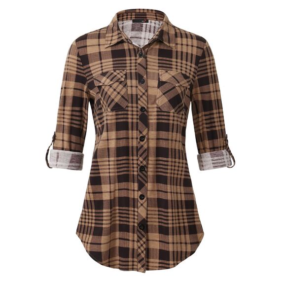 DJT Damen Weiches Gestrick Kariertes Blusen Langarm Oberteile Roll Up Ärmel Hemdbluse Button Down Tops