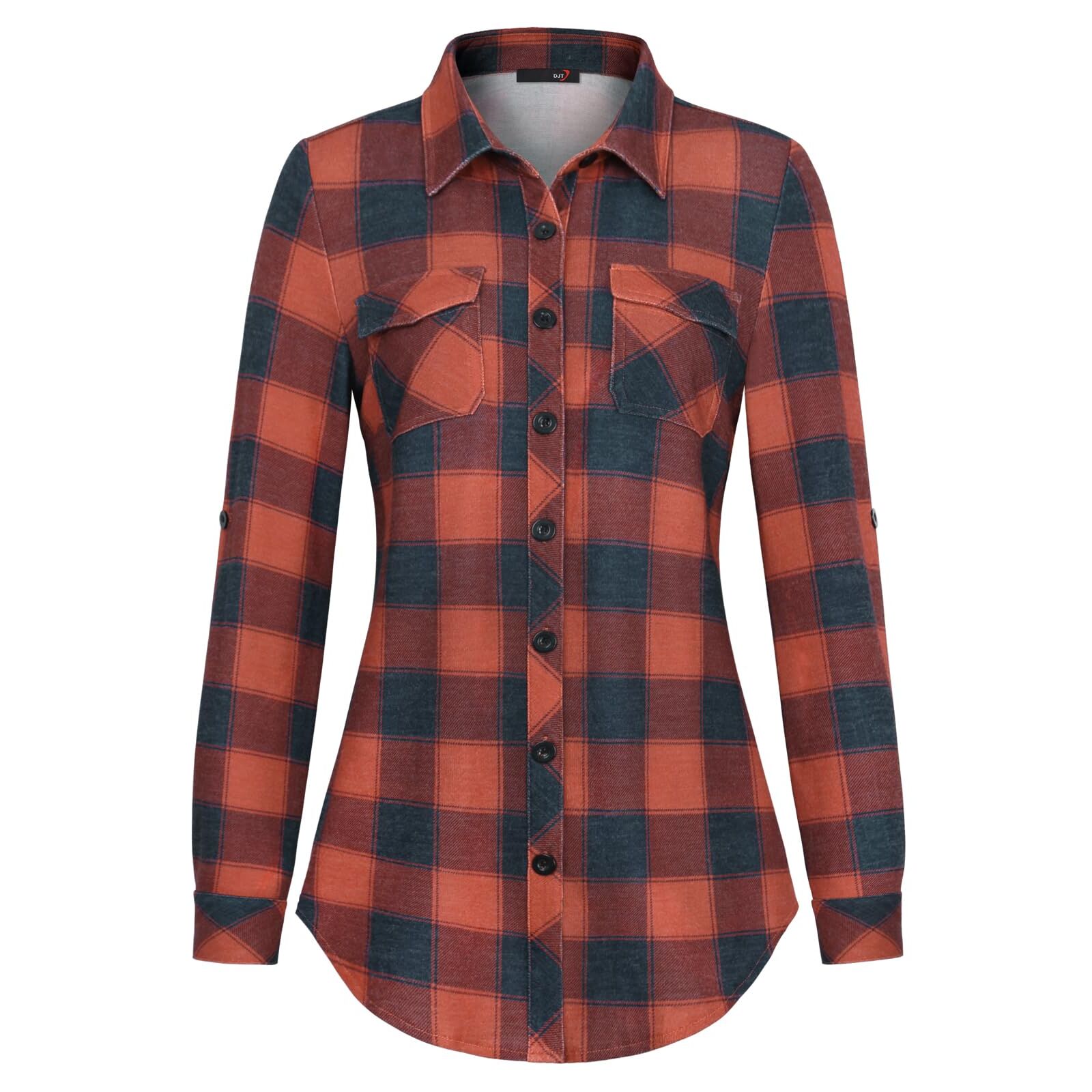 DJT Damen Weiches Gestrick Kariertes Blusen Langarm Oberteile Roll Up Ärmel Hemdbluse Button Down Tops
