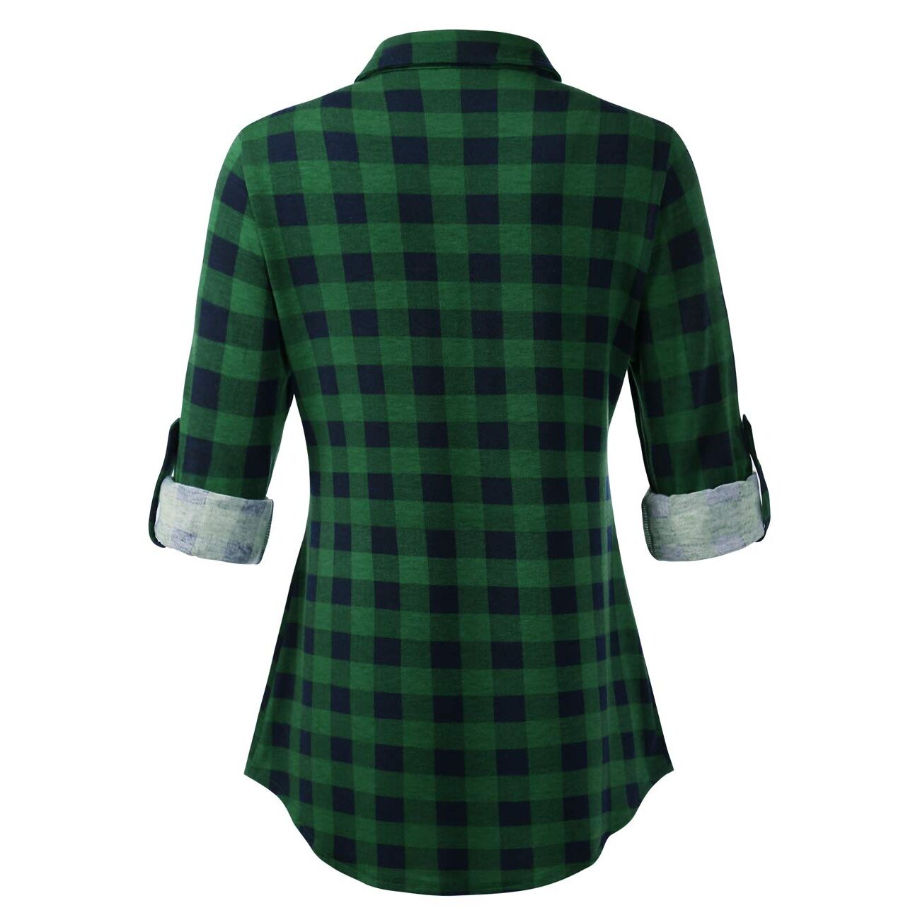 DJT Damen Weiches Gestrick Kariertes Blusen Langarm Oberteile Roll Up Ärmel Hemdbluse Button Down Tops