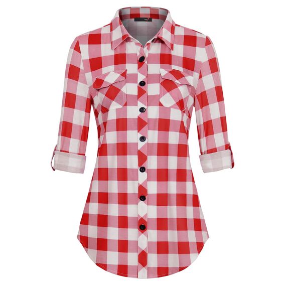 DJT Damen Weiches Gestrick Kariertes Blusen Langarm Oberteile Roll Up Ärmel Hemdbluse Button Down Tops
