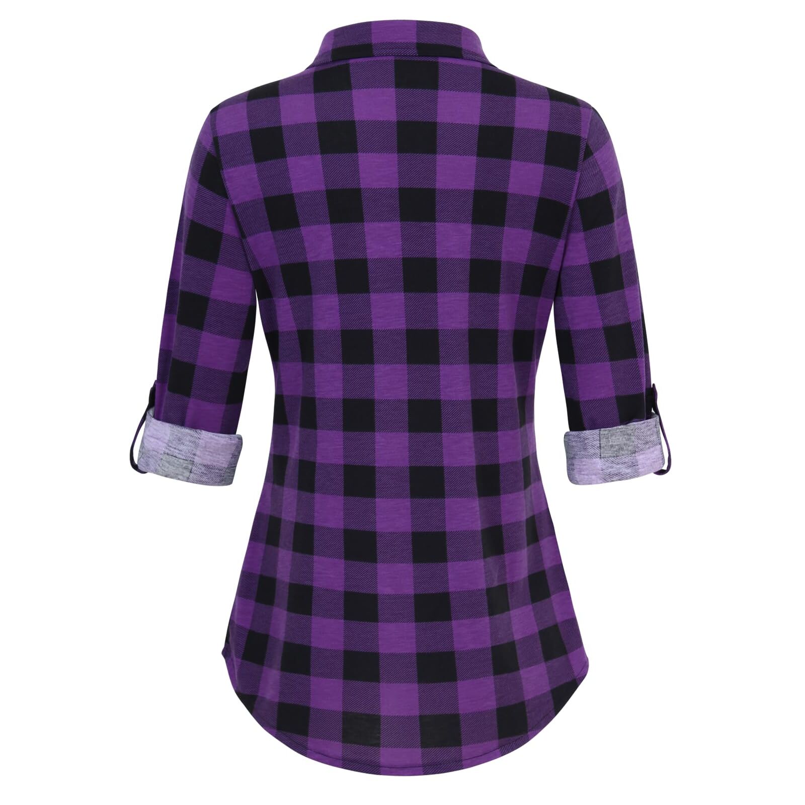 DJT Damen Weiches Gestrick Kariertes Blusen Langarm Oberteile Roll Up Ärmel Hemdbluse Button Down Tops
