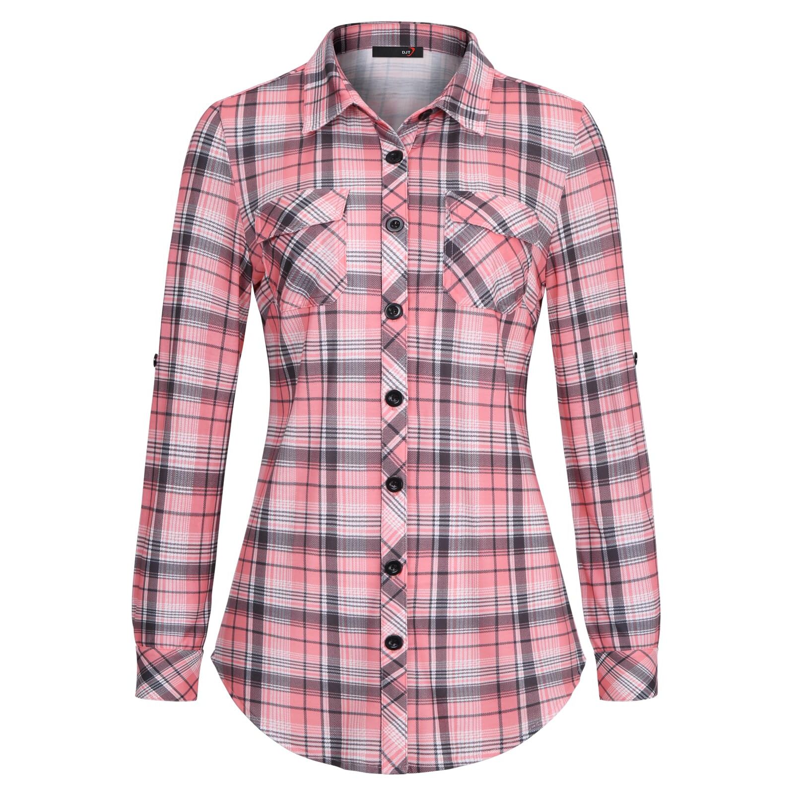 DJT Damen Weiches Gestrick Kariertes Blusen Langarm Oberteile Roll Up Ärmel Hemdbluse Button Down Tops