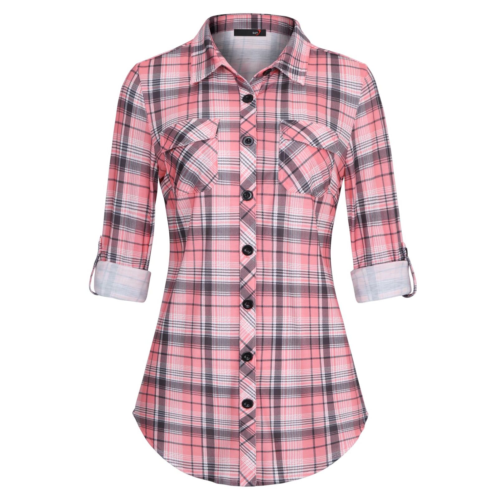 DJT Damen Weiches Gestrick Kariertes Blusen Langarm Oberteile Roll Up Ärmel Hemdbluse Button Down Tops