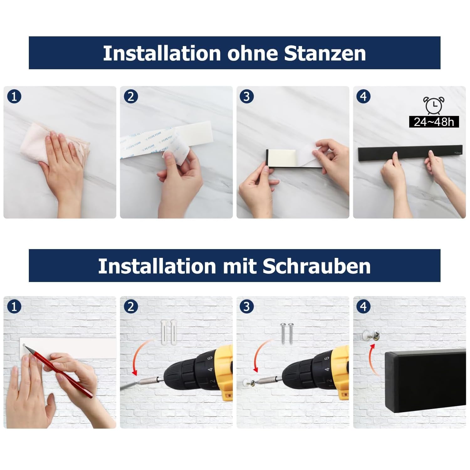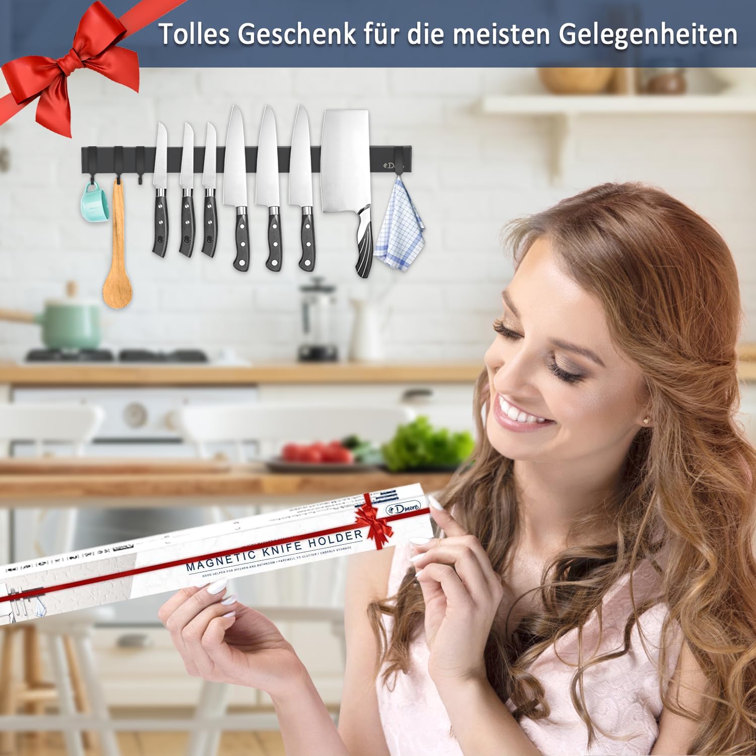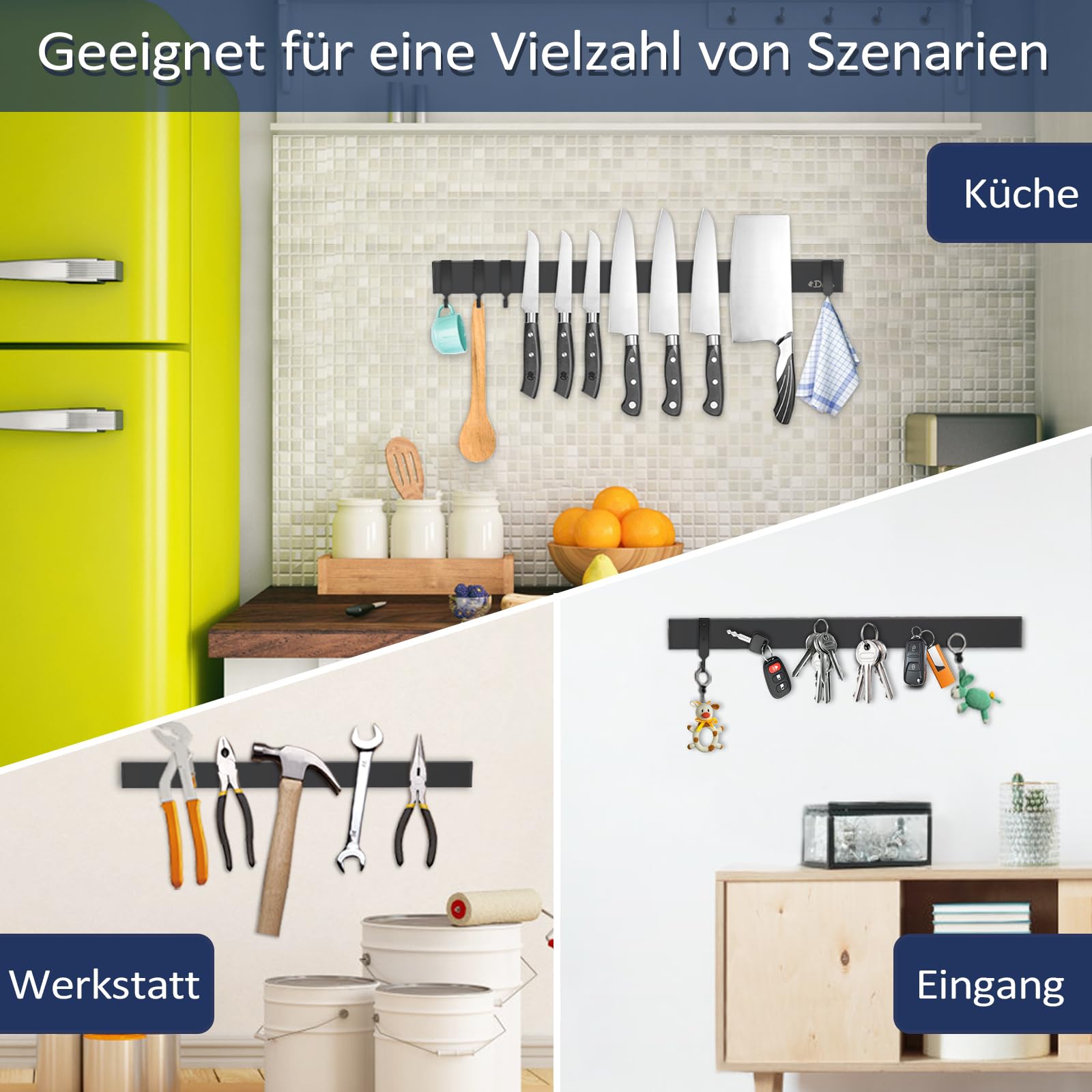 Dmore 50 cm Magnetleiste Messer mit 4 Haken, schwarzer Messerhalter magnetisch ohne Bohren, leistungsstarker Magnet Messerhalter, inklusive Klebeband und Schrauben für Messer, Utensilien und Werkzeuge