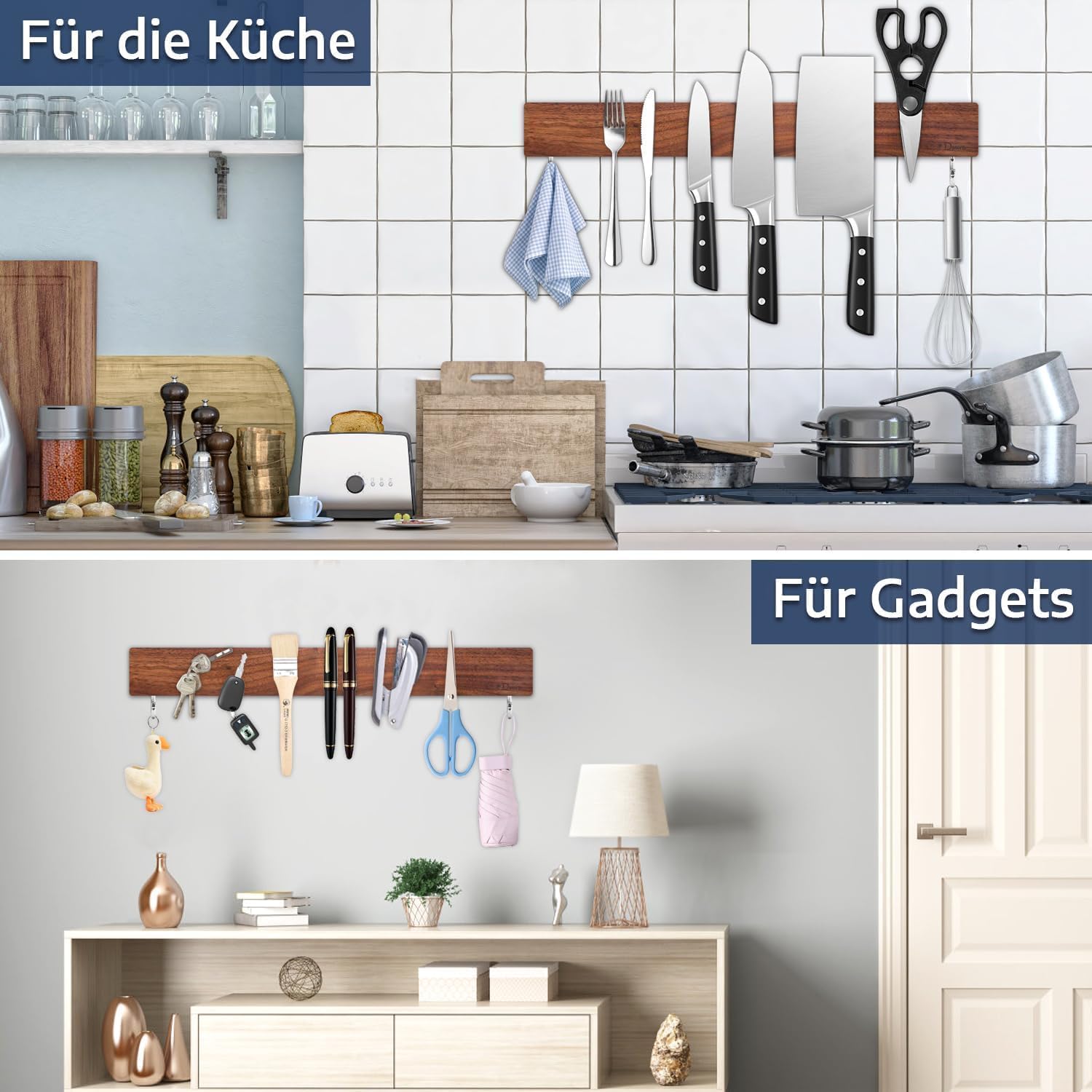 Dmore 40 cm Magnetleiste Messer mit 2 Haken, Messerhalter magnetisch aus Walnuss ohne Bohren, leistungsstarker Magnet Messerhalter, inklusive Klebeband und Schrauben für Messer, Utensilien
