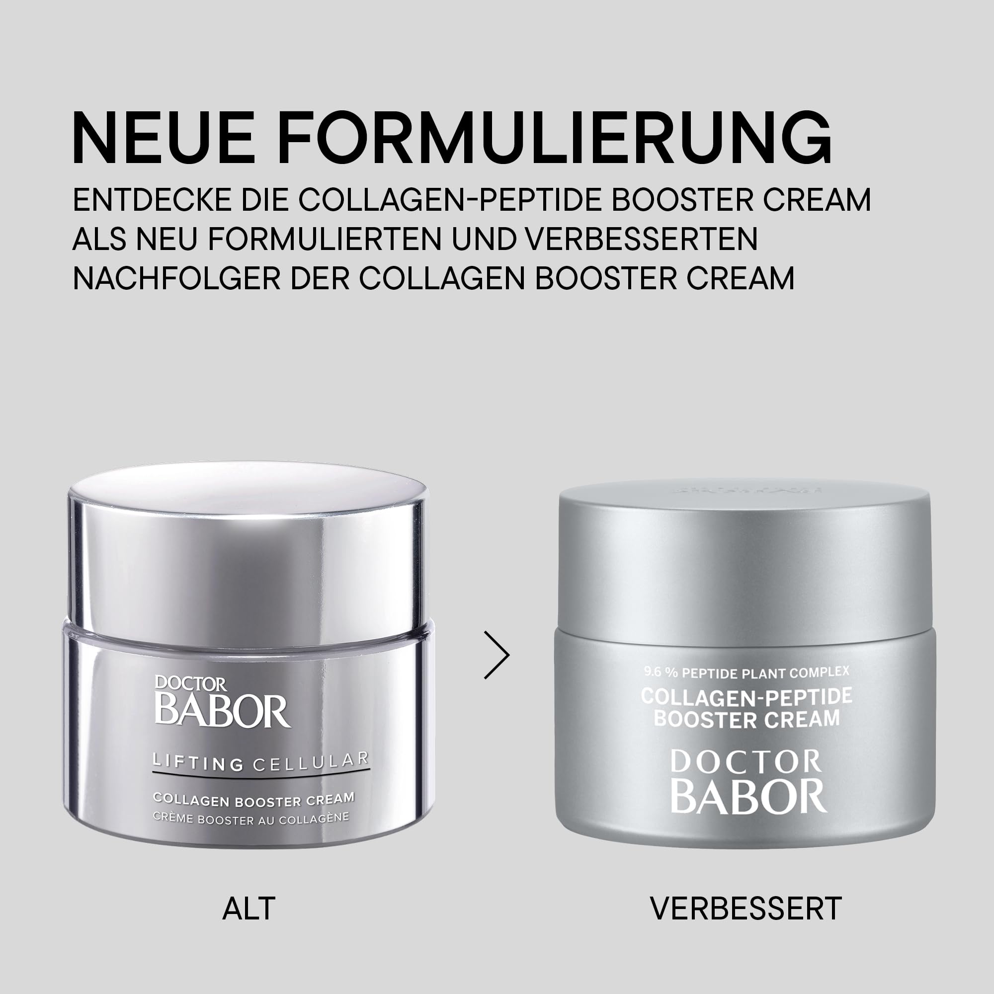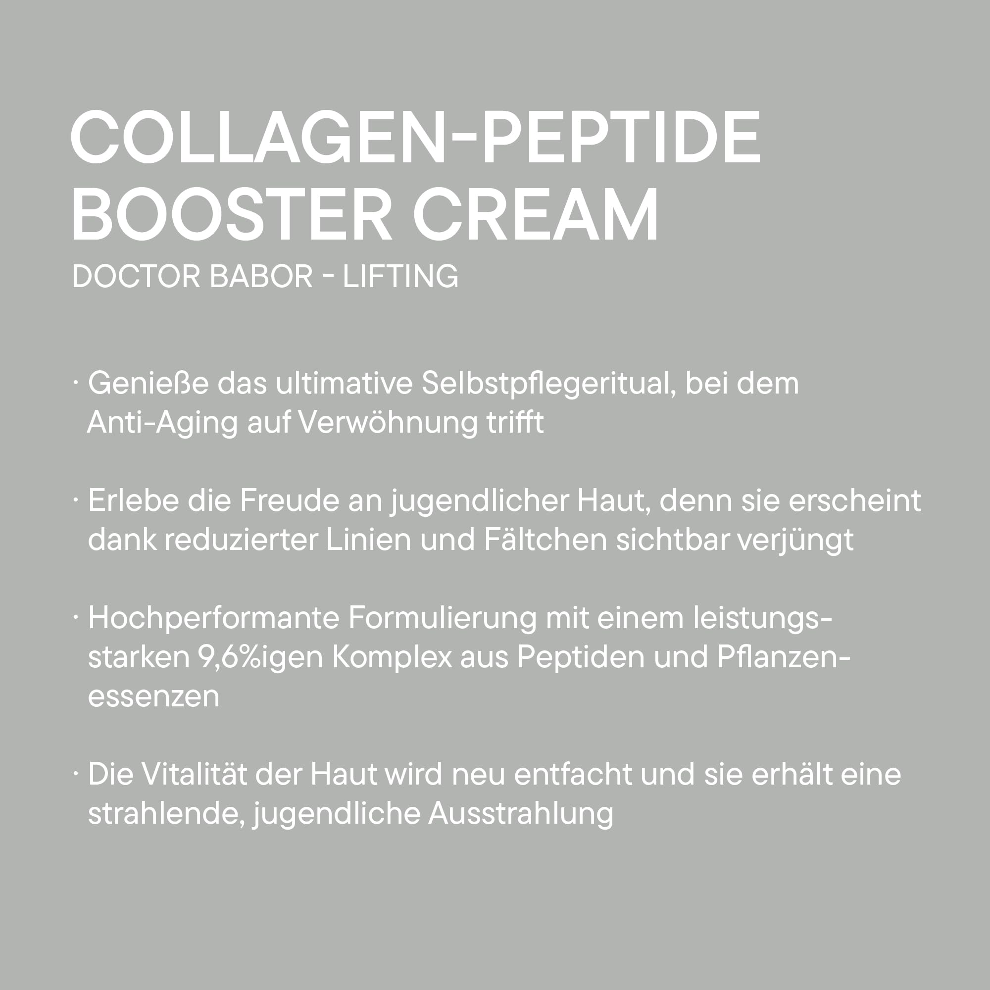 Die Doctor Babor Collagen-Peptide Booster Cream ist eine hochwirksame, vegane Gesichtscreme, die speziell entwickelt wurde, um den Zeichen der Hautalterung entgegenzuwirken. Als Herzstück der Lifting-Serie von Doctor Babor kombiniert sie modernste Peptid-Technologie mit pflanzlichen Wirkstoffen, um die hauteigene Kollagenproduktion zu reaktivieren und die Hautstruktur tiefgreifend zu festigen.