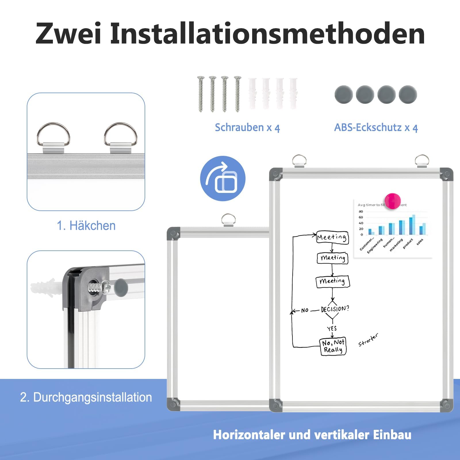 • 【Flexible Montage】Das magnetische Whiteboard kann mit den im Lieferumfang enthaltenen beweglichen Haken an der Wand aufgehängt werden – das ist flexibler und beschädigt die Wand nicht. Alternativ kann das Whiteboard magnetisch auch mit Schrauben an der Wand befestigt werden. In beiden Fällen lässt sich die Magnettafel sowohl vertikal als auch horizontal montieren. Passen Sie das White board ganz nach Ihren Bedürfnissen an!