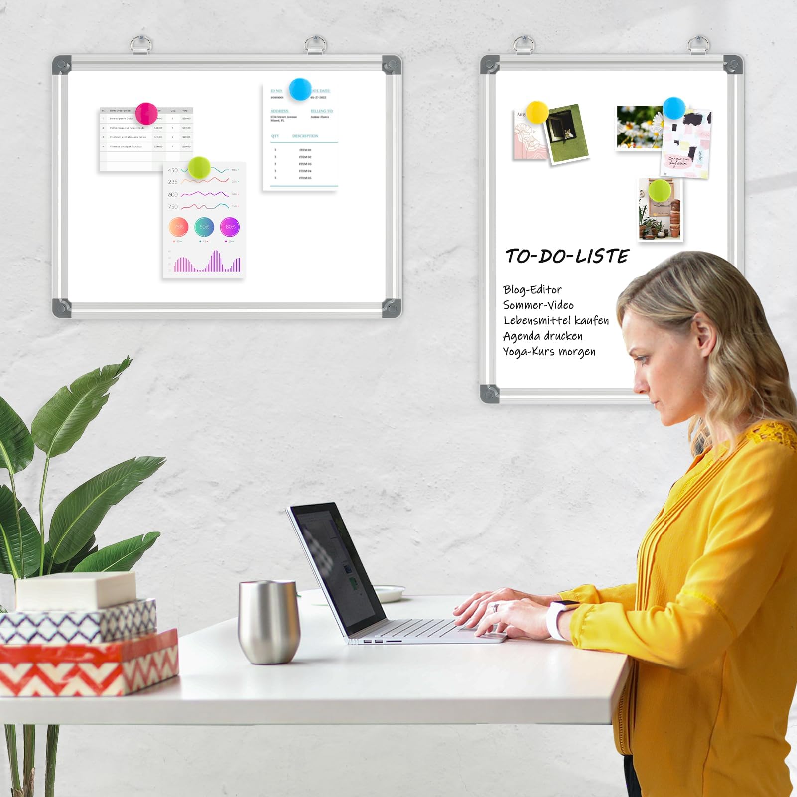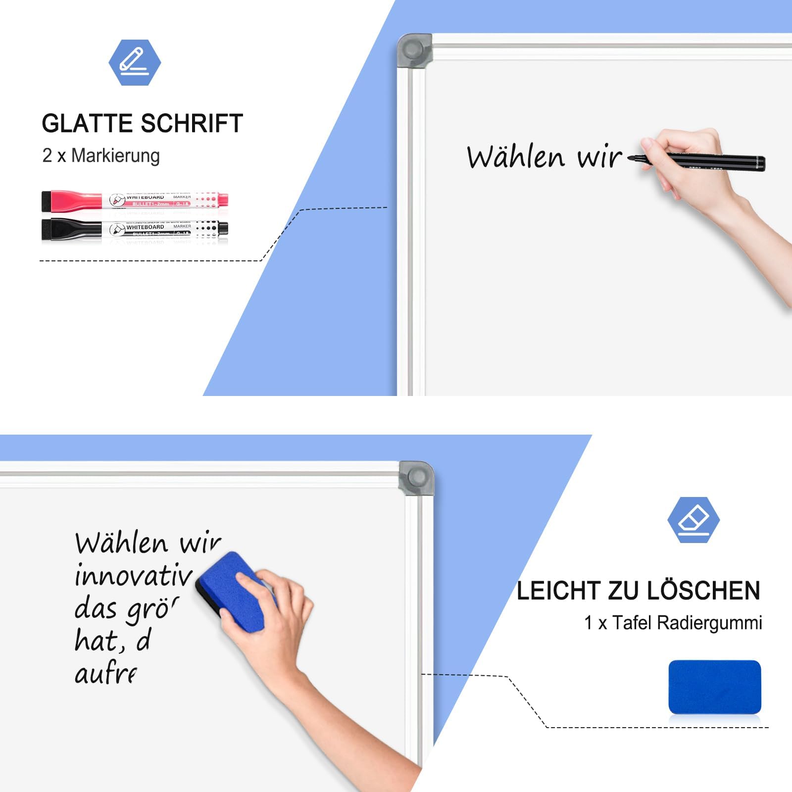 • 【Doppelseitiges Whiteboard Magnetisch】Die magnetische Oberfläche kann verwendet werden, um Ihre Fotos, Post-Memo-Poster und wichtige Informationen auf dem Whiteboard anzuzeigen. Die Oberfläche wurde aus hochwertigem, weiss lackiertem Blech hergestellt, einfach zu schreiben und abzuwischen, ohne Flecken zu hinterlassen. Sie erhalten 8 Magnete als Zubehör für alle Notizen oder Fotos, die Sie aufhängen möchten.