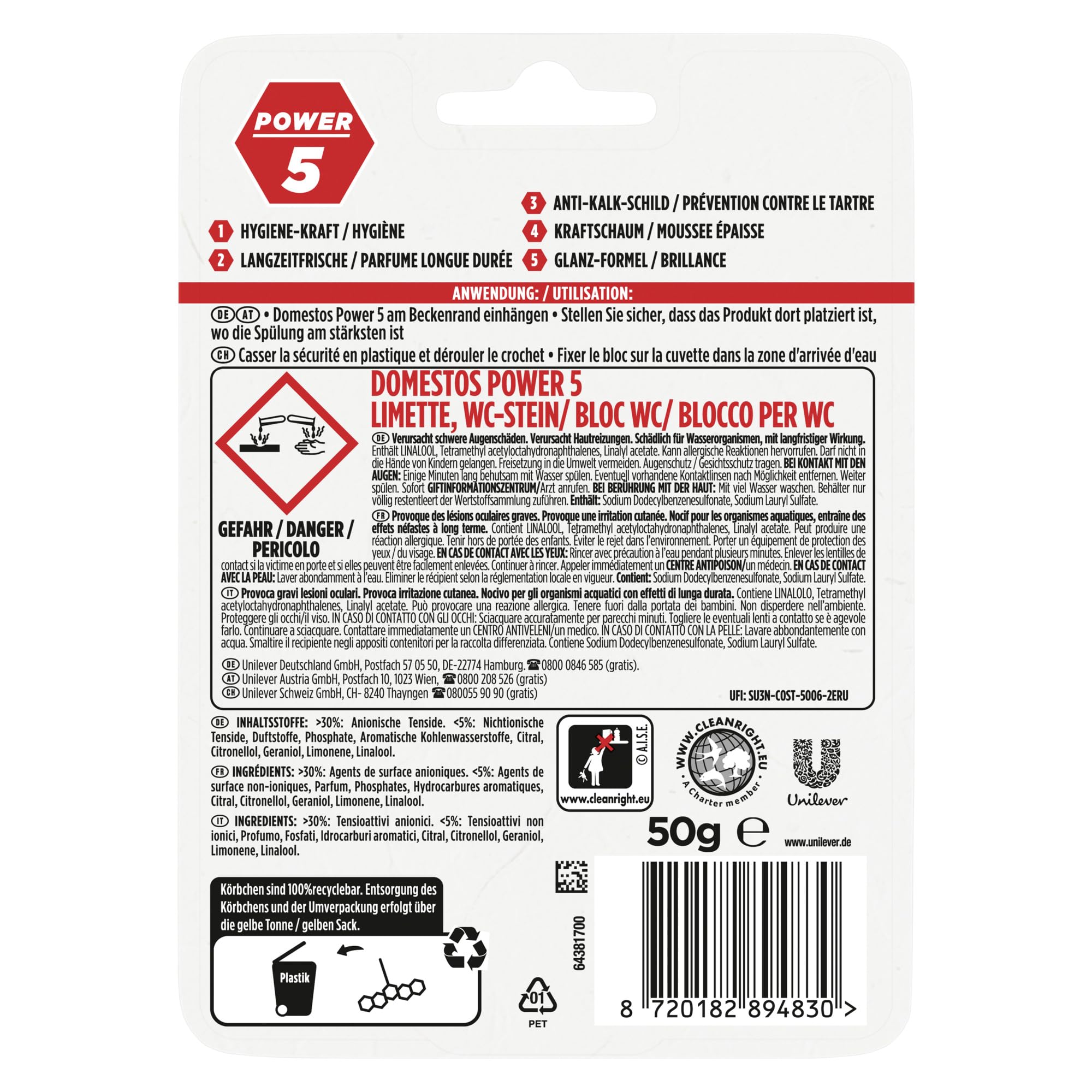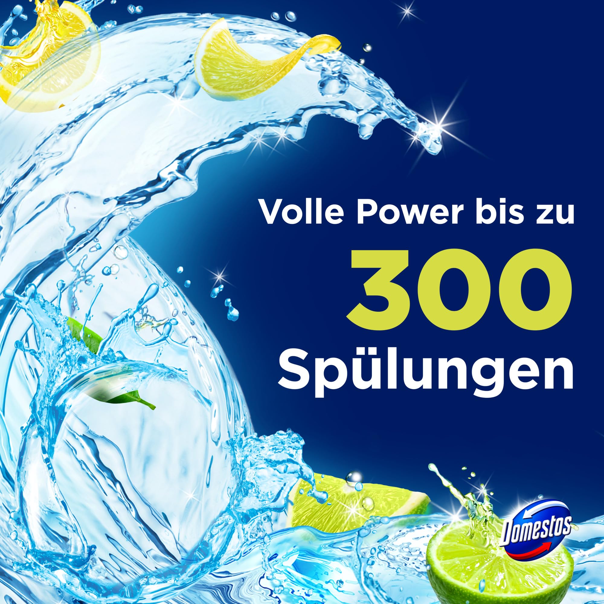 Der Domestos Power 5 WC Stein Limette hält die Toilette sauber, glänzend und frisch. Der WC Reiniger ist mehr als nur ein WC Stein: Der angenehme, langanhaltende Duft nach fruchtigen Limetten, wirkt auch zwischen den Spülungen und verspricht kraftvolle Frische und Sauberkeit für das WC. Domestos Power 5 steht dabei für Hygiene-Kraft, Langzeitfrische, Anti-Kalk-Schutz, Kraftschaum und Glanz-Formel. Spülung für Spülung gibt der Domestos WC Reiniger einen reichhaltigen Schaum frei, schützt vor Kalkablagerungen und entfernt Schmutz. Zudem lässt er die Toilettenschüssel strahlend glänzen und sorgt für einen intensiven und langanhaltenden Limetten-Duft im Badezimmer, auch zwischen den Spülungen. Mit dem zu 100% recycelbaren Plastikkörbchen ist der Domestos Toilettenstein eine effektive und nachhaltige Lösung für die WC Pflege. Anwendung: Den Bügel am Domestos WC-Stein-Körbchen entfalten und das Körbchen dort am Beckenrand einhängen, wo die Spülung am stärksten ist. Anschliessend gründlich mit klarem Wasser die Hände waschen. Zum Schluss einfach und umweltschonend Umverpackung und nach Gebrauch das leere Plastikkörbchen über die Recyclingsysteme entsorgen. Doppelt hält besser! Domestos Kraft & Frische WC-Gel und Domestos Power 5 WC-Steine sind das Power-Duo für Sauberkeit und Frische im Badezimmer. Wir haben unsere Toilettenreiniger und Toilettensteine für eine perfekte WC-Hygiene entwickelt: Das kraftvolle WC-Gel entfernt 99,99% der Bakterien und spezielle Viren*, hartnäckigen Schmutz sowie Kalkablagerungen und bildet ein Schutzschild gegen die Neubildung von Kalk. *Wirksam gegen behüllte Viren, gemäss EN 14476 und EN 16777