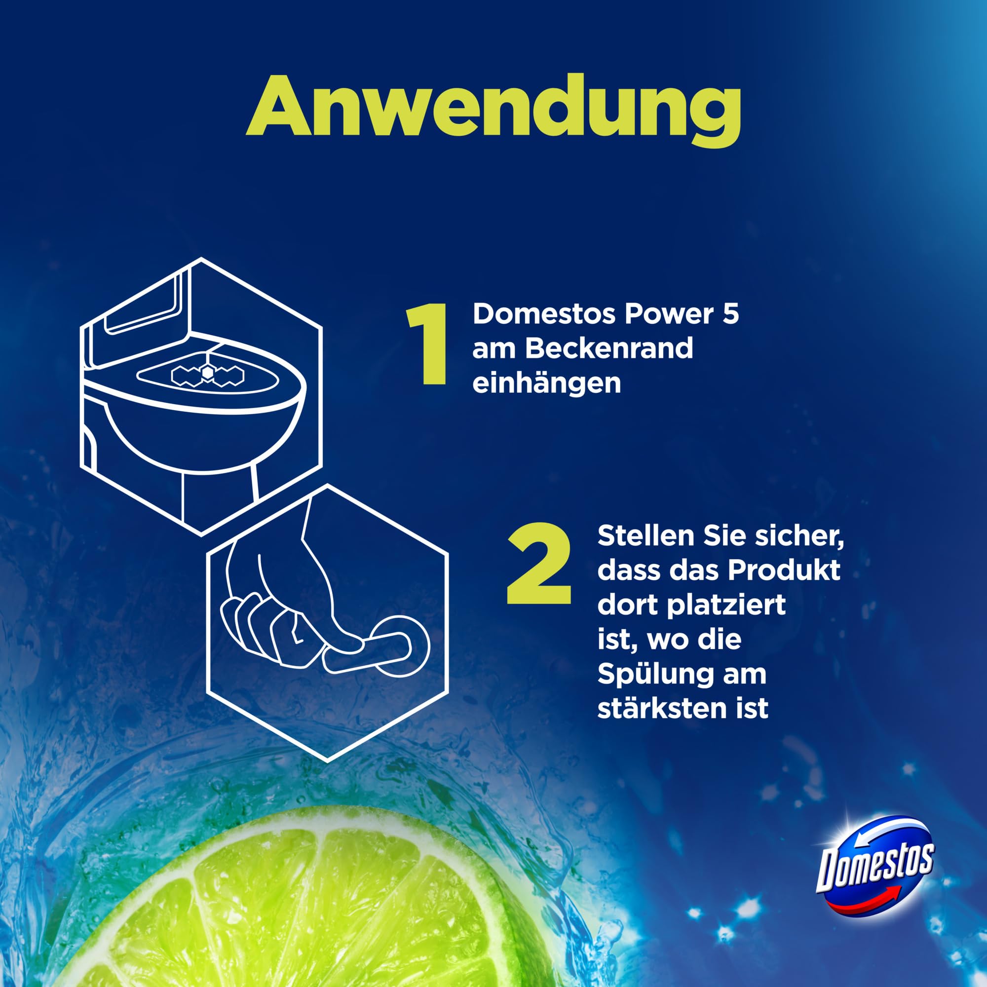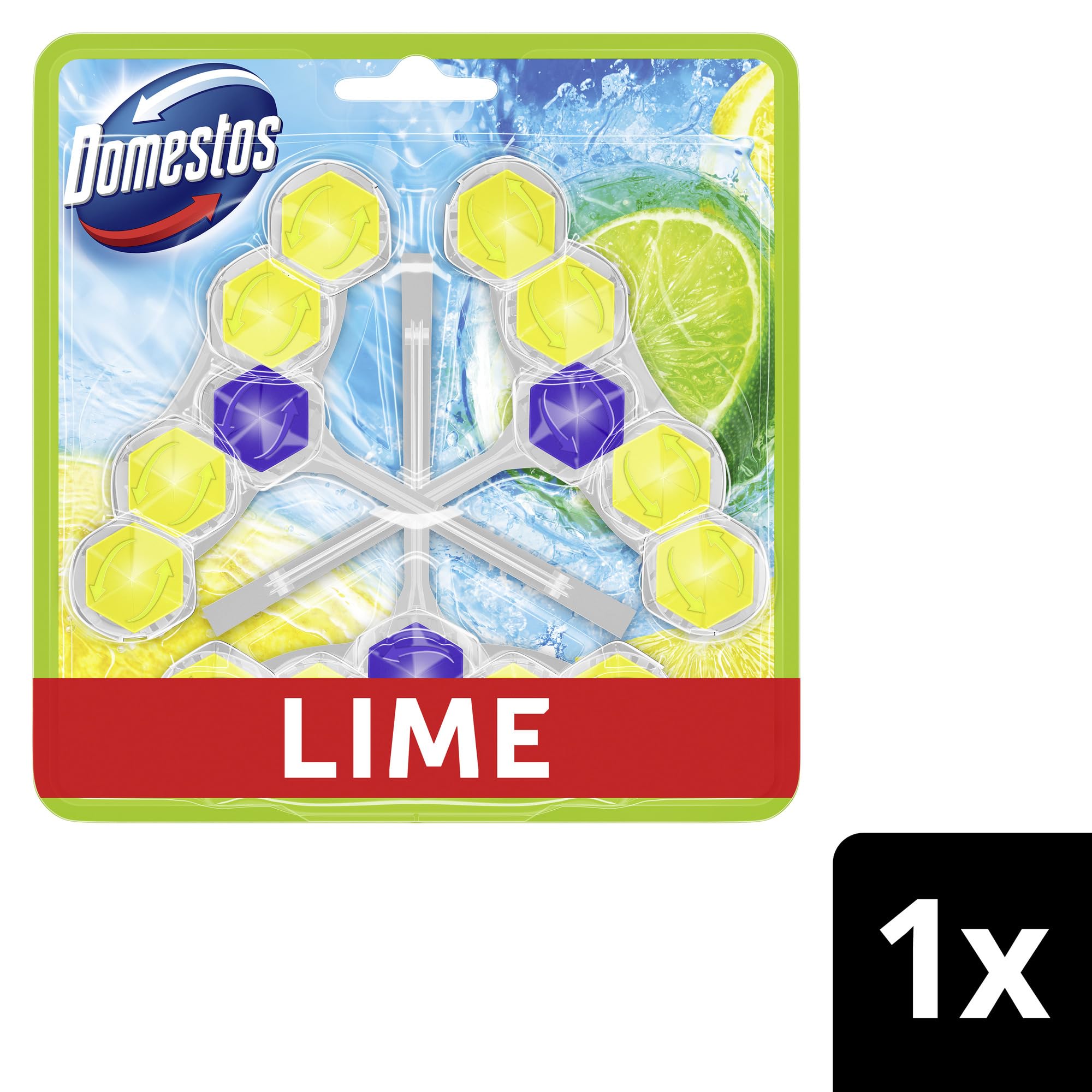 Der Domestos Power 5 WC Stein Limette hält die Toilette sauber, glänzend und frisch. Der WC Reiniger ist mehr als nur ein WC Stein: Der angenehme, langanhaltende Duft nach fruchtigen Limetten, wirkt auch zwischen den Spülungen und verspricht kraftvolle Frische und Sauberkeit für das WC. Domestos Power 5 steht dabei für Hygiene-Kraft, Langzeitfrische, Anti-Kalk-Schutz, Kraftschaum und Glanz-Formel. Spülung für Spülung gibt der Domestos WC Reiniger einen reichhaltigen Schaum frei, schützt vor Kalkablagerungen und entfernt Schmutz. Zudem lässt er die Toilettenschüssel strahlend glänzen und sorgt für einen intensiven und langanhaltenden Limetten-Duft im Badezimmer, auch zwischen den Spülungen. Mit dem zu 100% recycelbaren Plastikkörbchen ist der Domestos Toilettenstein eine effektive und nachhaltige Lösung für die WC Pflege. Anwendung: Den Bügel am Domestos WC-Stein-Körbchen entfalten und das Körbchen dort am Beckenrand einhängen, wo die Spülung am stärksten ist. Anschliessend gründlich mit klarem Wasser die Hände waschen. Zum Schluss einfach und umweltschonend die Sichtverpackung und nach Gebrauch das leere Plastikkörbchen über die Recyclingsysteme entsorgen. Doppelt hält besser! Domestos Kraft & Frische WC-Gel und Domestos Power 5 WC-Steine sind das Power-Duo für Sauberkeit und Frische im Badezimmer. Wir haben unsere Toilettenreiniger und Toilettensteine für eine perfekte WC-Hygiene entwickelt: Das kraftvolle WC-Gel entfernt 99,99% der Bakterien und spezielle Viren*, hartnäckigen Schmutz sowie Kalkablagerungen und bildet ein Schutzschild gegen die Neubildung von Kalk. *Wirksam gegen behüllte Viren, gemäss EN 14476 und EN 16777