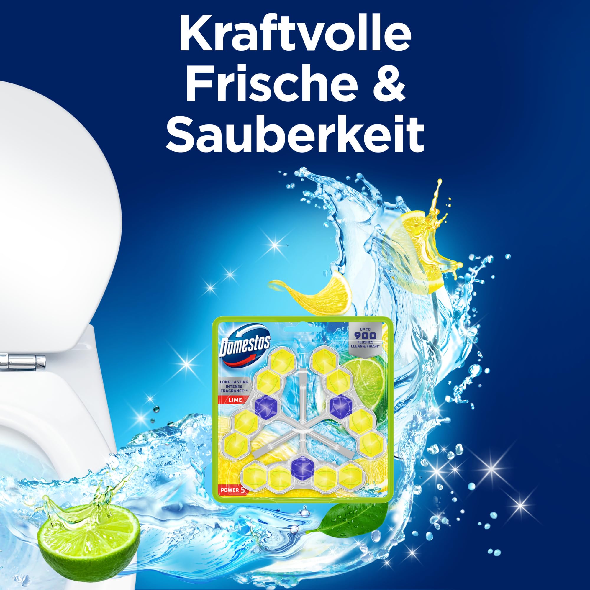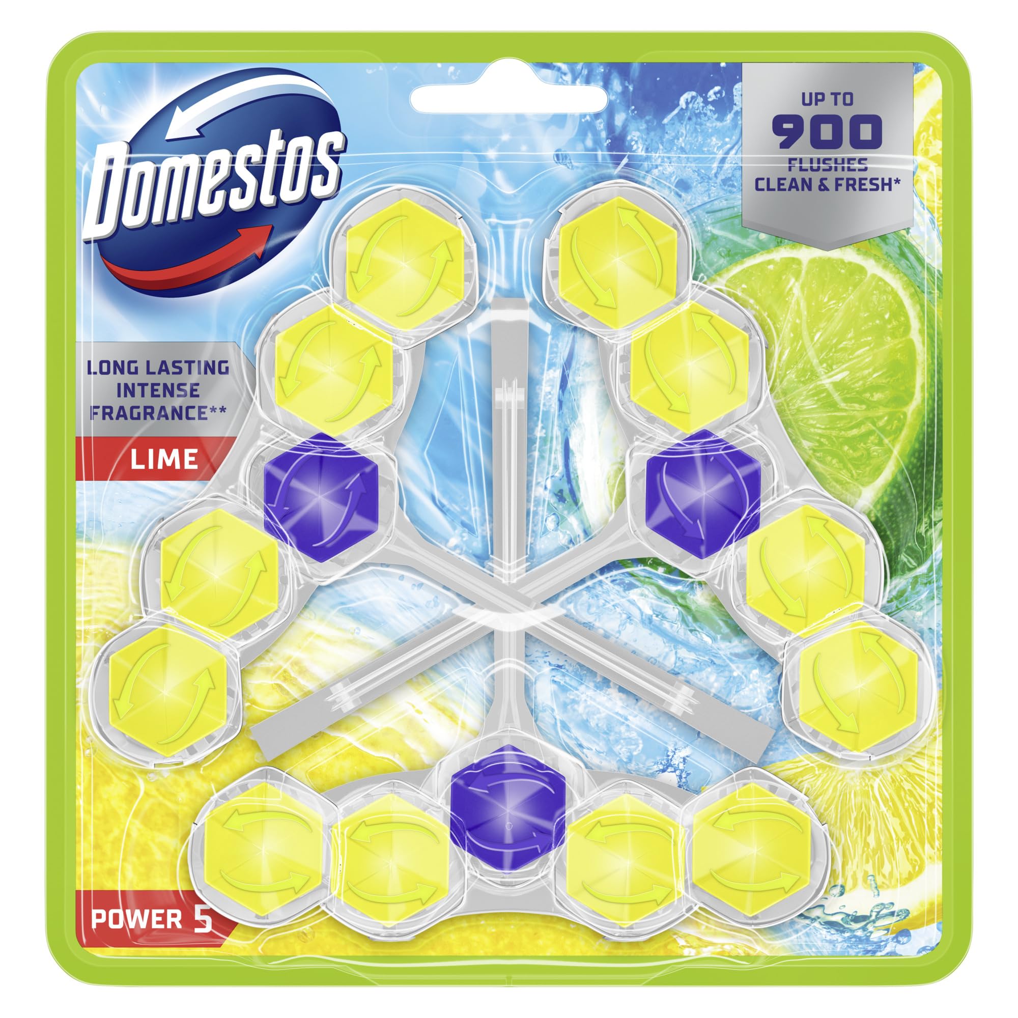 Domestos Power 5 WC Stein Limette WC Reiniger im Vorteilspack volle Power bis zu 900 Spülungen im Trio 3x 50 g
