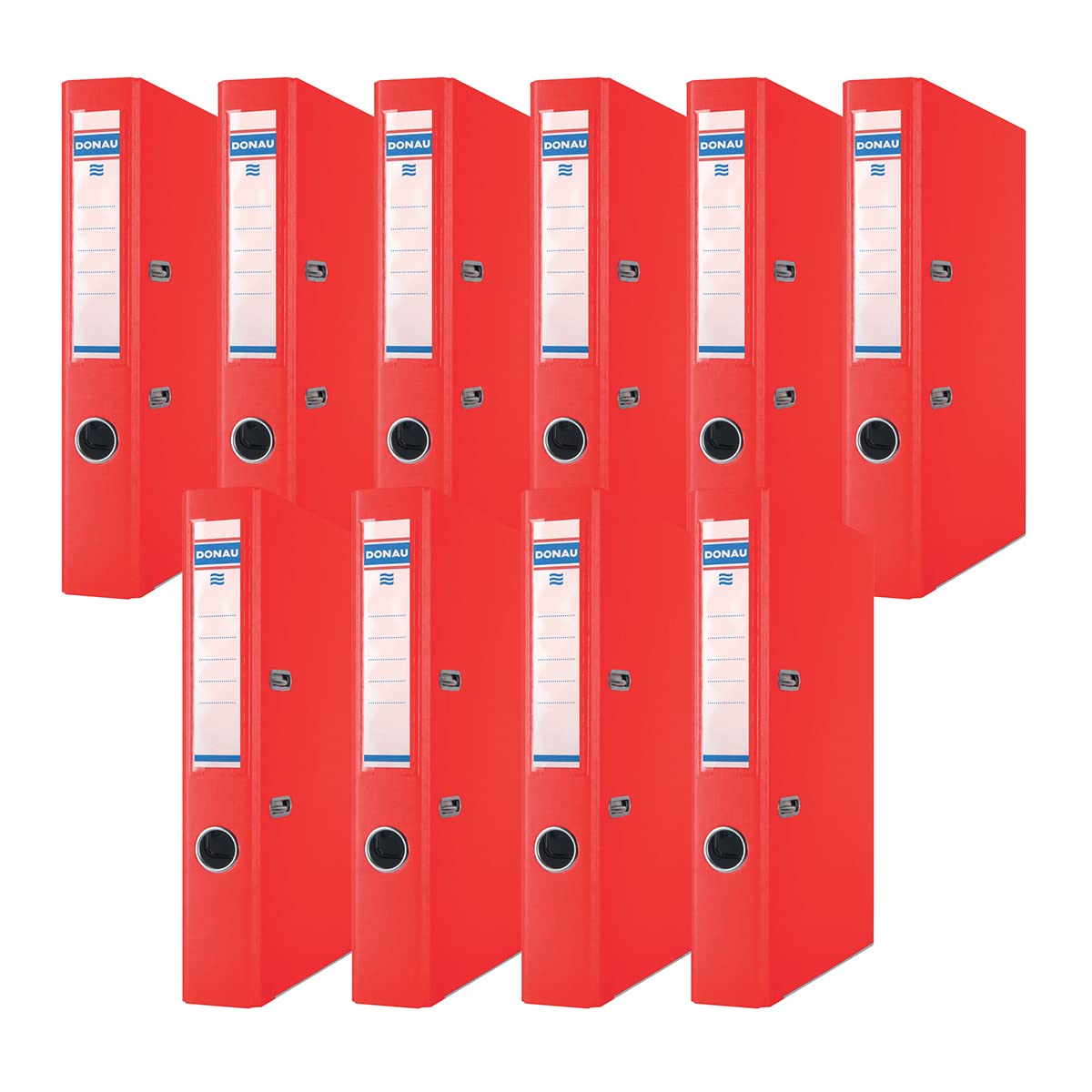 DONAU 3955001PL-04 - Premium Ordner Schmal/ DIN A4 / 5 cm - 50 mm / 10er Pack - 10 Stück. Farbe - Rot Hochwertiger Hebel mit Druckbelastung Austauschbares, doppelseitiges Rückenetikett Verstärktes Fingerloch Hochwertiger Ordner aus 2,1 mm dickem Karton mit einer Grammdichte von 1290 GSM, ausgestattet mit einem unteren Verstärkungsband - A4/ 50mm Ordner/ Büroordner/ Briefordner/ Rückenbreite: 50 mm, Masse: 50 x 320 x 285 mm, Farbe: Rot Mit dem Grünen Punkt versehen - Teilnahme am Recycling- und Verwertungssystem, das sich aus den Bestimmungen des polnischen und EU-Rechts ergibt Beidseitig beschichtet mit ökologischer Polypropylenfolie (100 µm)/ Kunststoffbezug PP/Papier mit der Struktur eines Leinentuchs