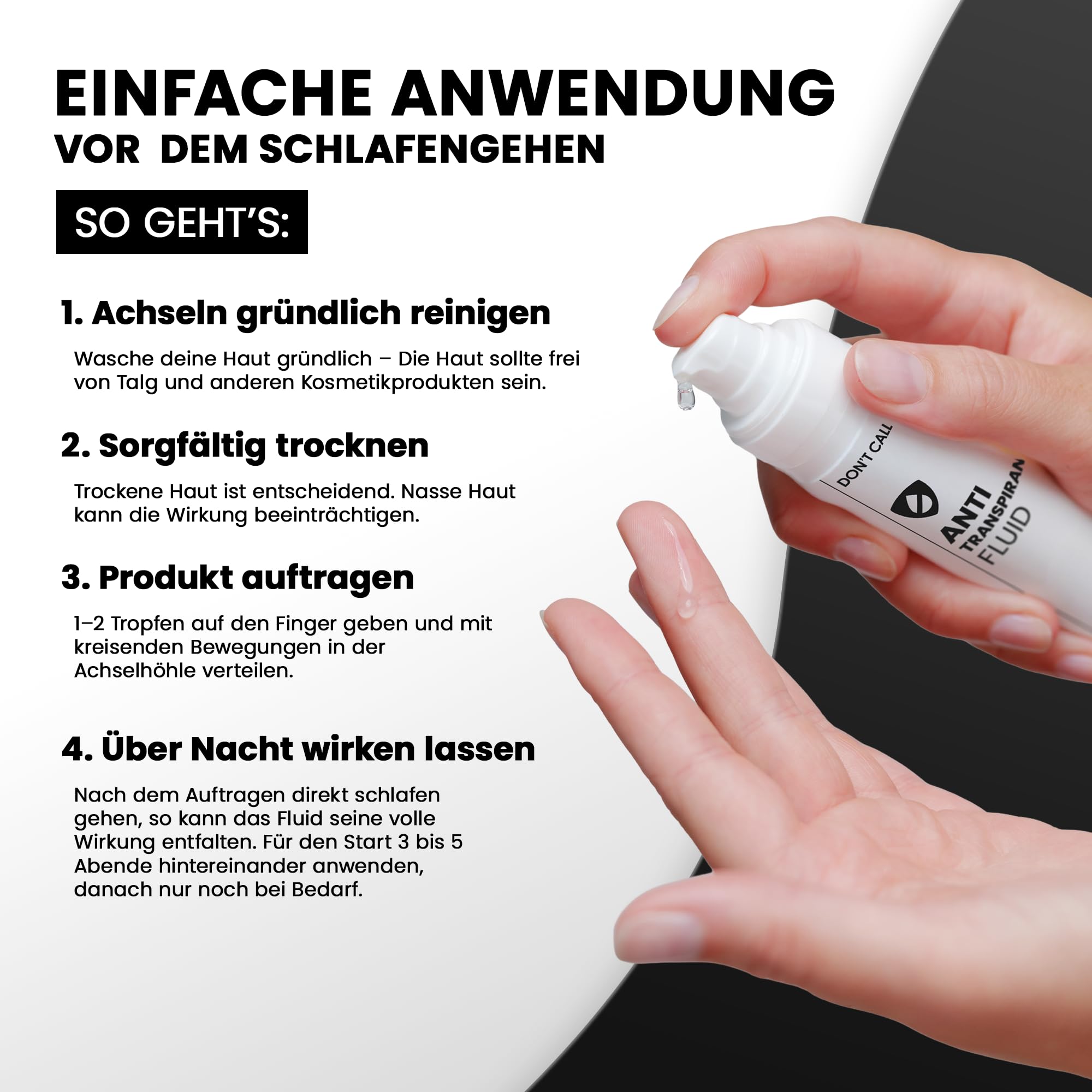 • Ergiebiges Fluid mit einfacher Anwendung bereits ein Tropfen kann genuegen, duenn auftragen und einziehen lassen, geeignet auch bei Hitzewallungen und Nachtschweiss.
