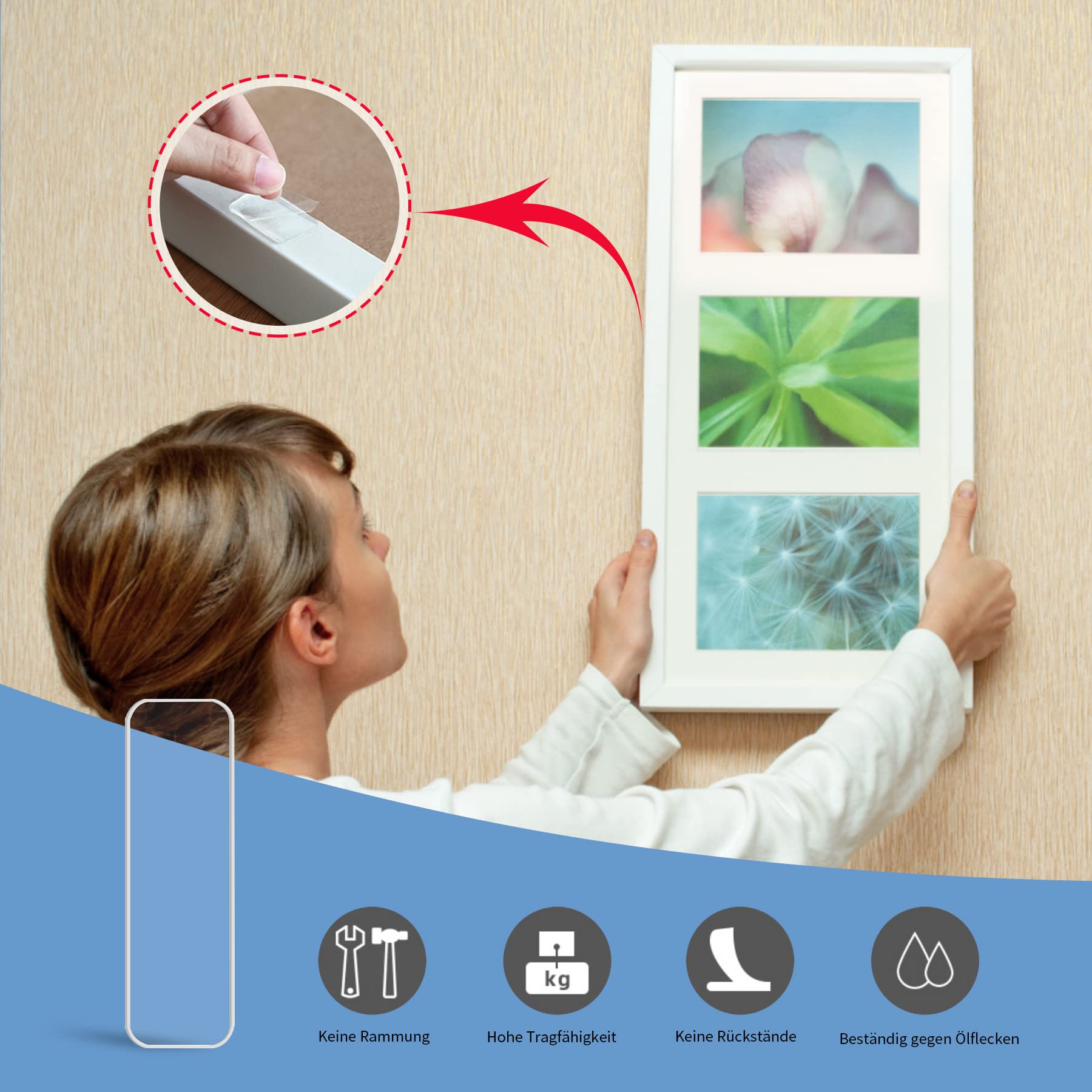 Dieses ausgezeichnete doppelseitige Klebeband ist ein innovatives, umweltfreundliches Klebeband aus Nanomaterialien mit hervorragender Haftung, das recycelbar und für den Menschen unschädlich ist. .Das doppelseitige Klebeband besteht aus nano-ökologischen, ungiftigen, rutschfesten, superhaftenden und nicht rückverfolgbaren Materialien, die sich leicht mit Wasser zersetzen lassen.Sie können es auch an Ihre Bedürfnisse anpassen. Es kann leicht auf jede gewünschte Grösse oder Länge zugeschnitten werden. Sie müssen das Band nur auf die Oberfläche des Gegenstands kleben.Dieser doppelseitige Kleber haftet auf fast allen glatten Oberflächen, so dass Sie alles überall anbringen können. Sie können damit Bilder, Fotos, Rahmen, Wandsticker, Poster und andere Gegenstände, Haken, Regale, Handyhalter, Teppiche, Blumentöpfe, Hüte, Dekorationen, Bastelarbeiten und vieles mehr kleben oder einfügen.Im Vergleich zu herkömmlichem Klebeband, das nur einmal verwendet werden kann, kann unser nicht markierendes Klebeband mehrfach verwendet werden. Wenn das durchsichtige doppelseitige Klebeband verschmutzt ist, waschen Sie es mit warmem Wasser ab und lassen Sie es trocknen, damit es wieder haftet. Dann verwenden Sie es erneut. Hinweis: Verwenden Sie keine anderen Tücher oder Reinigungsmittel.