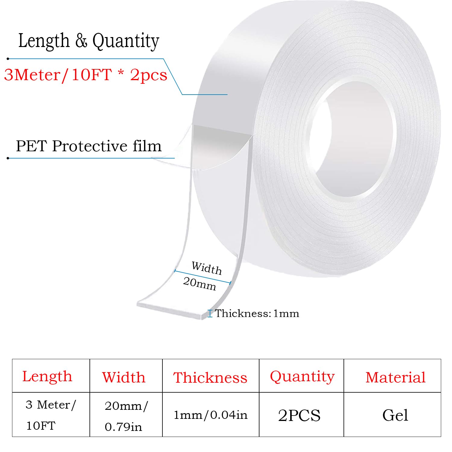 Warum Nano-Tape verwenden?1: Unser doppelseitiges Klebeband besteht aus recycelbarem und umweltfreundlichem Nano-PU-Gelpad, das ungiftig und harmlos ist;2: Es besteht eine starke Haftung. Es erfüllt Ihre Anforderungen an hängende Gegenstände, muss die Wand nicht mehr beschädigen, Sie können Gegenstände mit einem Gewicht von bis zu 1 kg auf einer glatten Oberfläche platzieren;3: Keine Spur: Nach dem Abreissen bleibt keine Spur an der Wand und beschädigt Ihre Wand;4: Waschbar: Das Band kann nach dem Abreissen direkt mit klarem Wasser gereinigt und nach dem Trocknen direkt wiederverwendet werden;5: Es kann auf einer Vielzahl von Materialoberflächen verwendet werden, aber bitte vermeiden Sie ungeeignete Oberflächen.