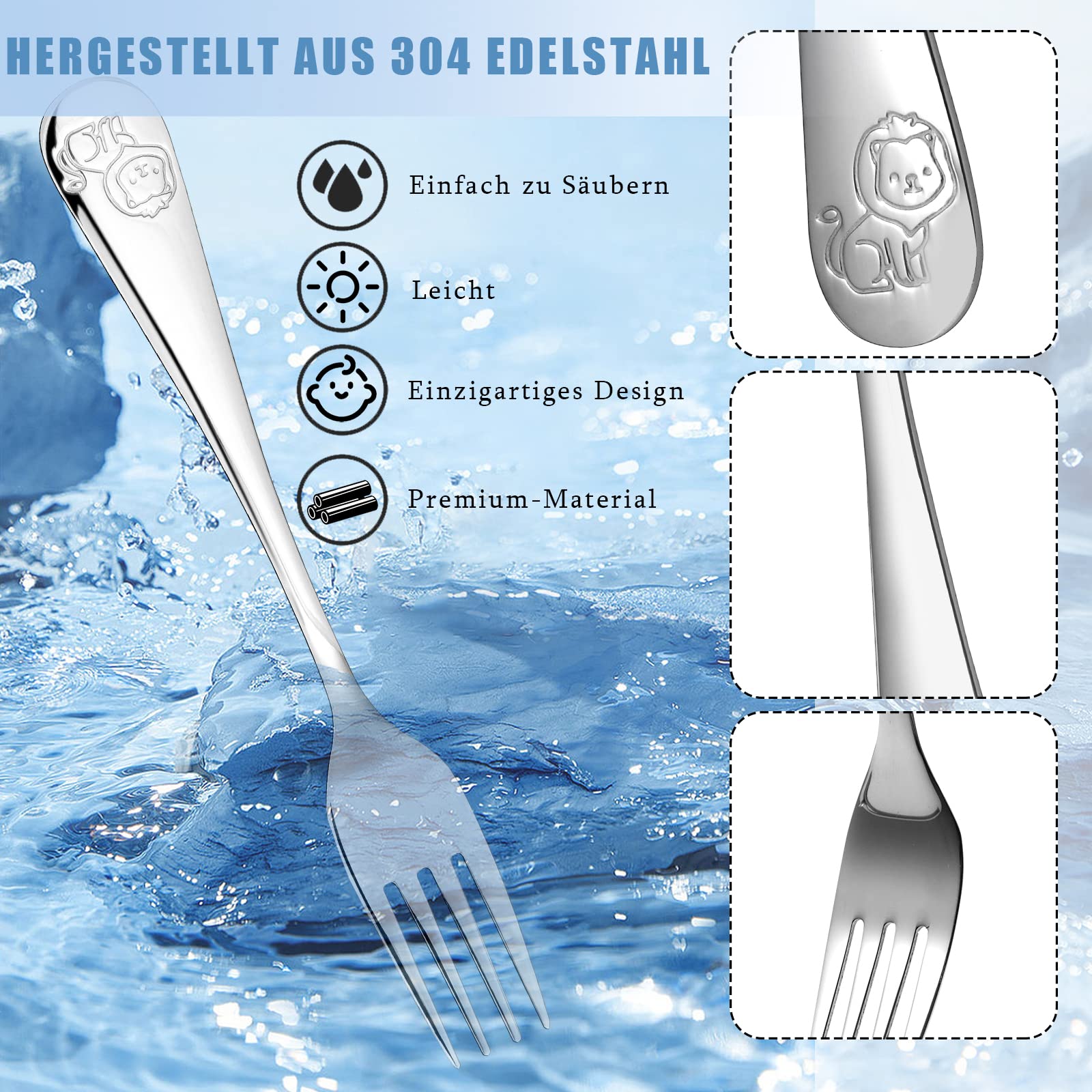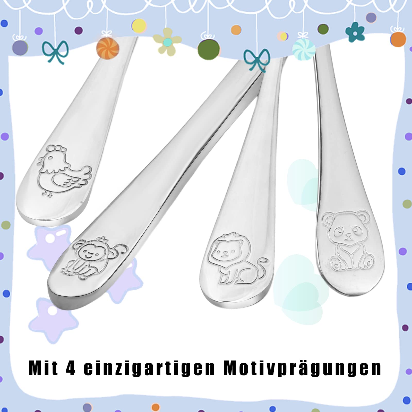 - Inhalt: 4 teiliges Set (1x Kinder-Gabel, 1x kindermesser, 1x Kinder-Löffel, 1x kleiner Löffel)